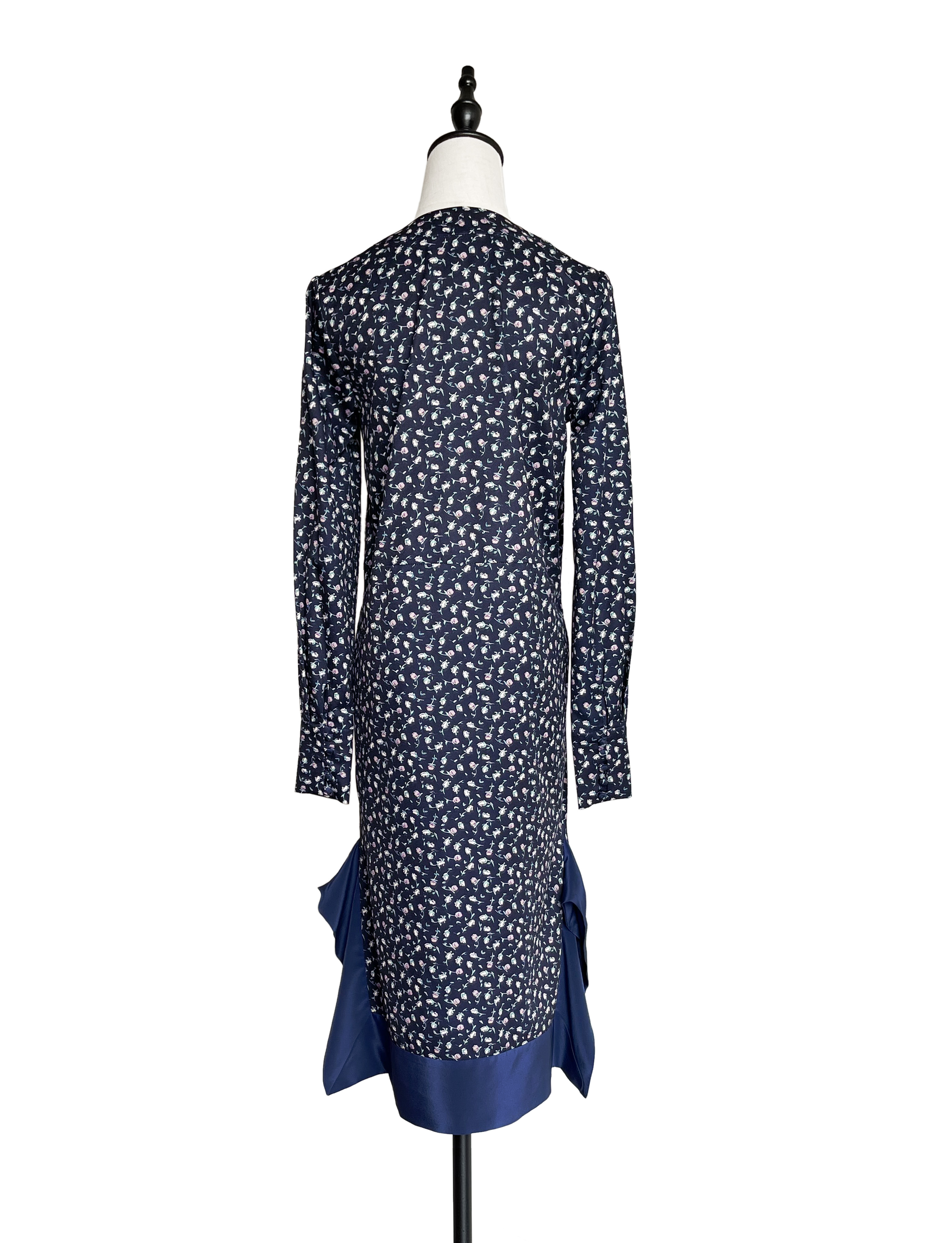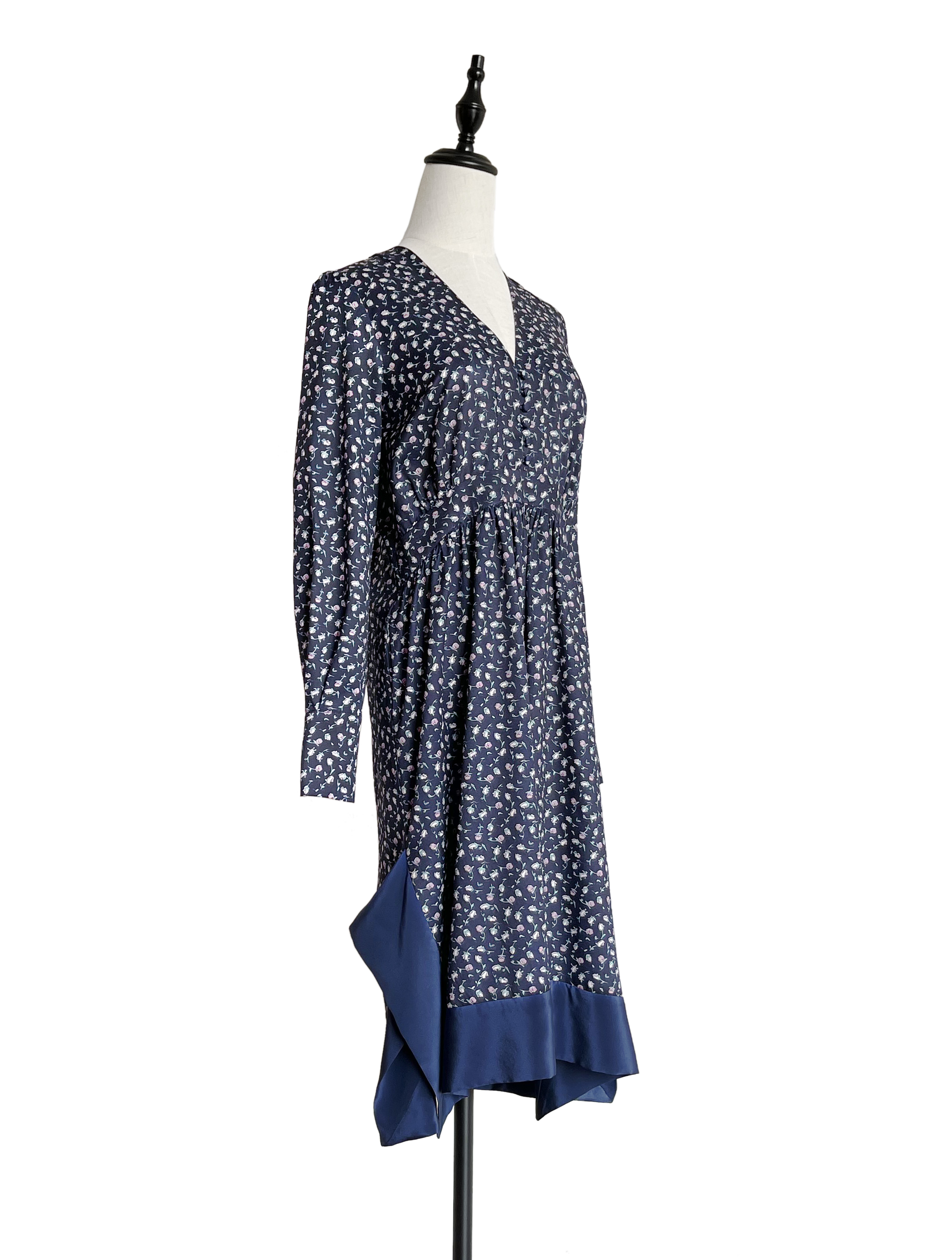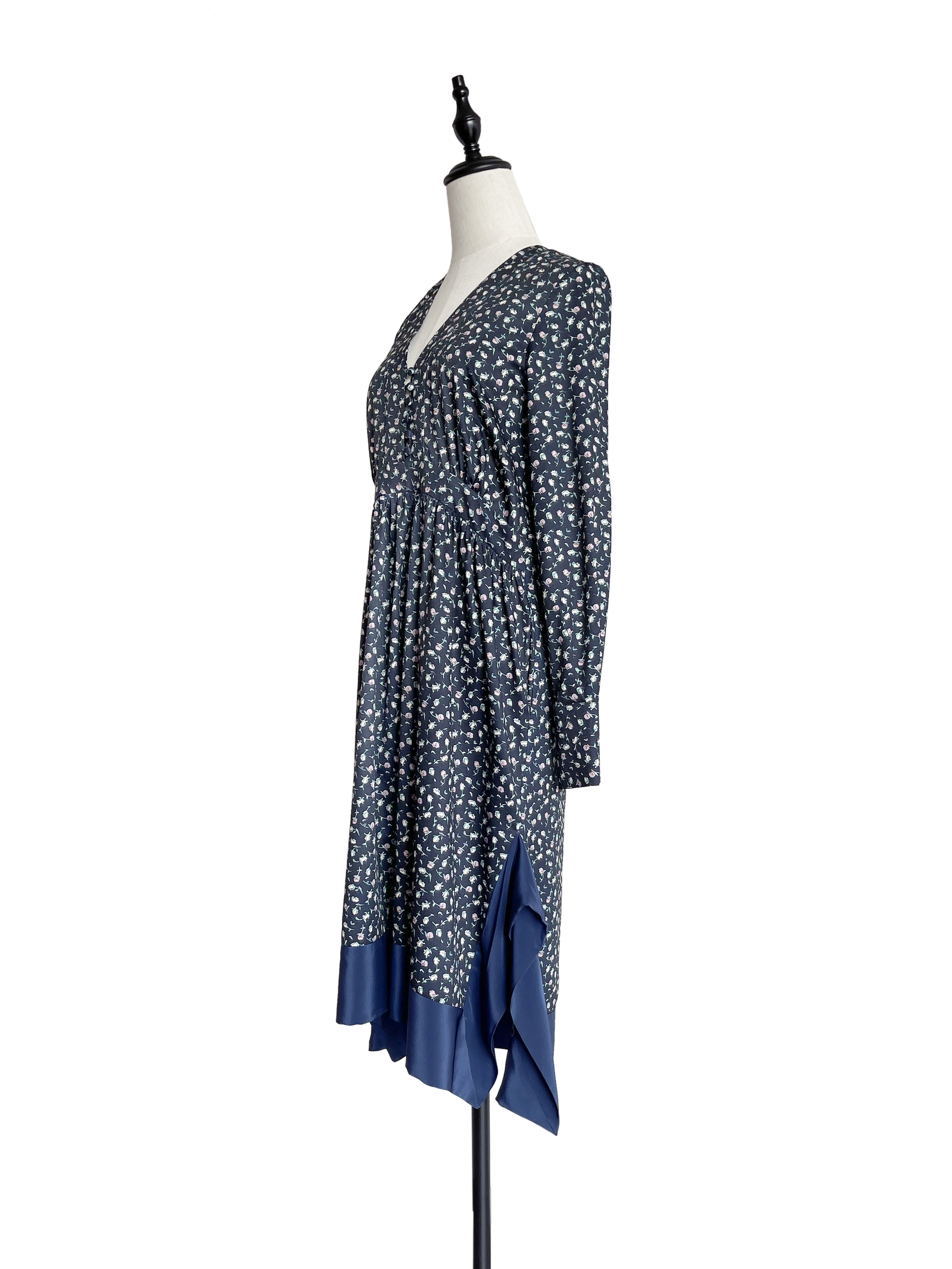 TYNVIE 拼接裙摆V领复古款长袖连衣裙-蓝碎花