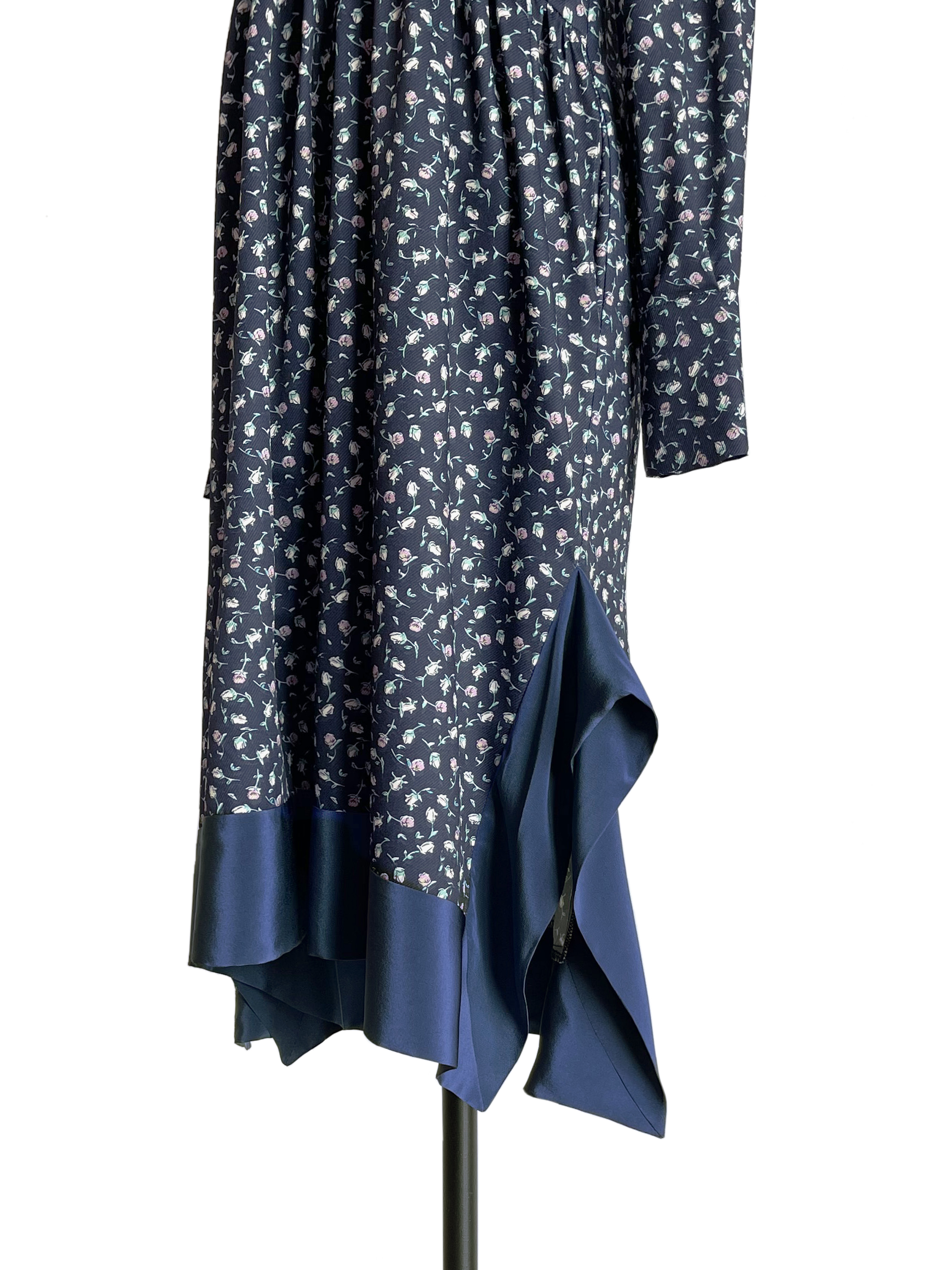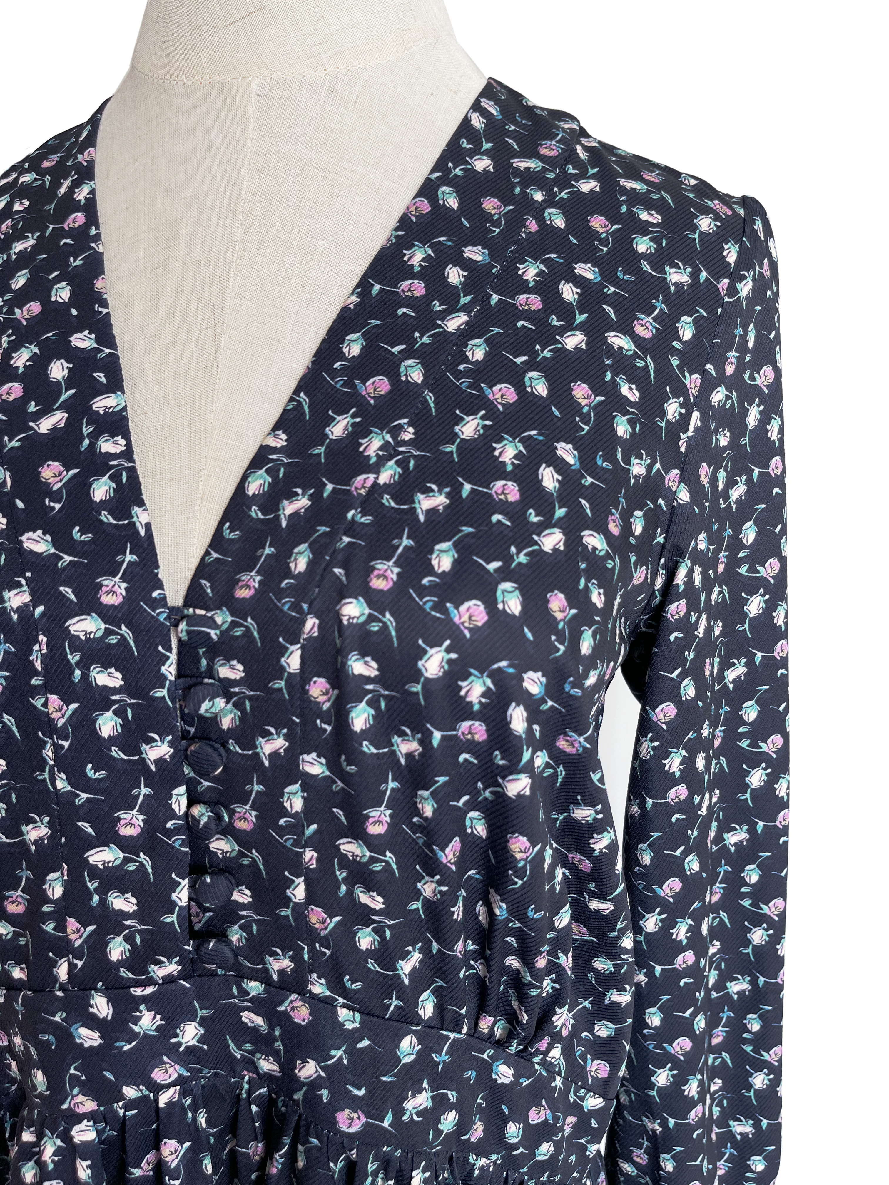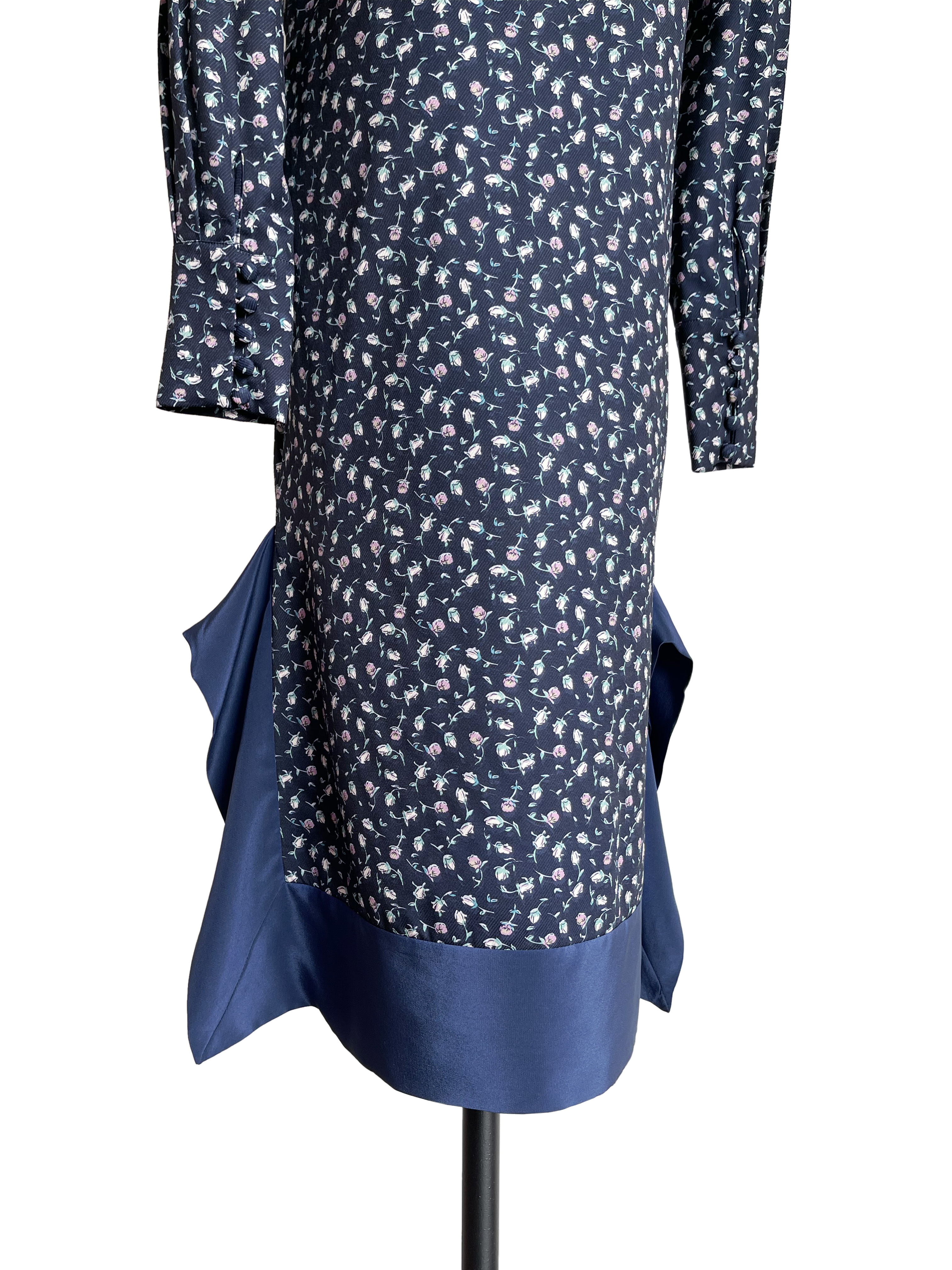 TYNVIE 拼接裙摆V领复古款长袖连衣裙-蓝碎花