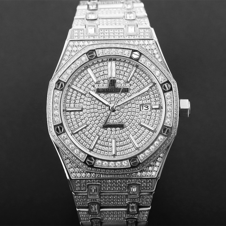 TZ爱彼皇家橡树系列15452男装满天星钻表新款(区别于老款:1、侧面有钻;2、表带镶嵌大颗方钻;3、条丁刻度;4、内置LOGO。),手工镶嵌1000多颗莫桑钻(硬度和光泽与金刚石最相似的硅物质,需用至少10倍的放大镜观察其内含物来辨别),搭载进口9015机芯改原装3120自动机械机芯,走时稳定寿命较长,男装尺寸41mmX10mm(女装37mm开发中),防刮蓝宝石镜面,身份与财富最好的缩影。TZ工厂每一支腕表都赠送香港太子钟表行皮套。