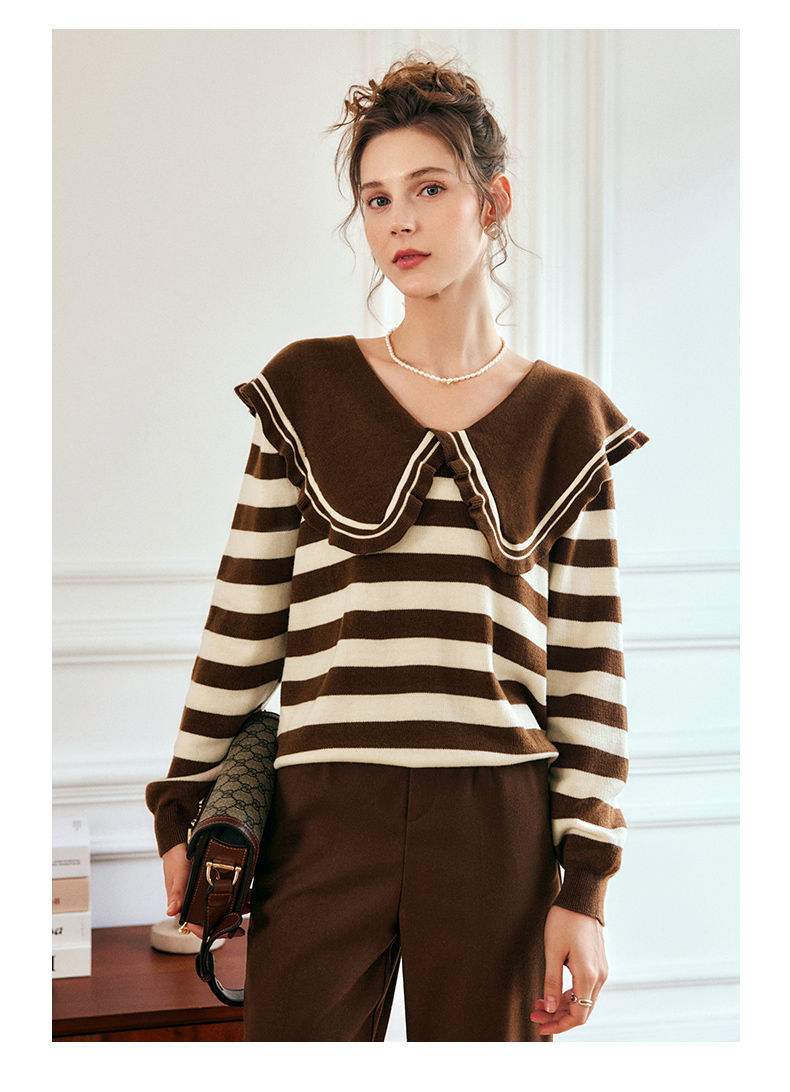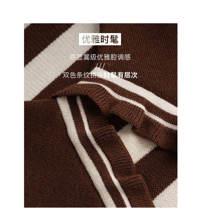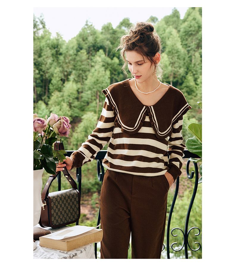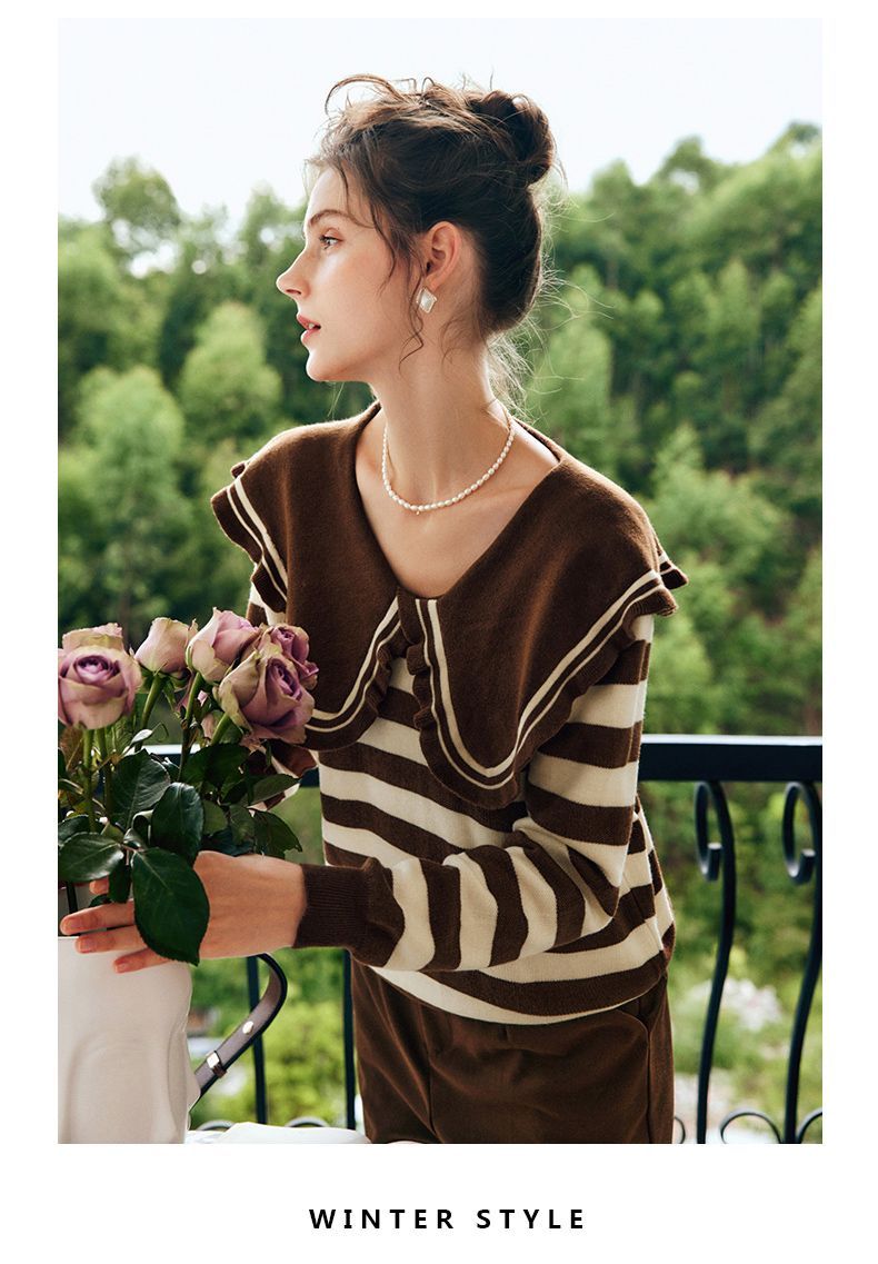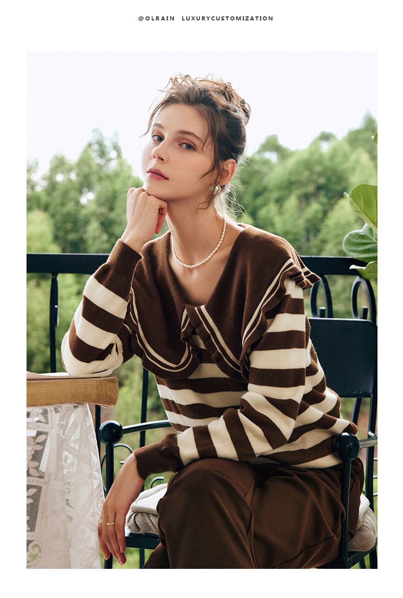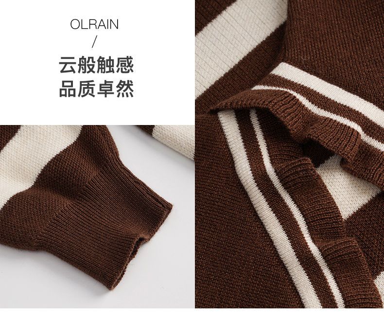 OLrain欧芮儿法式咖色条纹毛衣女秋季2022年新款学院风大翻领上衣