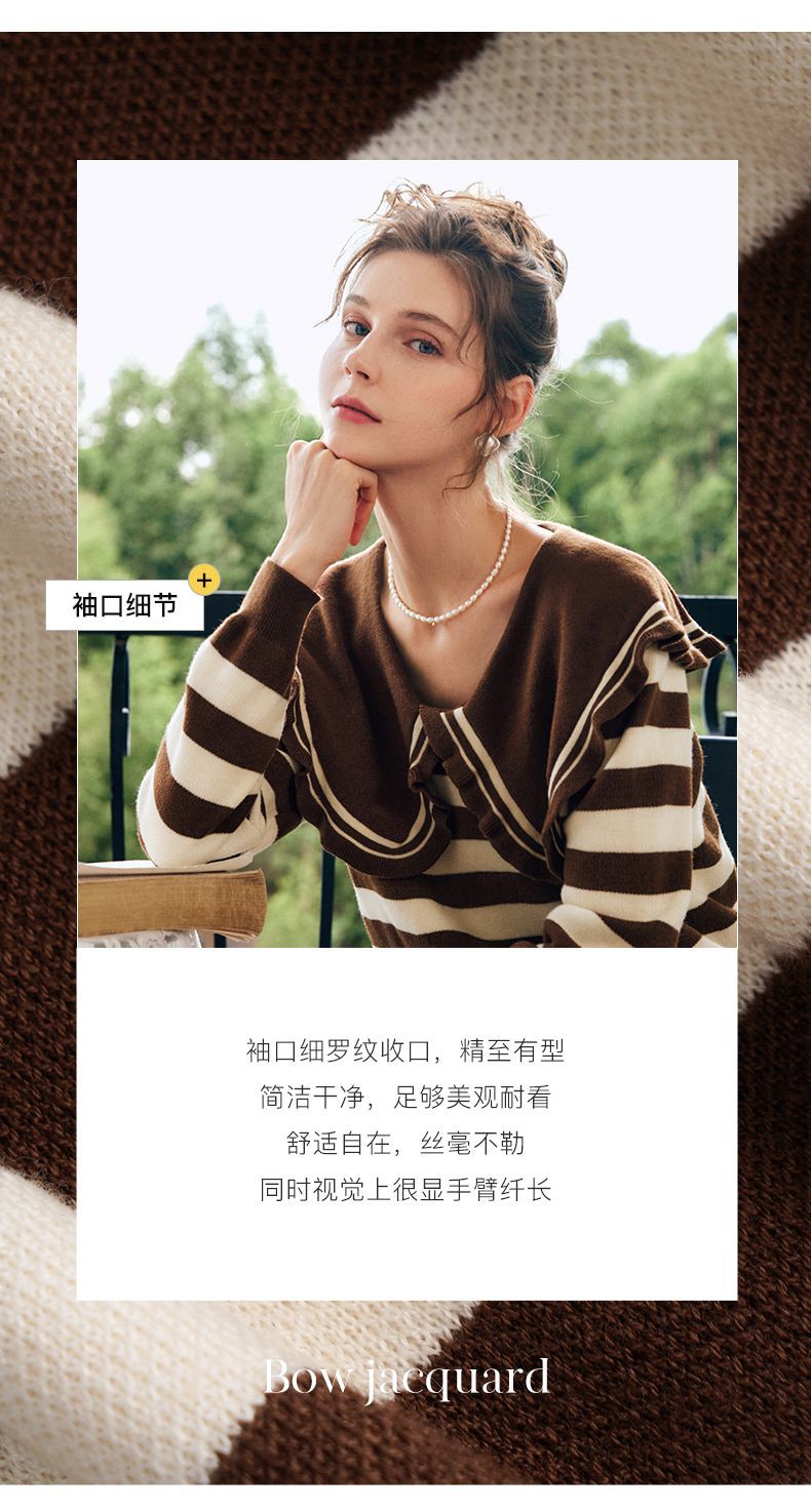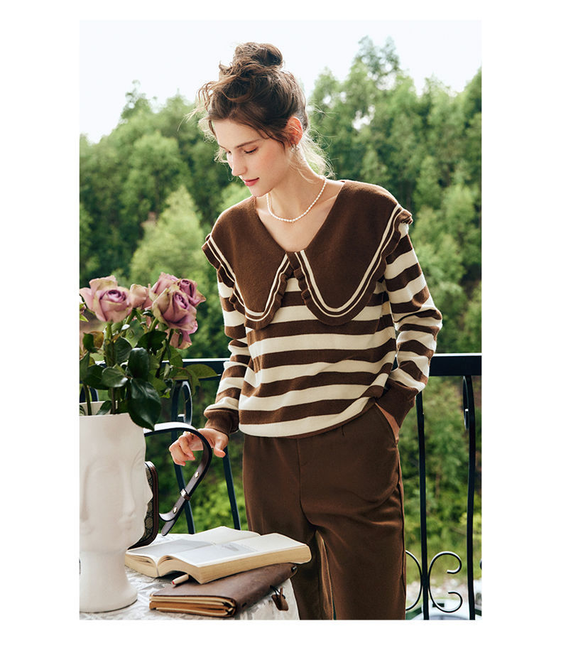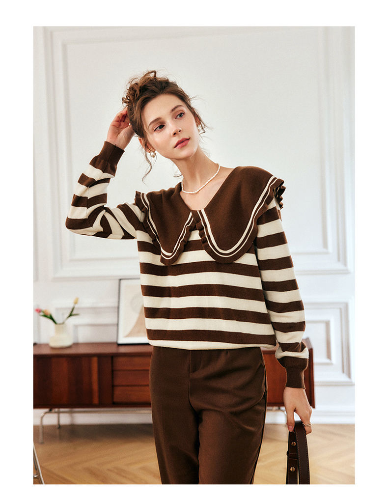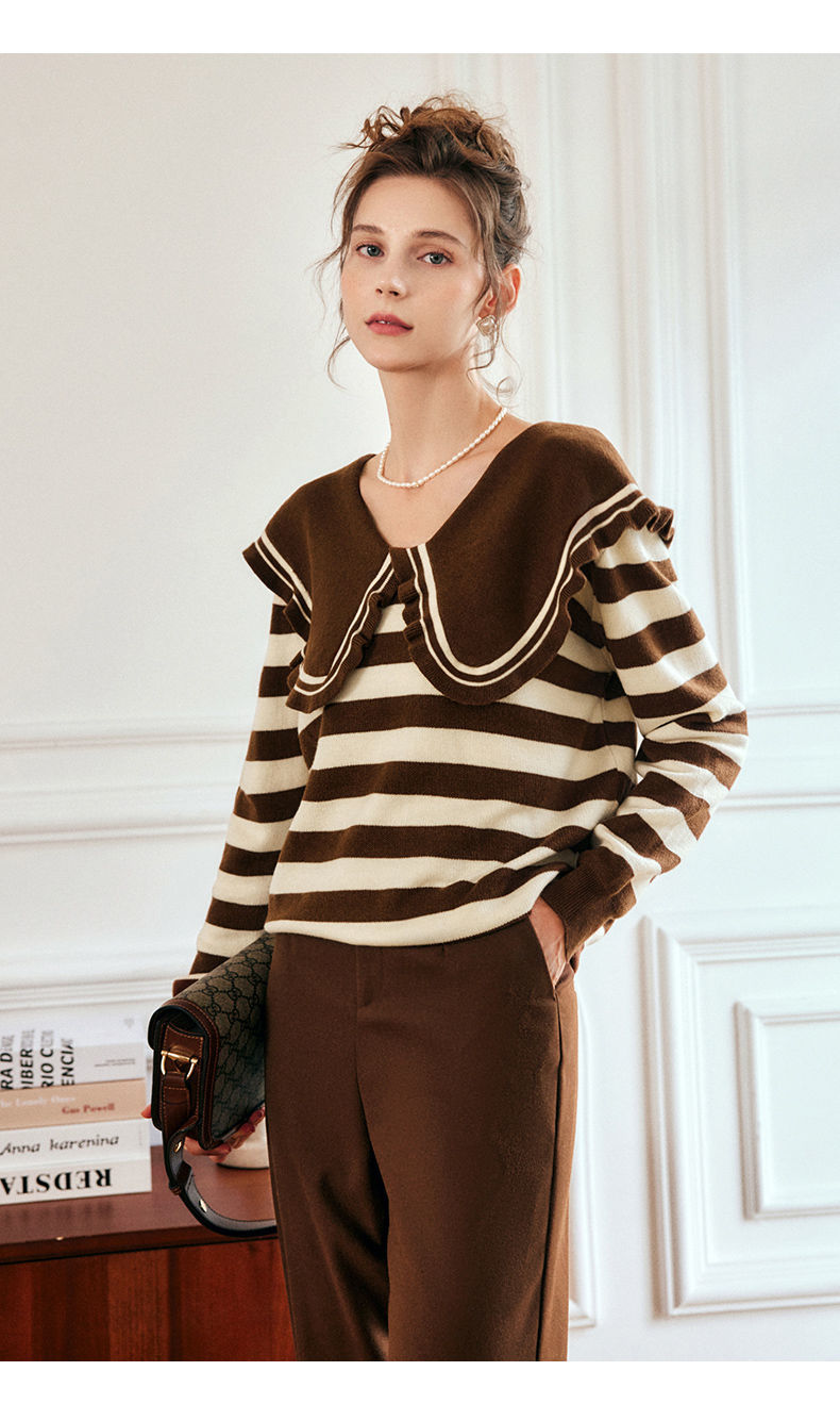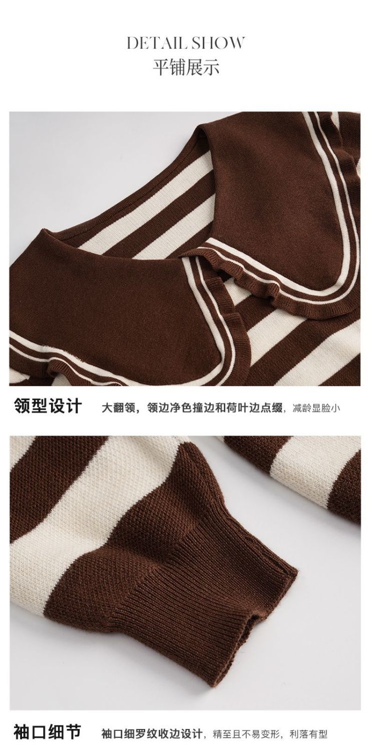 OLrain欧芮儿法式咖色条纹毛衣女秋季2022年新款学院风大翻领上衣