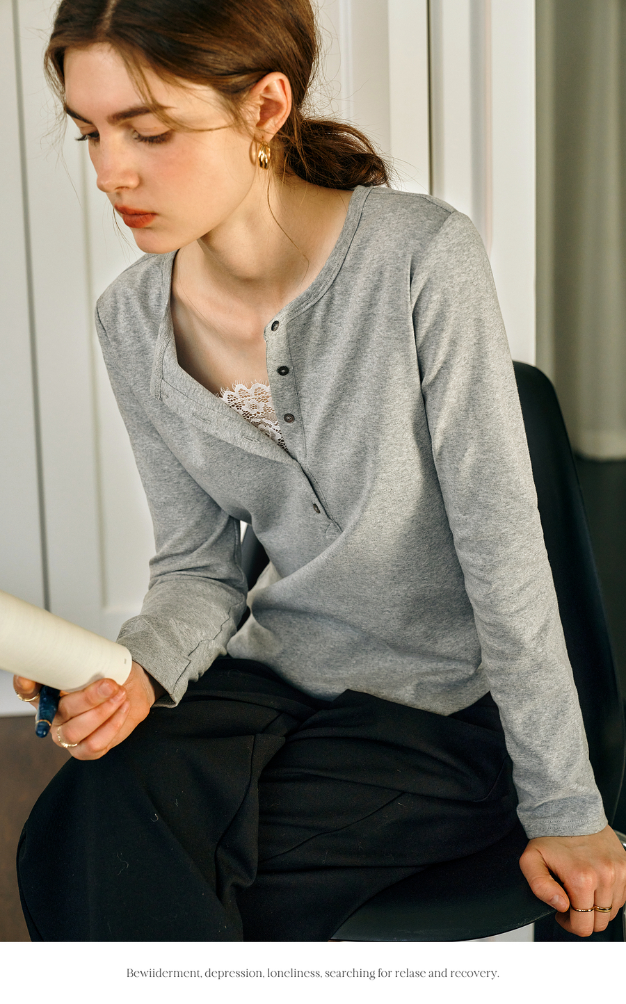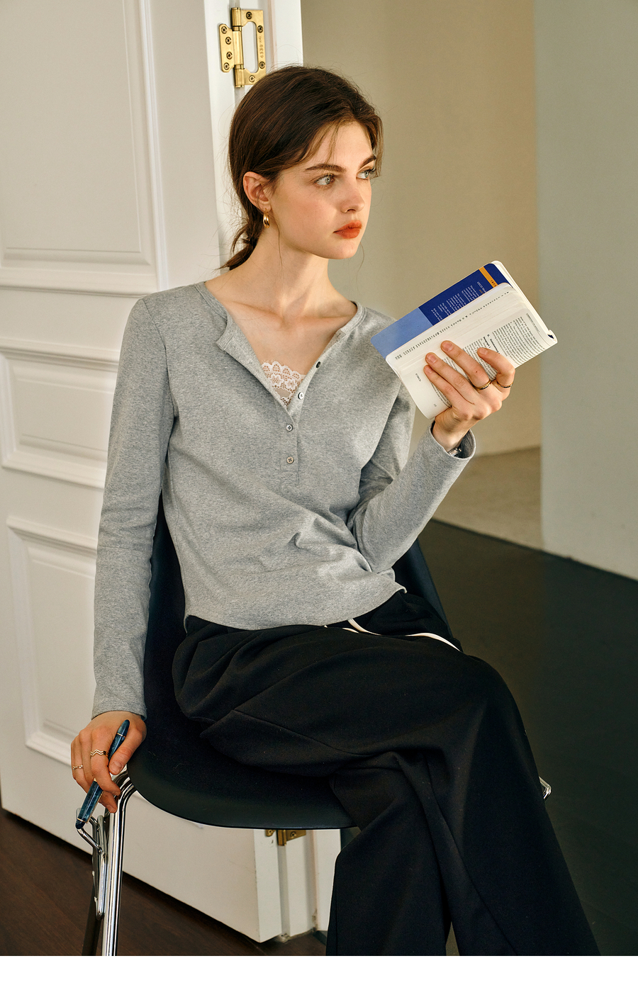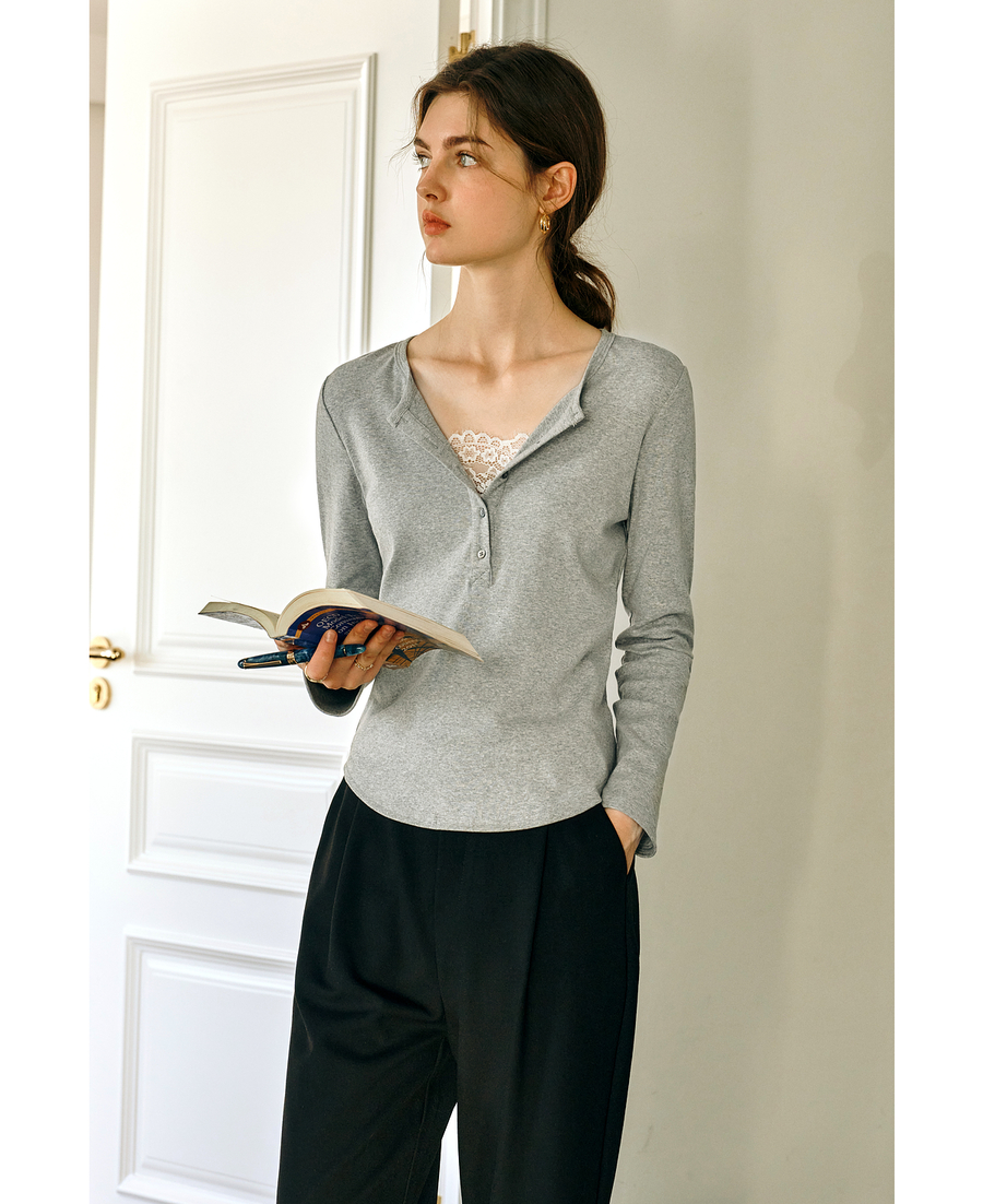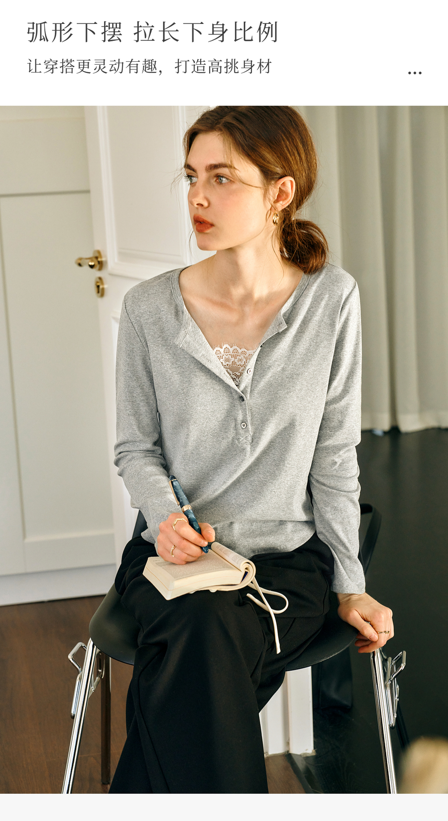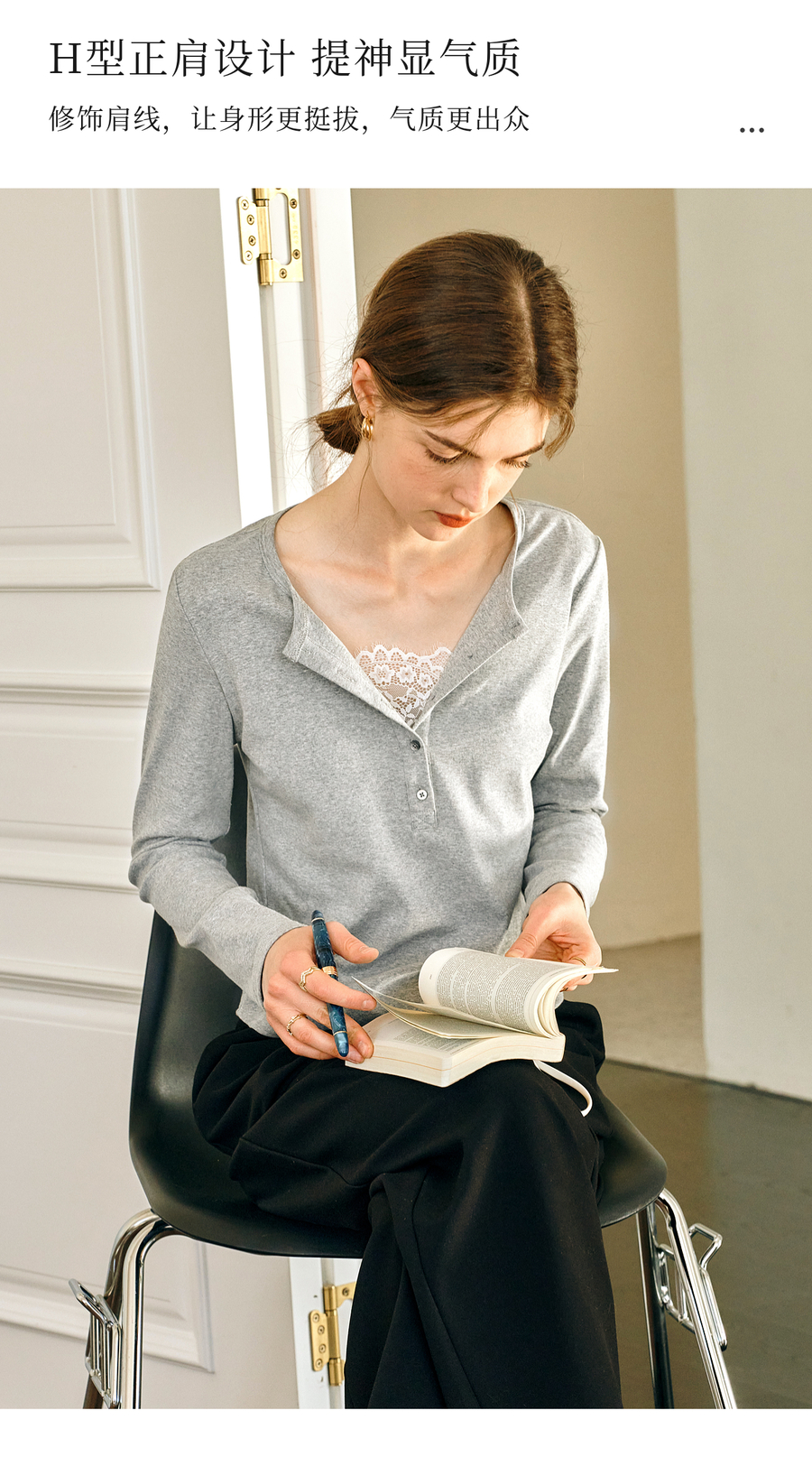 Olrain欧芮儿2025春季新款灰色蕾丝拼接设计简约法式长袖T恤女