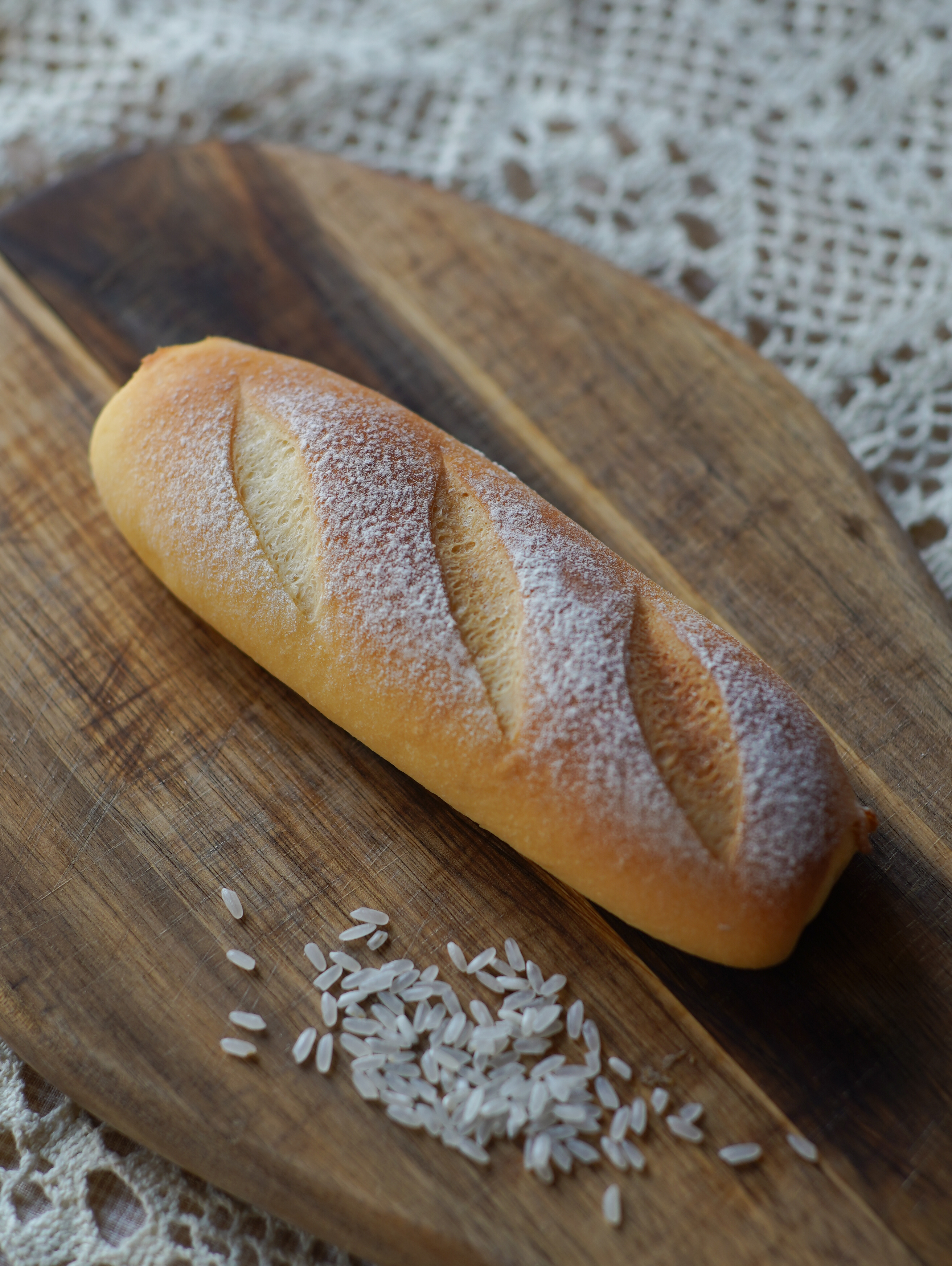 千呼万唤之下,我们做出了这款像从漫画里走出来的米面包。做成法式短棍(Batard)的形状。所以叫它米·棍儿。口感上是有糯糯的,即便配料简单,也没有面粉的那股咬劲。闻起来有米香,吃下去十分清爽。