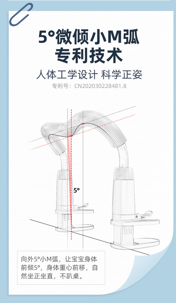 这款是M型框架设计,根据人体工设计、5°微倾,科学矫姿。这样孩子坐着就重心就自然往前移,减少因为重心往后对腰部造成的负担,不易疲累、还锻炼了肌肉持久力!