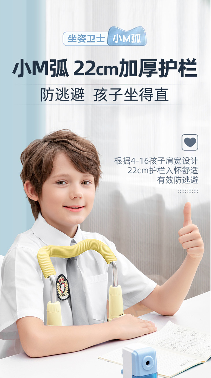 简洁萌趣的外观造型减少孩子心理抵触,真正达到轻松矫姿、自然坐正的目的!时间久了,小朋友都越来越自觉、越来越挺拔了~