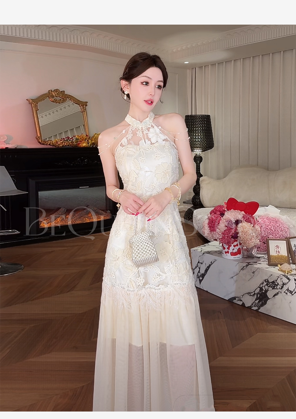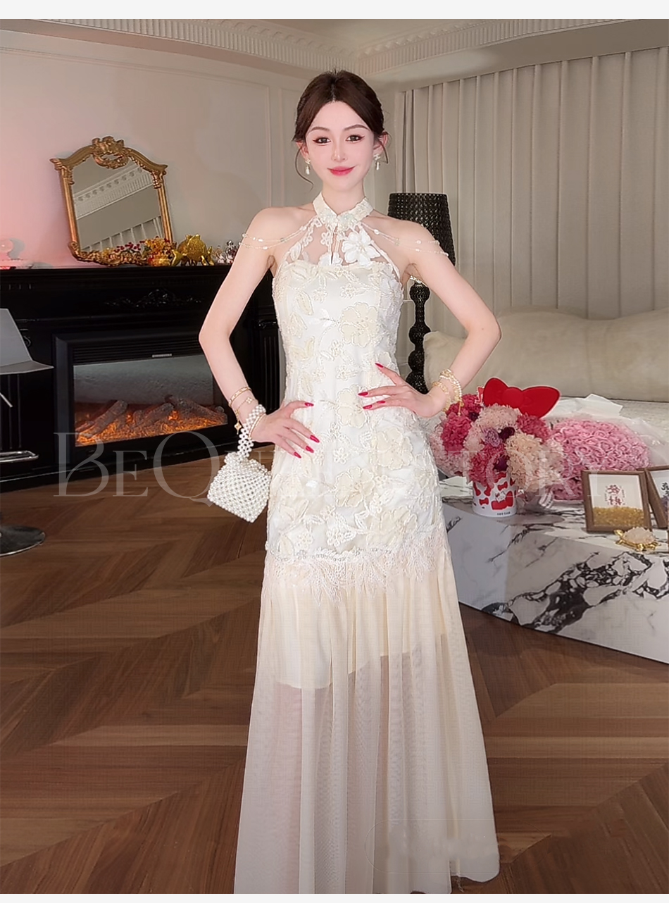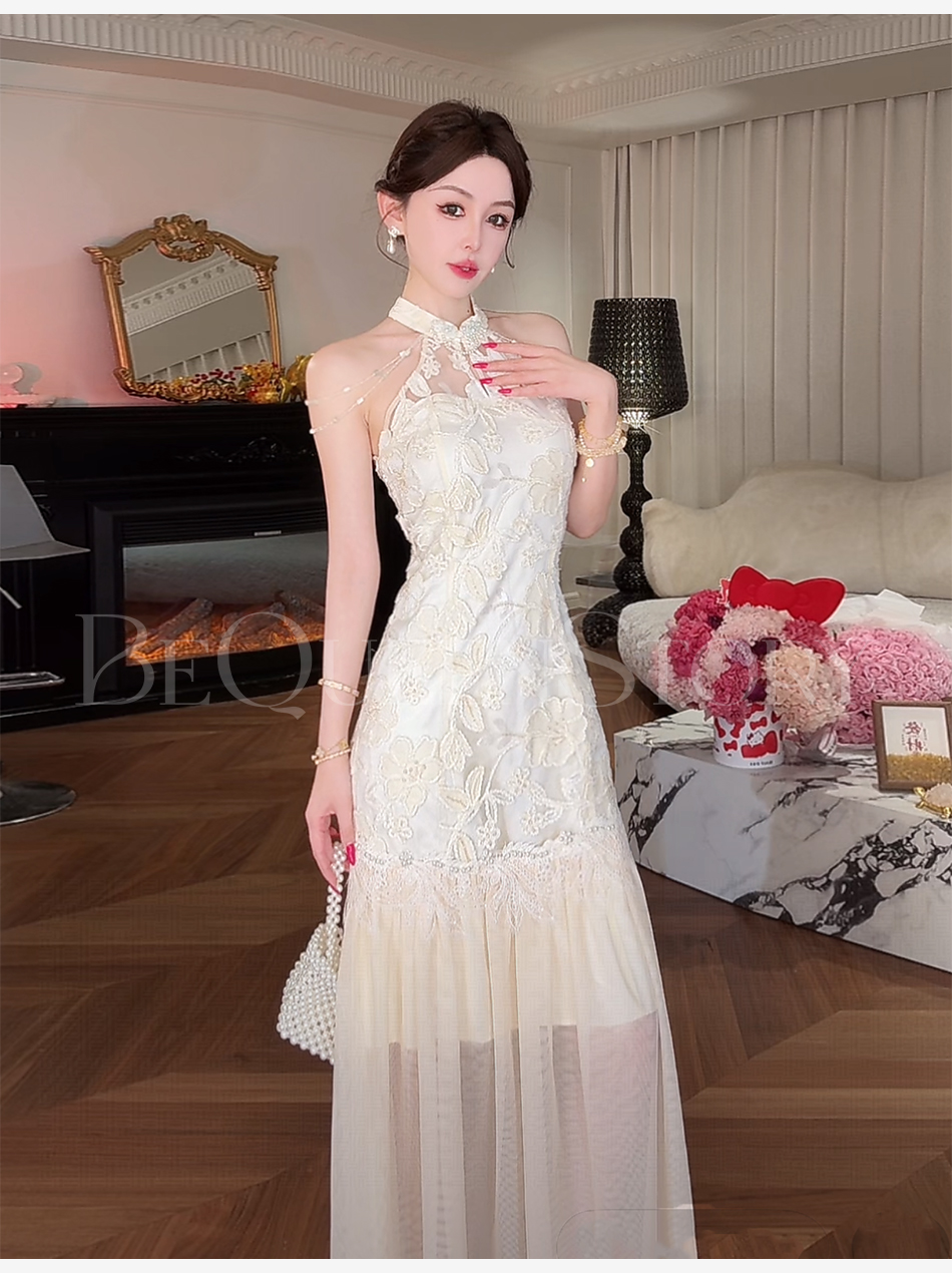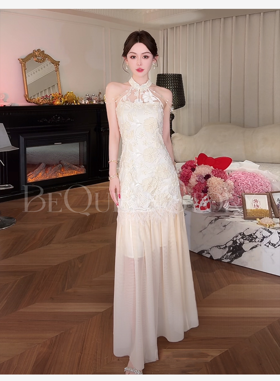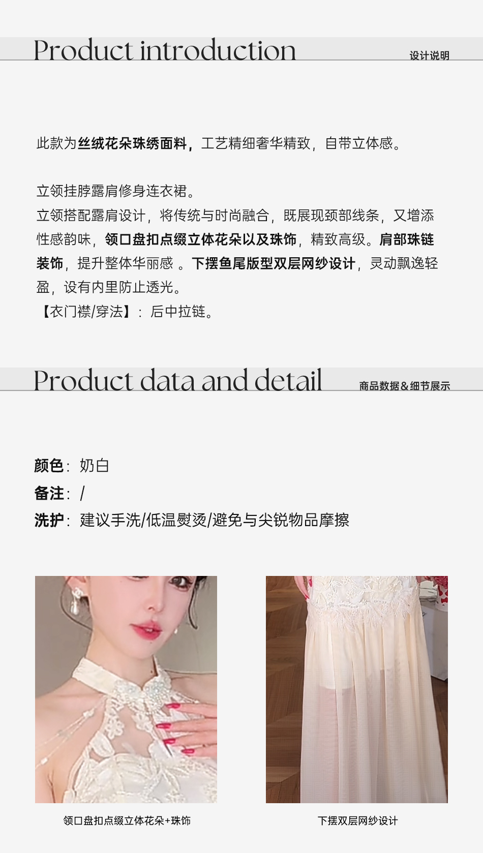 【孤品样衣,不退不换】【夏日舞会】重工精致高级新中式立体花朵挂脖露肩旗袍