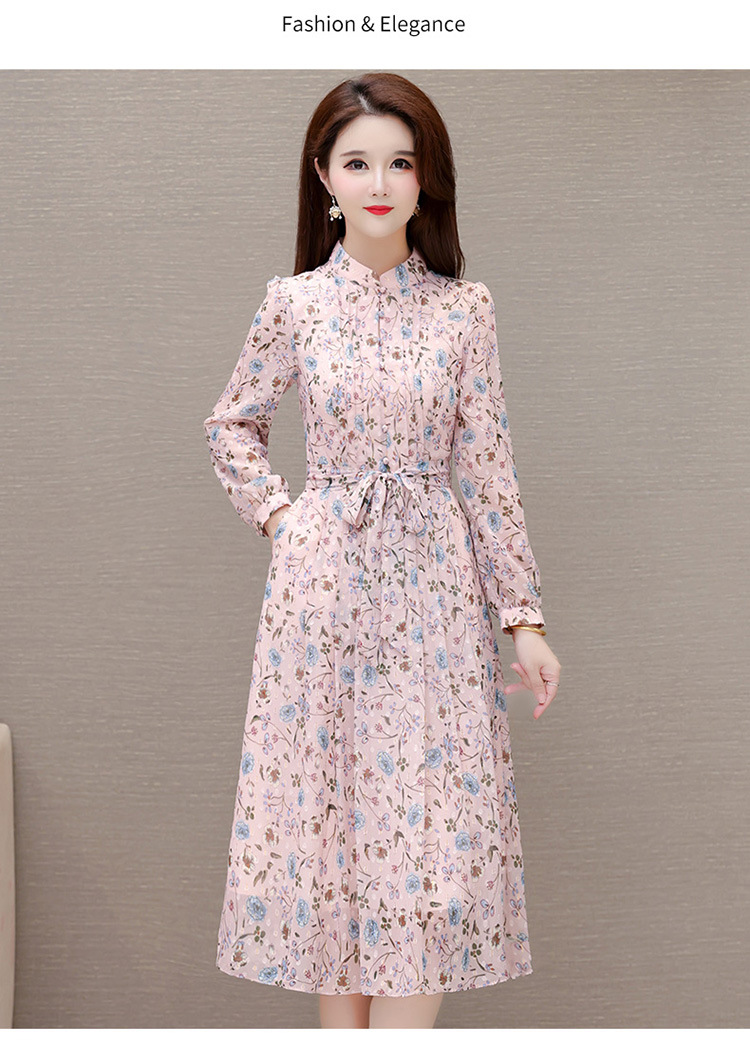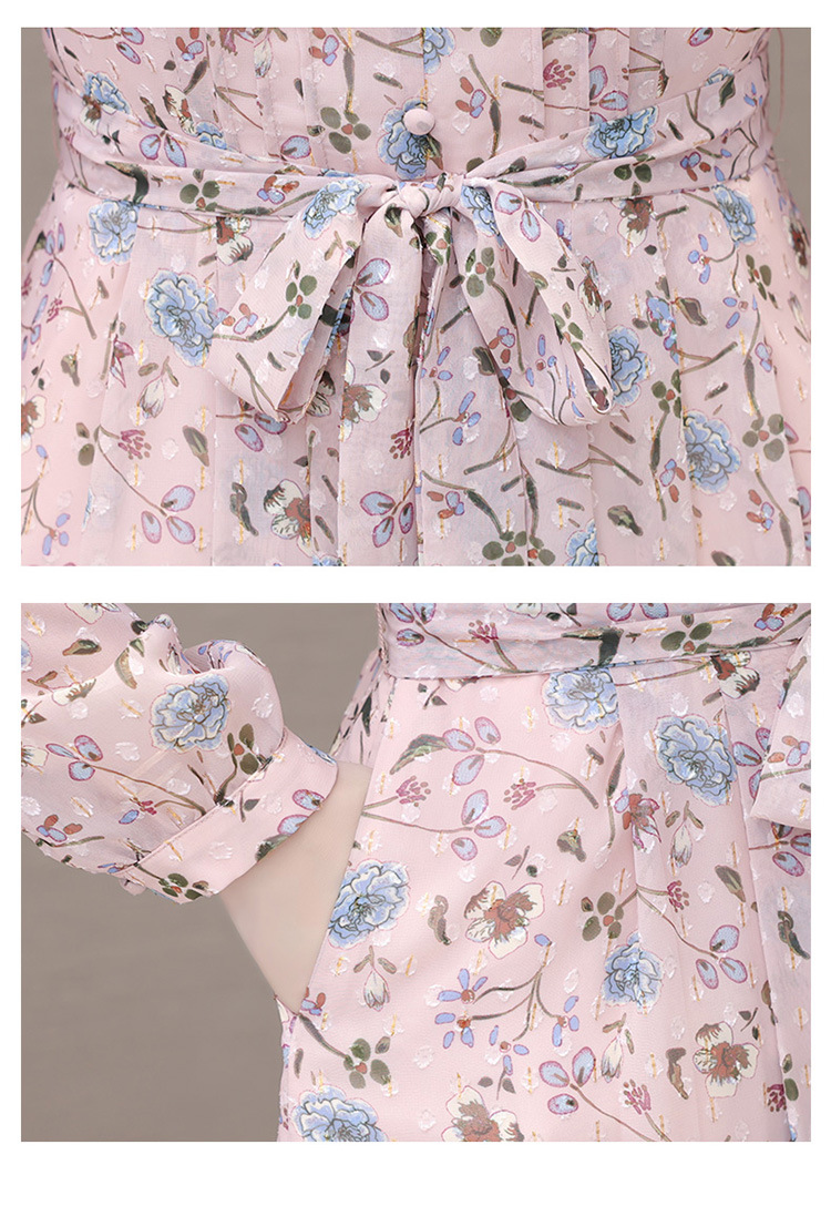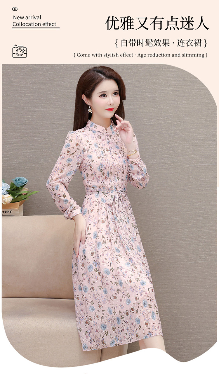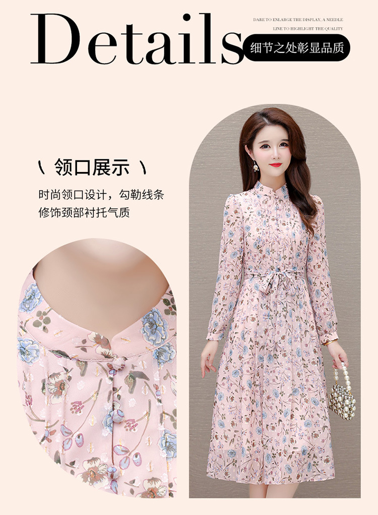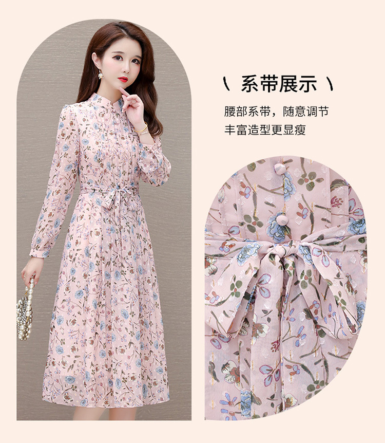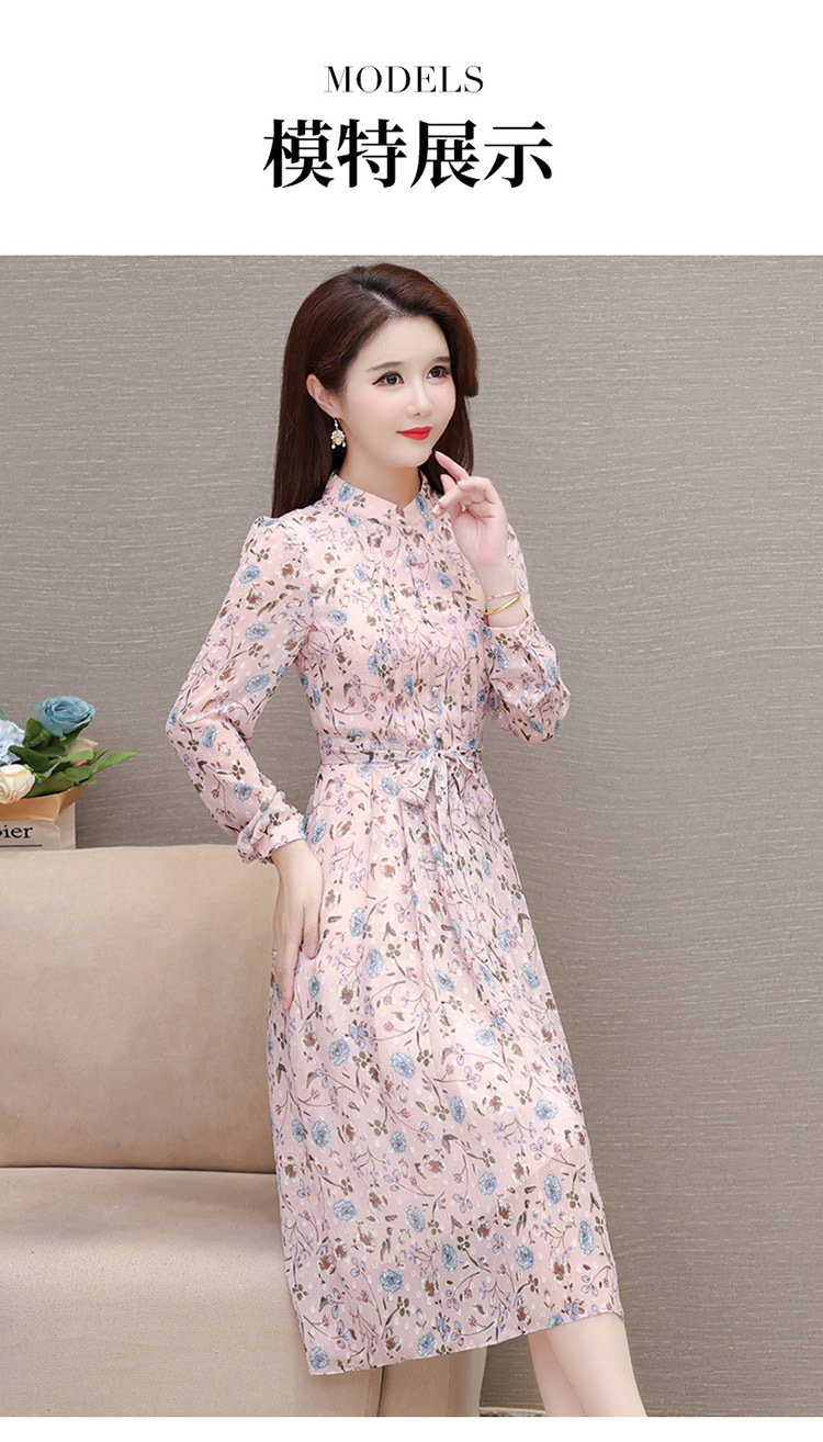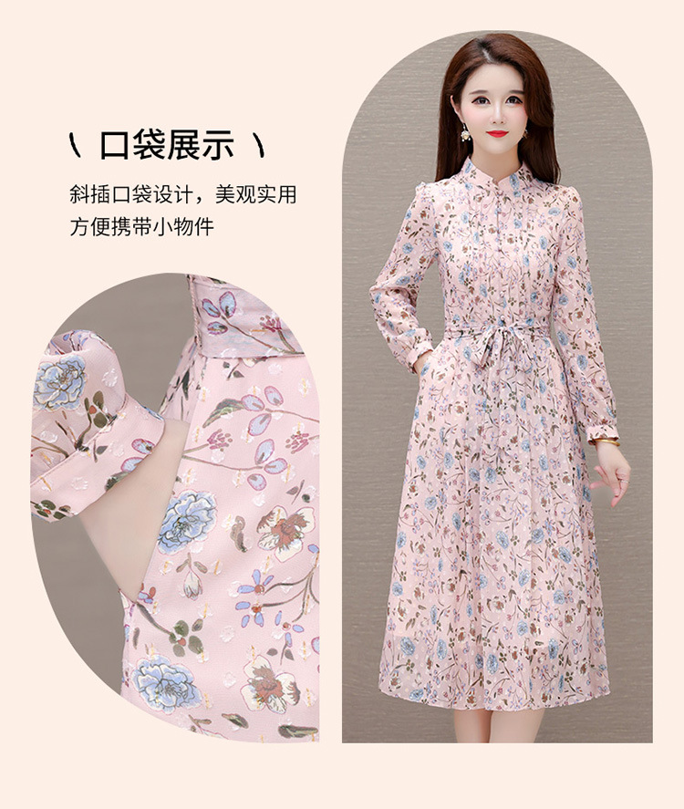 系带收腰印花连衣裙,百褶裙中长款长袖优雅A字裙QYM-HL-24A6618-Y