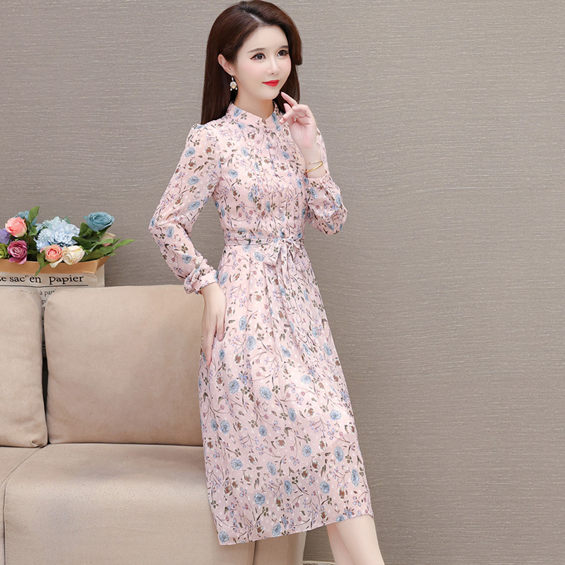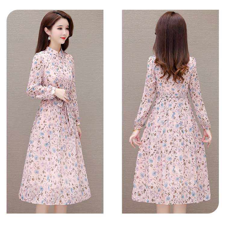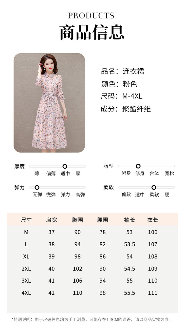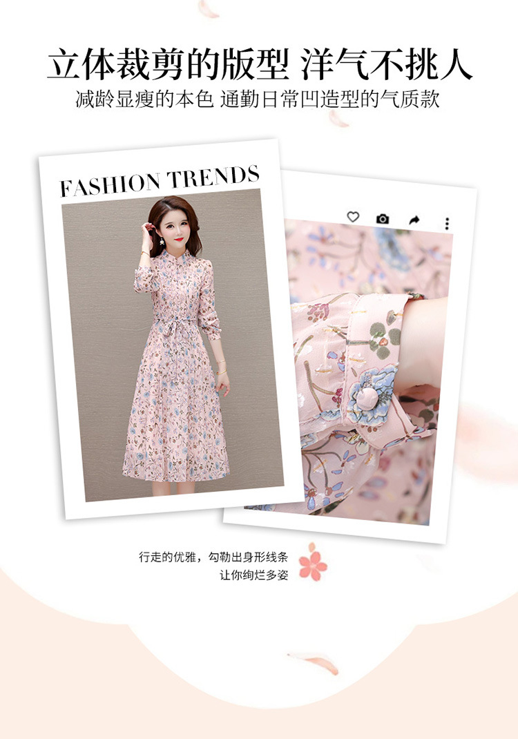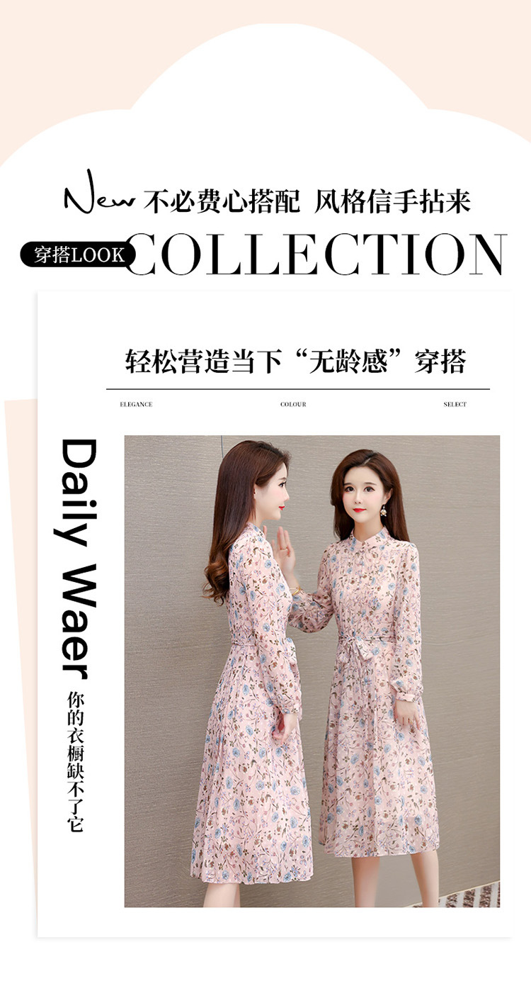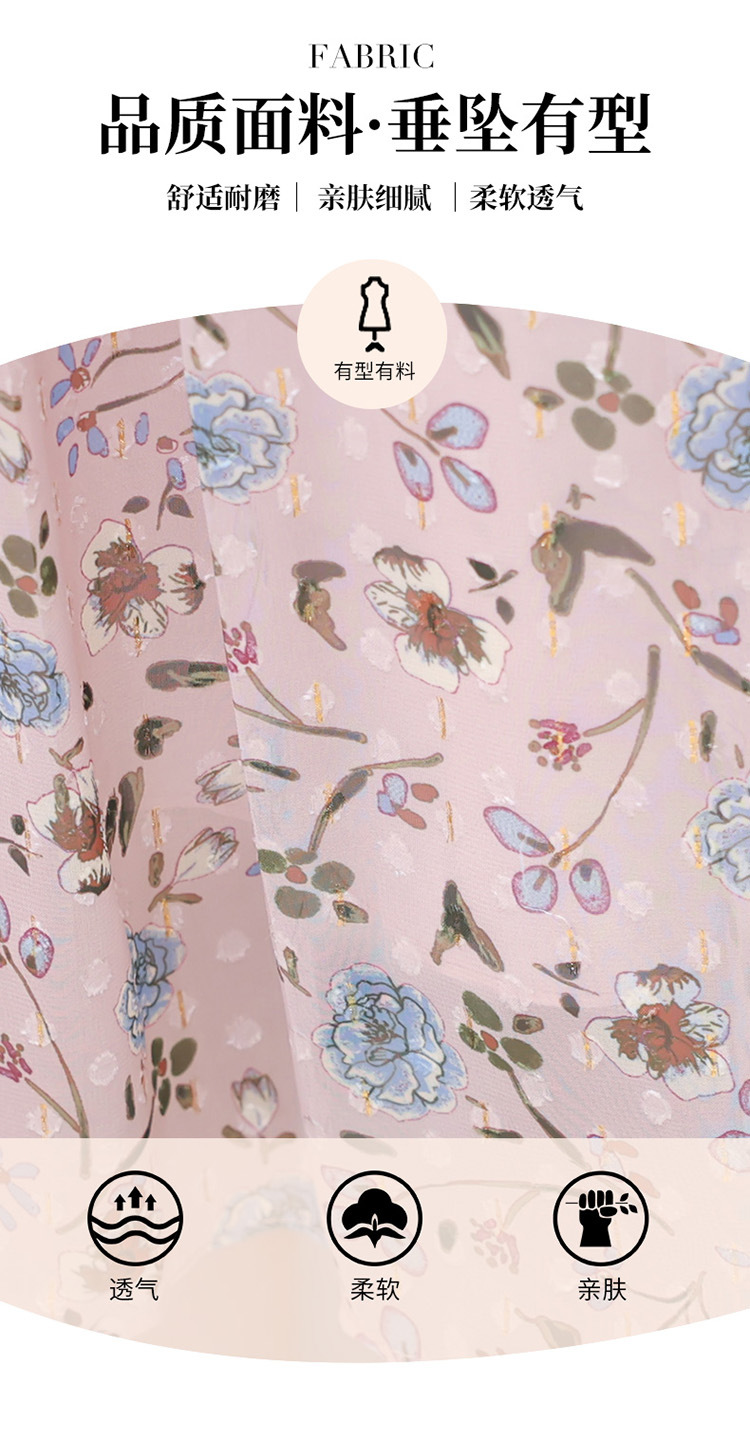系带收腰印花连衣裙,百褶裙中长款长袖优雅A字裙QYM-HL-24A6618-Y