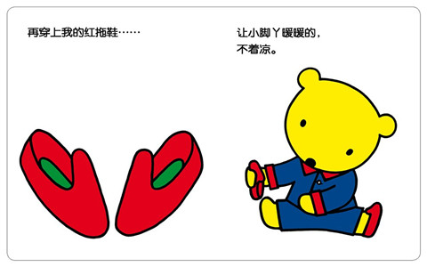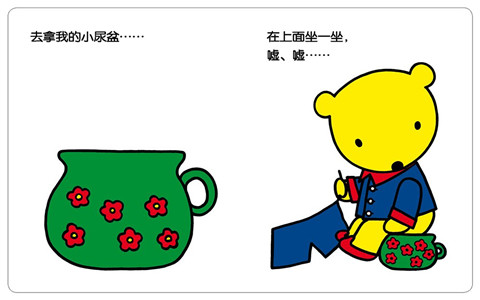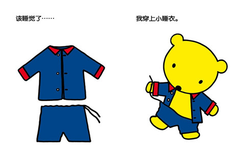 这套书还有一个特点就是全书没有出现任何大人的形象,只有主人公扑噜熊,比如当孩子看到扑噜熊怎样吃饭时,这时的扑噜熊就会给孩子做一个榜样,传达给孩子的信息是:扑噜熊可以做到,我也可以的。这样容易形成互动。当然还可以利用这套书教孩子认识一些颜色、生活用品等。