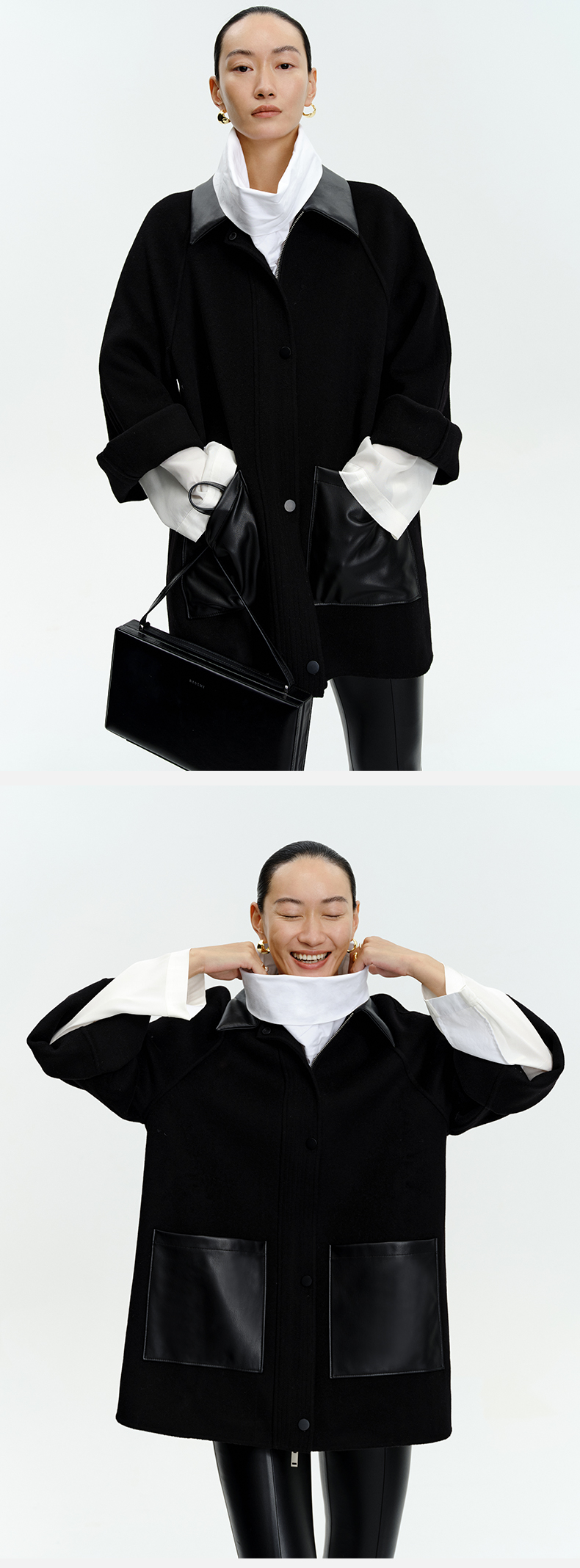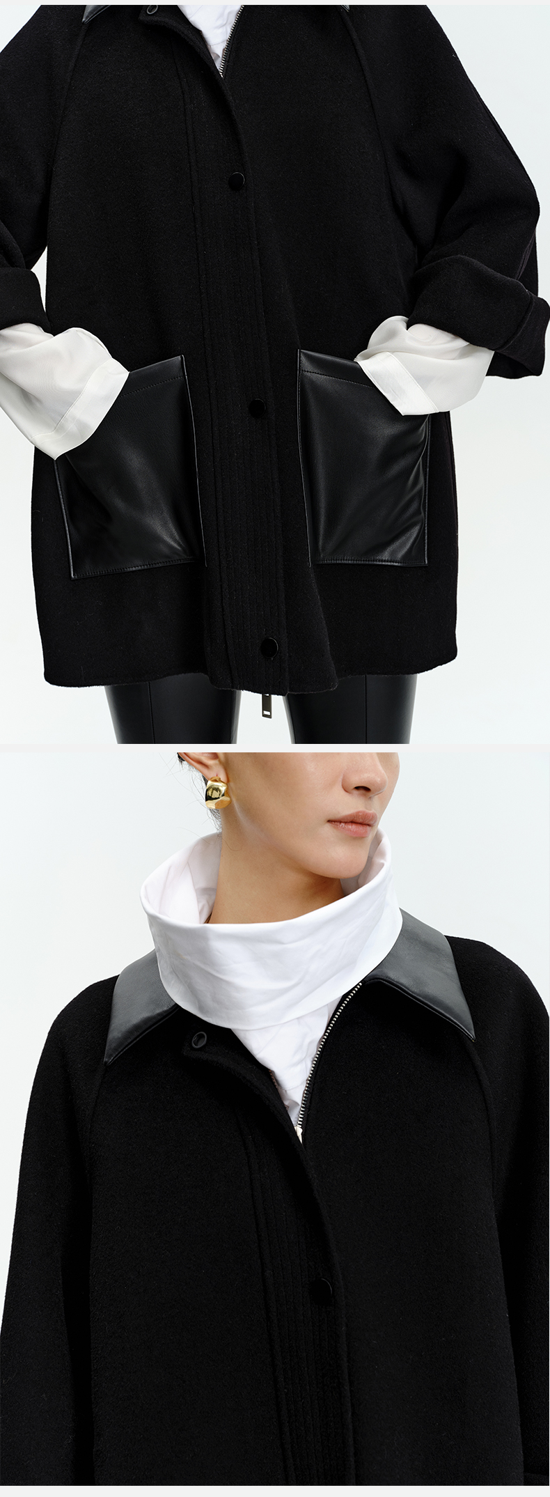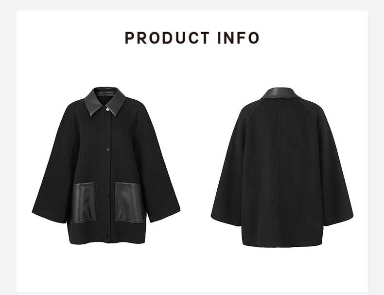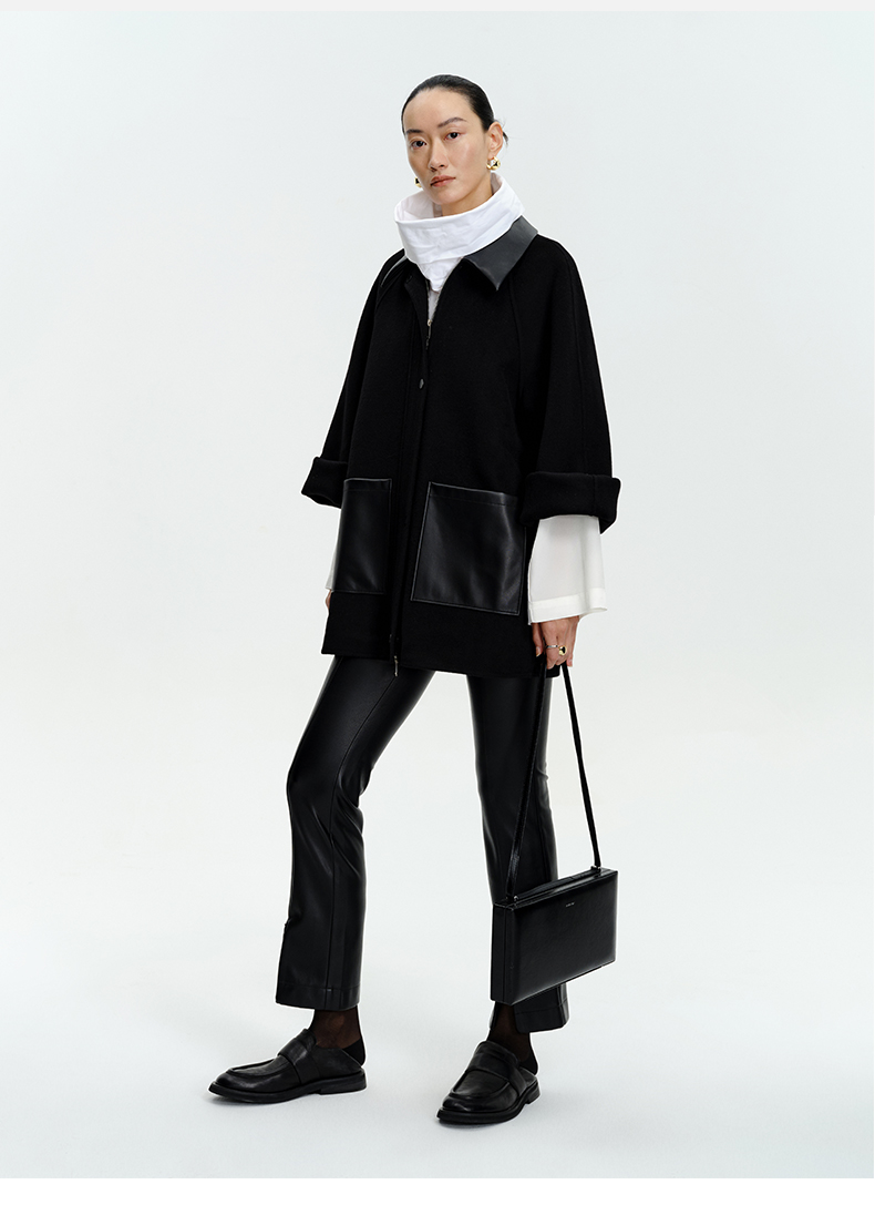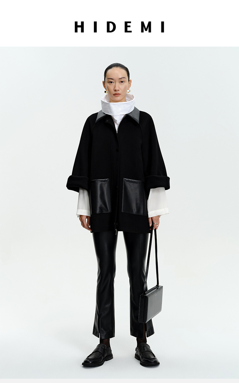 HIDEMI 美利奴羊毛廓形拼皮口袋中长款皮衣大衣