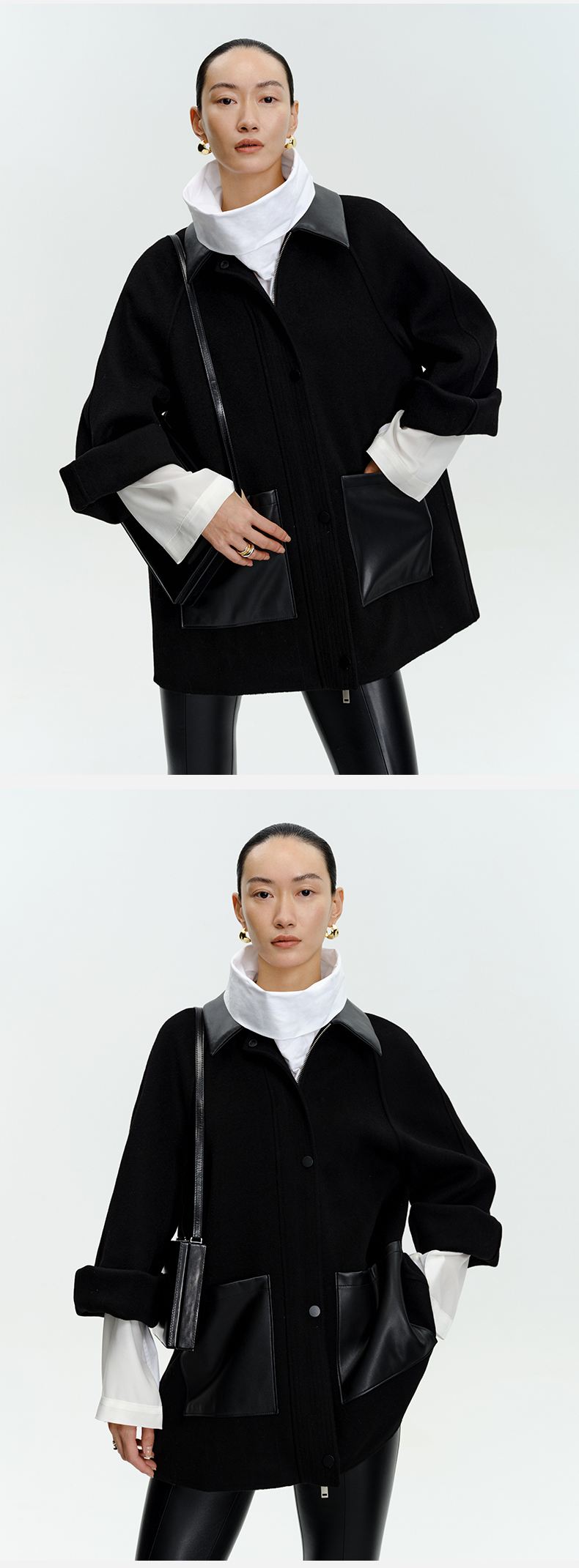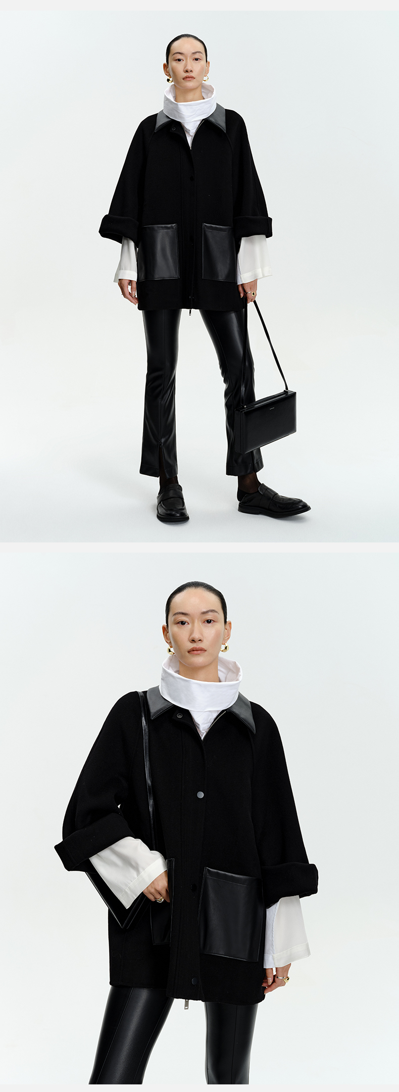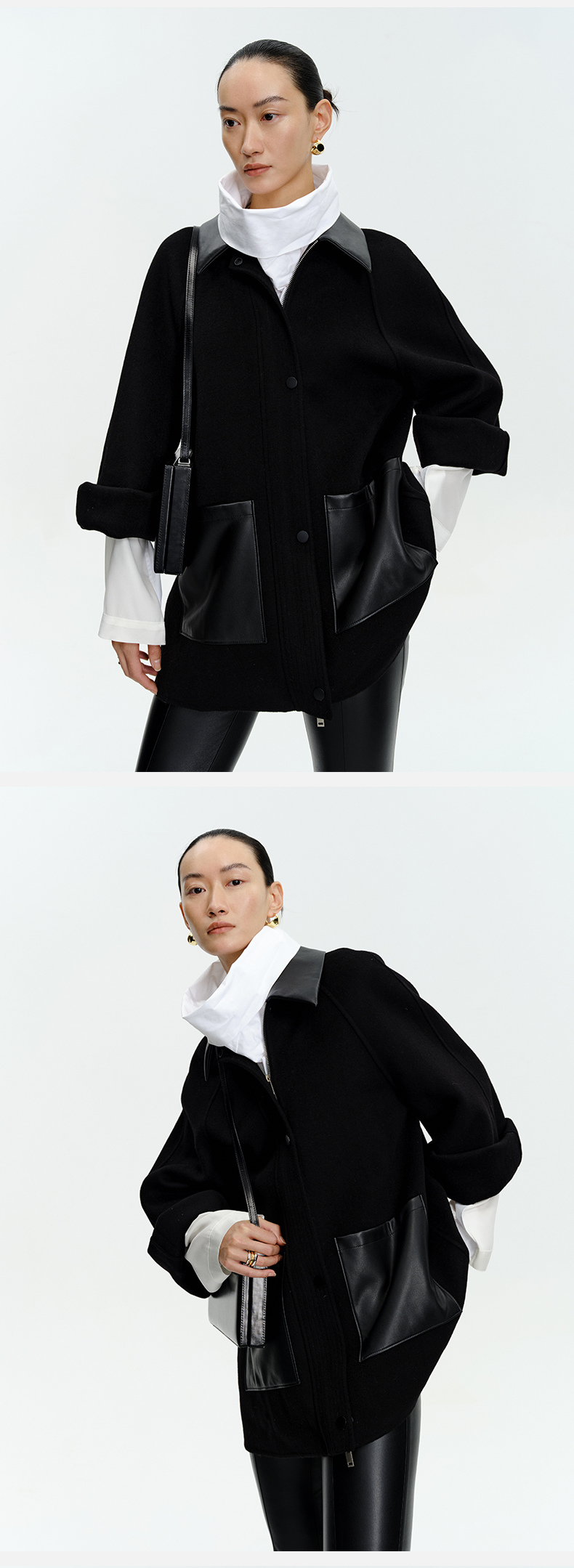 HIDEMI 美利奴羊毛廓形拼皮口袋中长款皮衣大衣