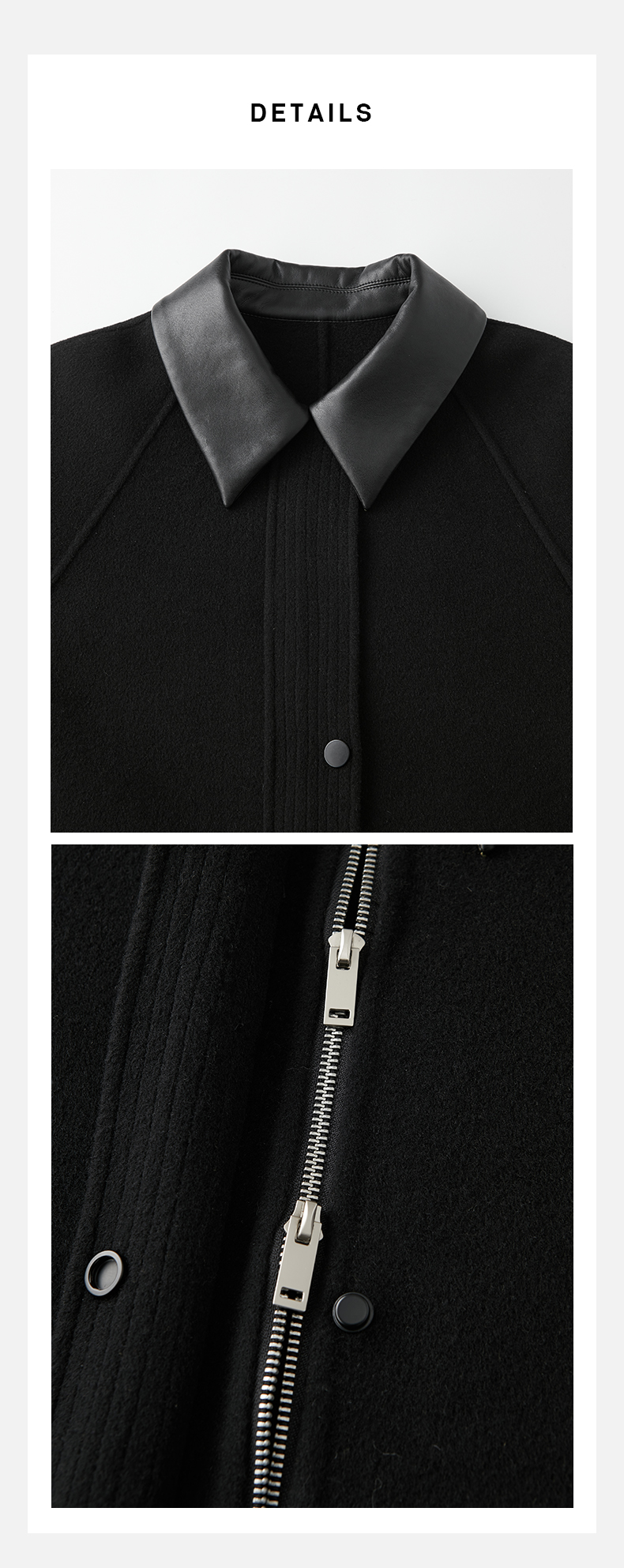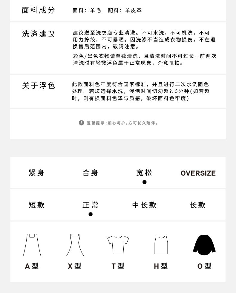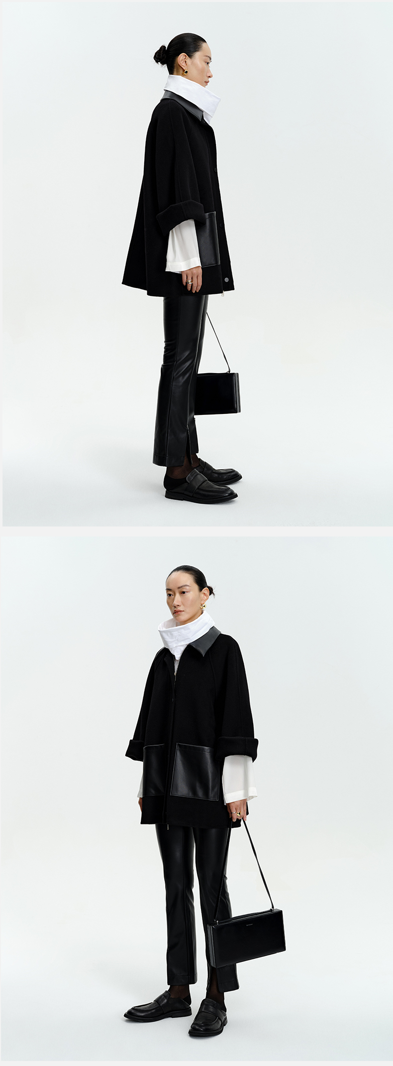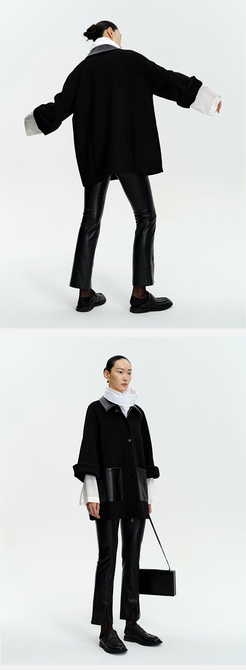 HIDEMI 美利奴羊毛廓形拼皮口袋中长款皮衣大衣