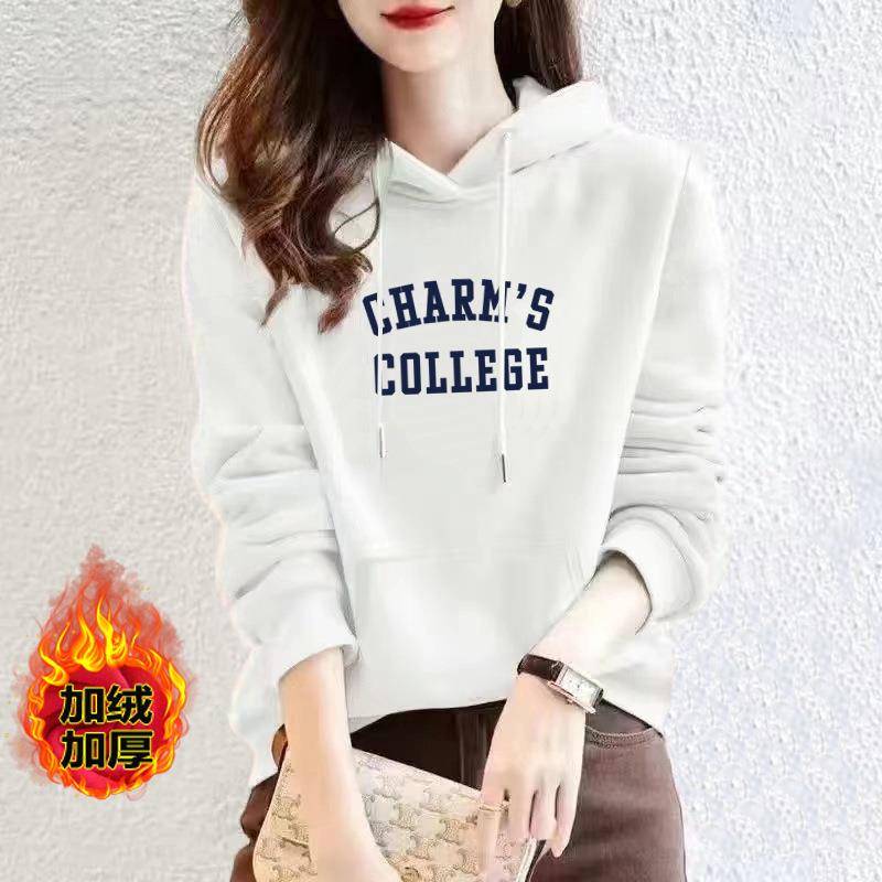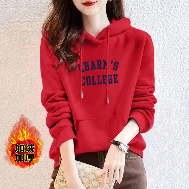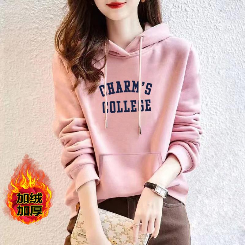 连帽加绒棉质卫衣运动宽松休闲时尚印花秋冬外套上衣女潮正肩多色