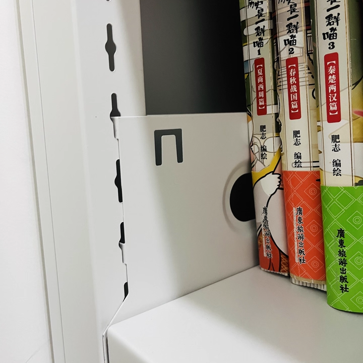 书架的侧边有插孔,配有卡扣,不需要螺丝刀,只需轻轻一按,就可以安装,拆卸也非常方便, 书架侧板上含一排通体的调节孔位,可以根据书籍来调整层高! 副架不可单独使用的!得搭配主架使用!