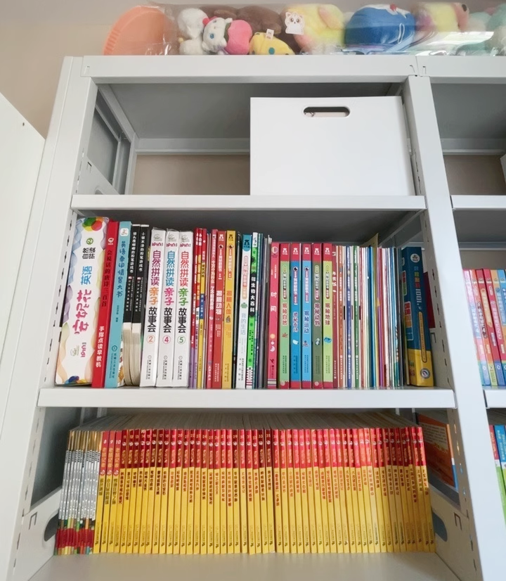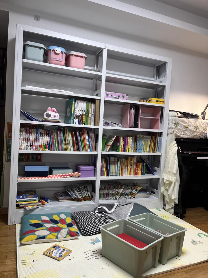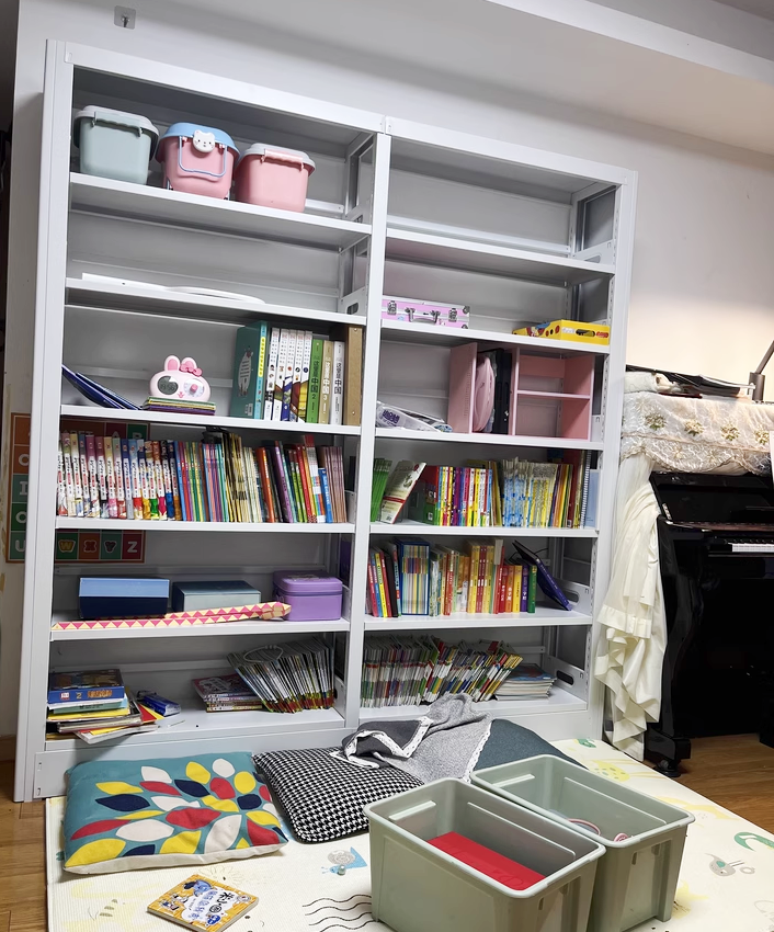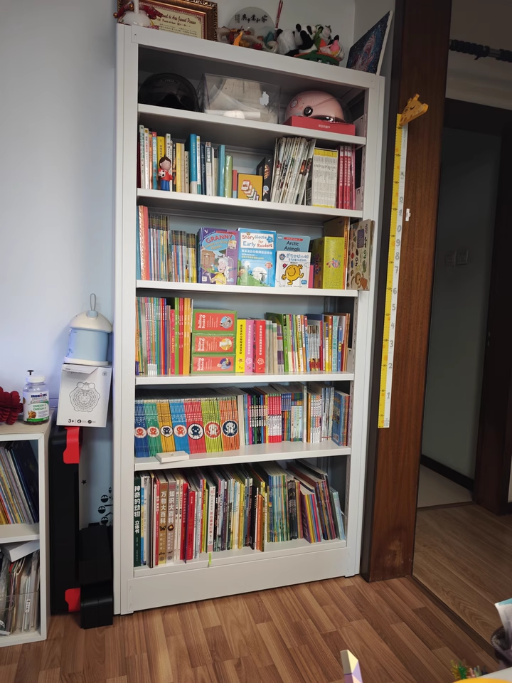 巨能装,巨能搭,给孩子一个真正的家庭图书馆! 一层可以放下80-110本书左右, 这些书的重量都有55kg, 整个书架非常稳固 ✅ 全钢材质,稳如泰山 ——承重超强,孩子攀爬也不倒,超级耐用! ✅ 层高随意调,什么书都装得下 ——绘本、教材、漫画…全部安排得明明白白! 家庭图书馆书架实拍👇
