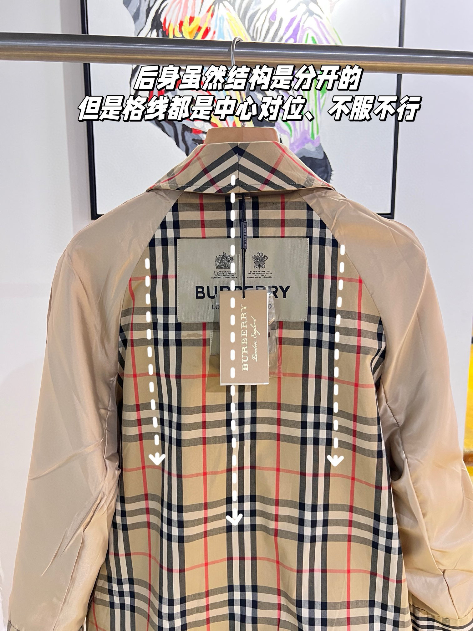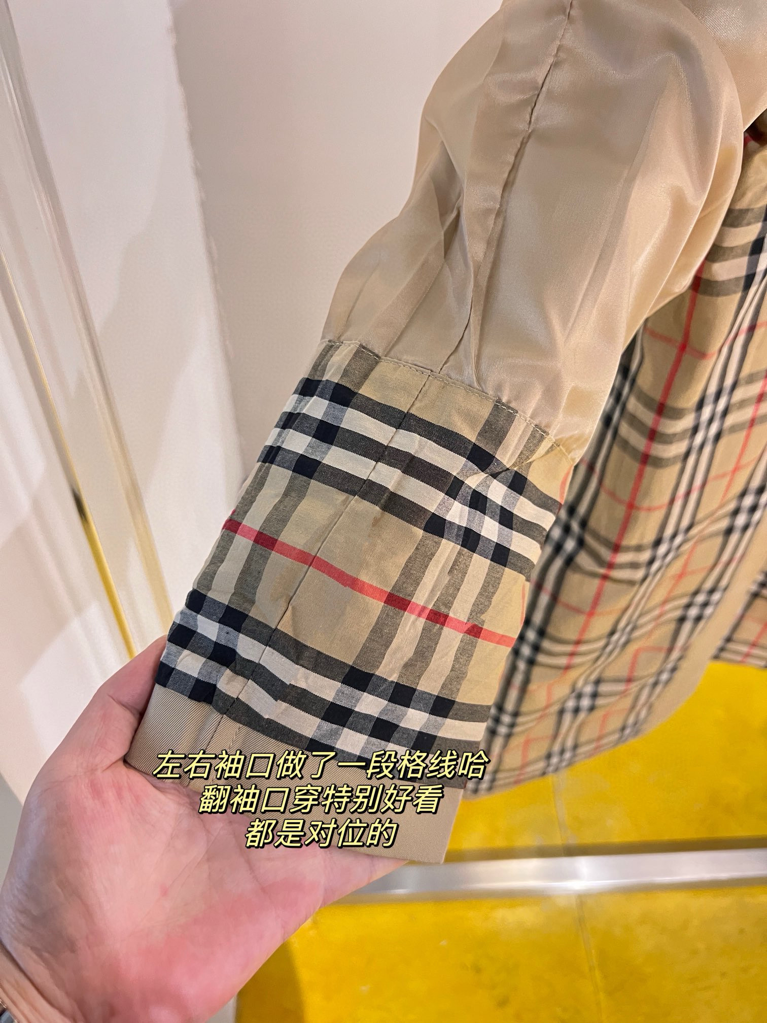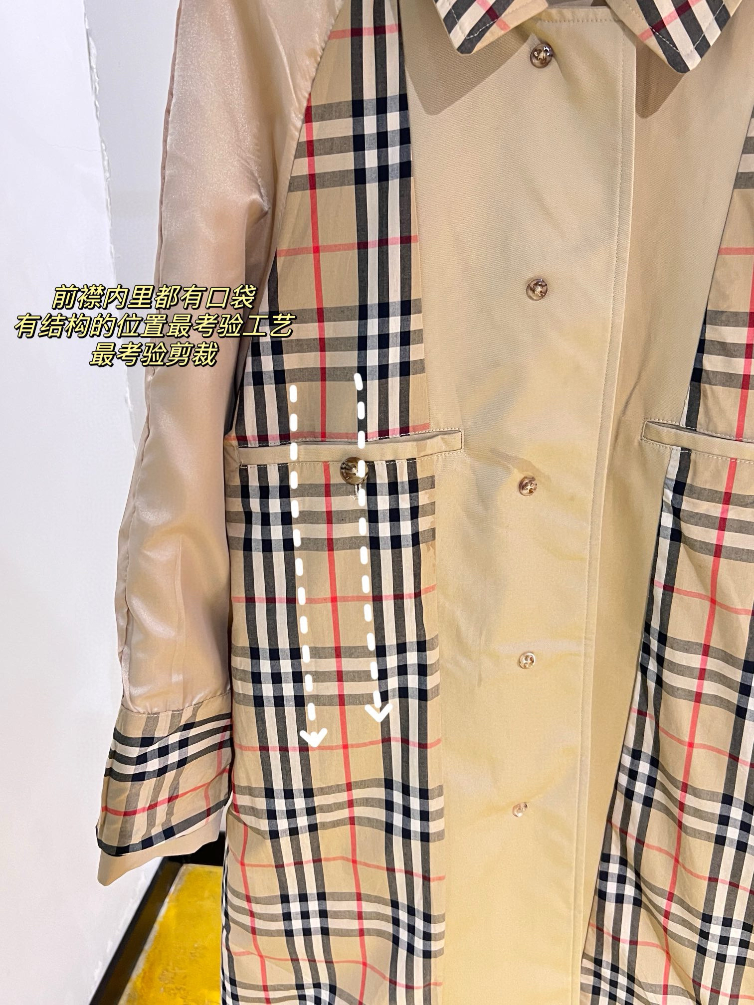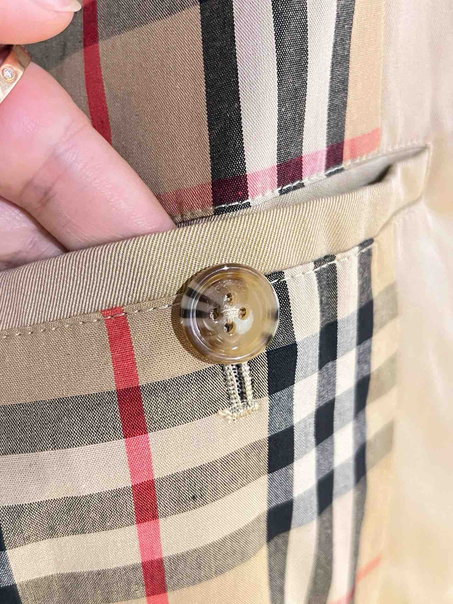 整个大身内里全部都是经典格纹内衬,这款风衣是两侧内口袋哈,口袋位置、后开叉结构位置,拼接合缝位置统统都是手工对纹,品相无敌。