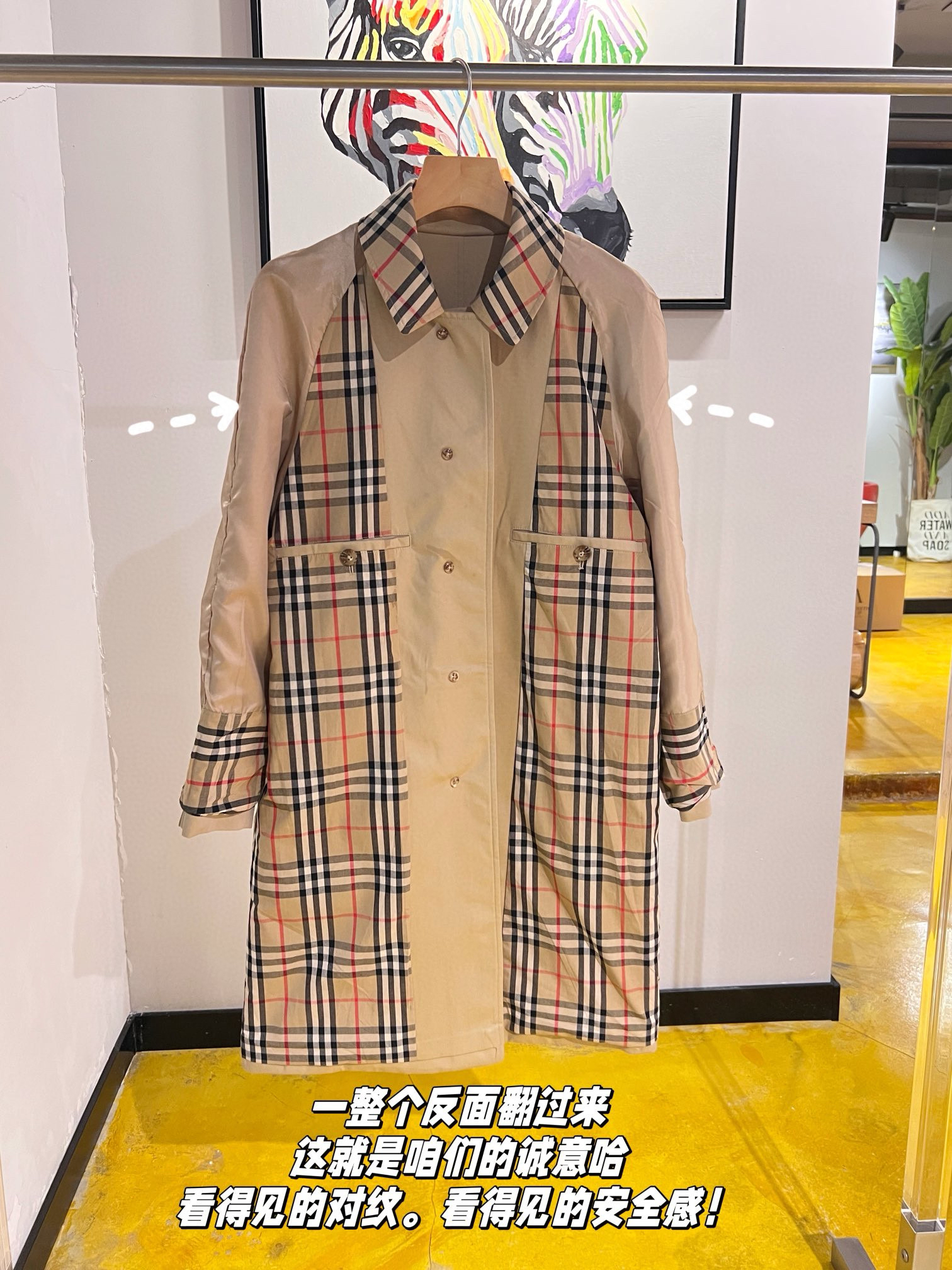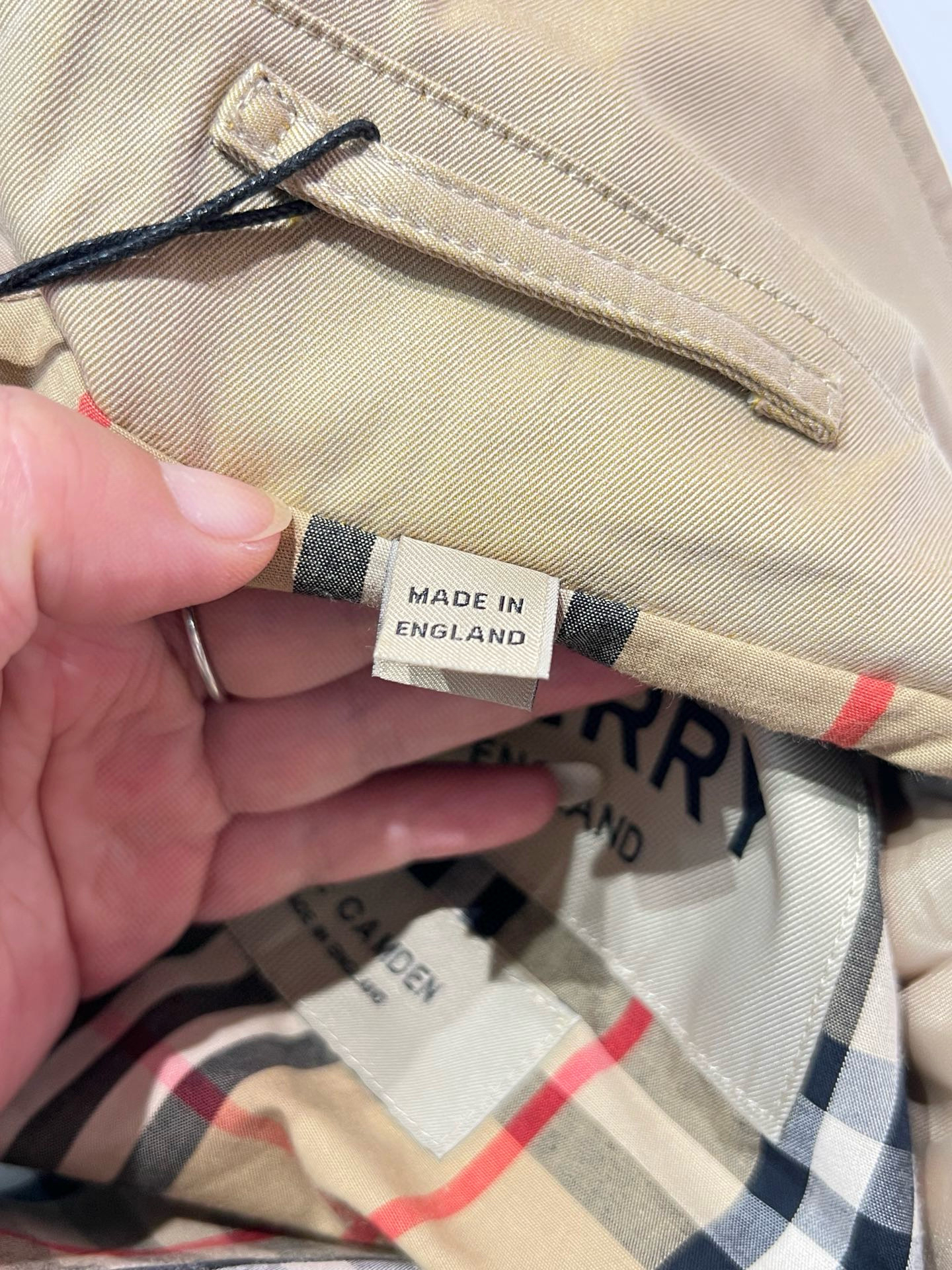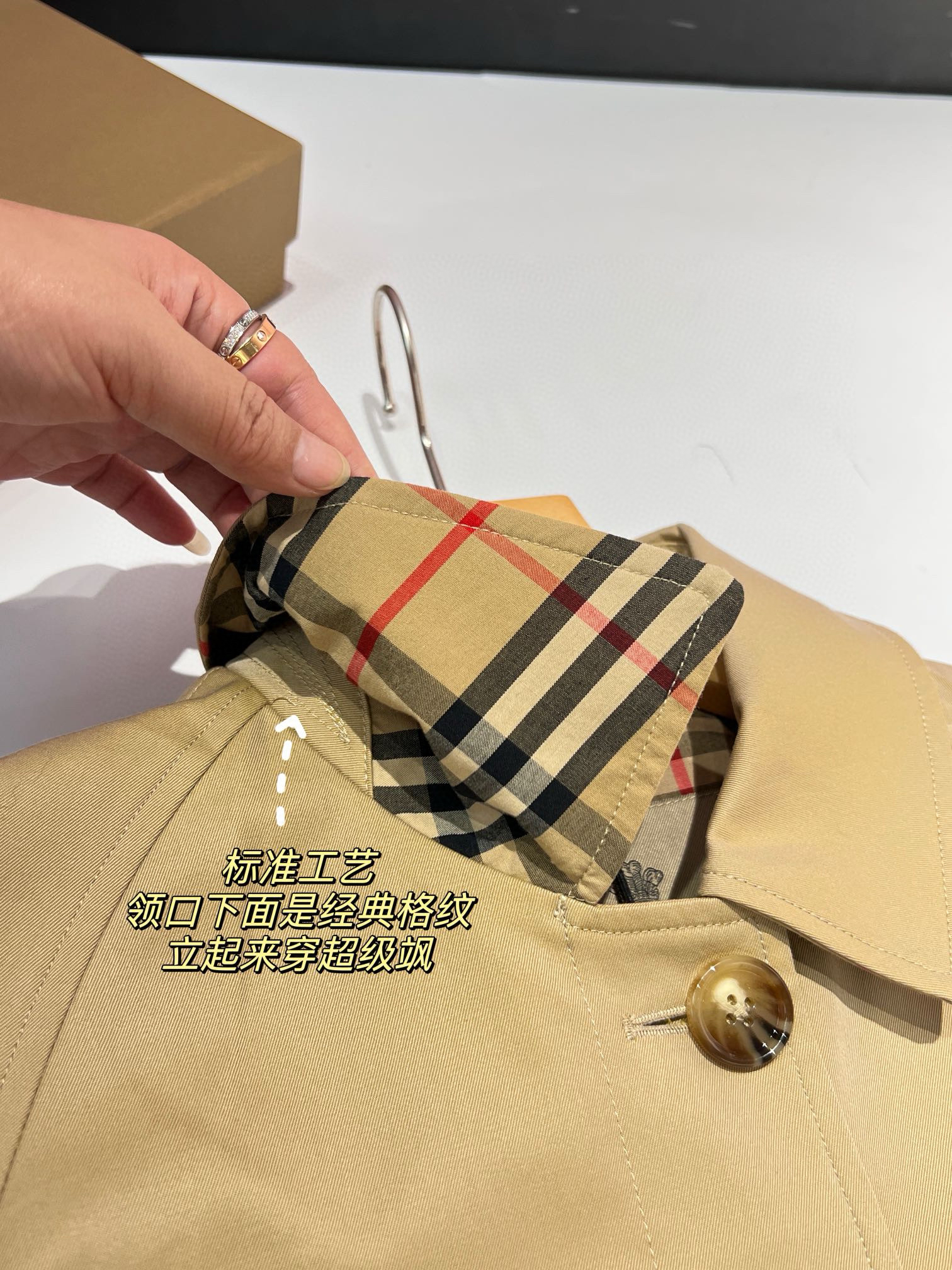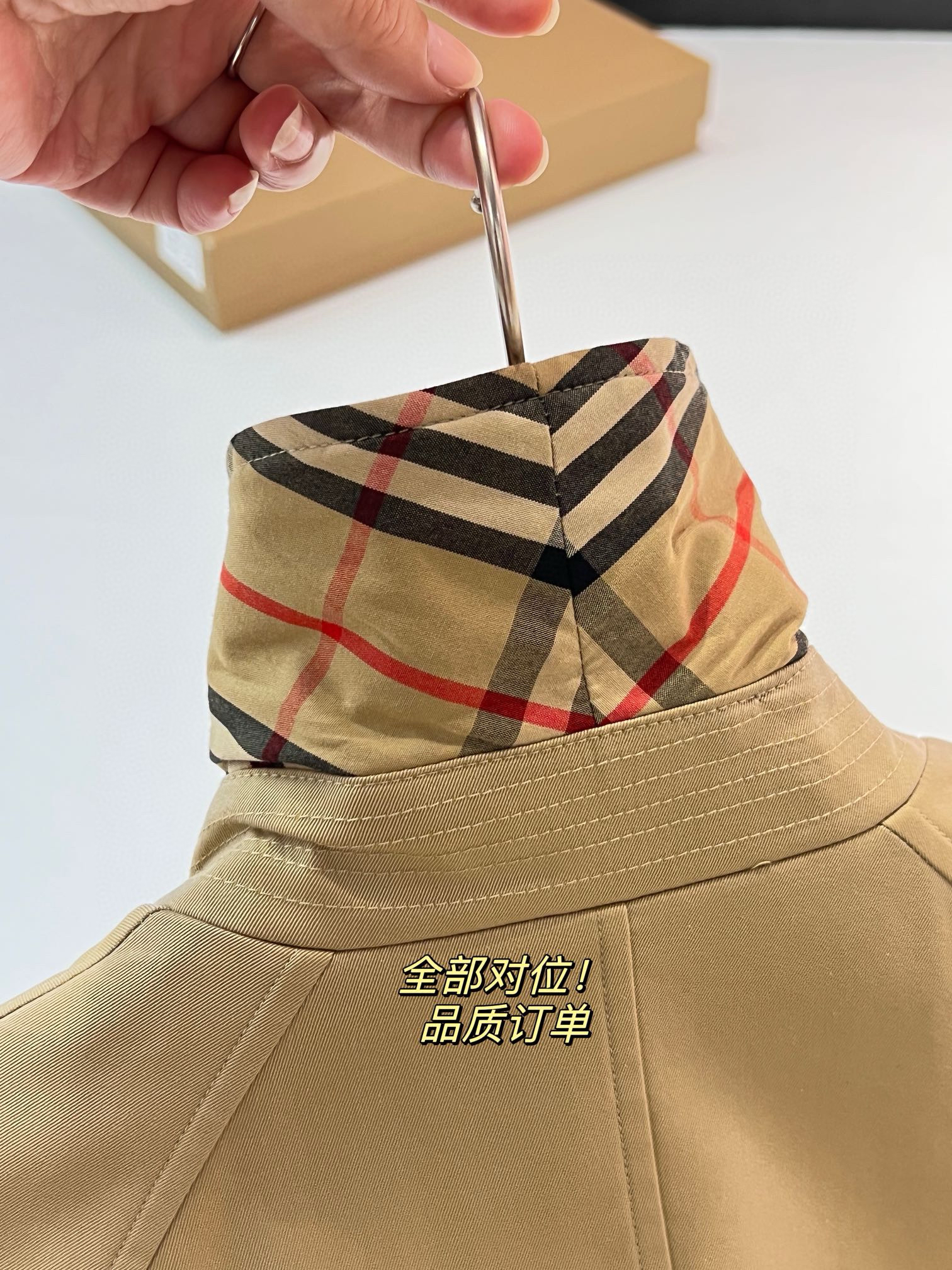 整个大身内里全部都是经典格纹内衬,这款风衣是两侧内口袋哈,口袋位置、后开叉结构位置,拼接合缝位置统统都是手工对纹,品相无敌。