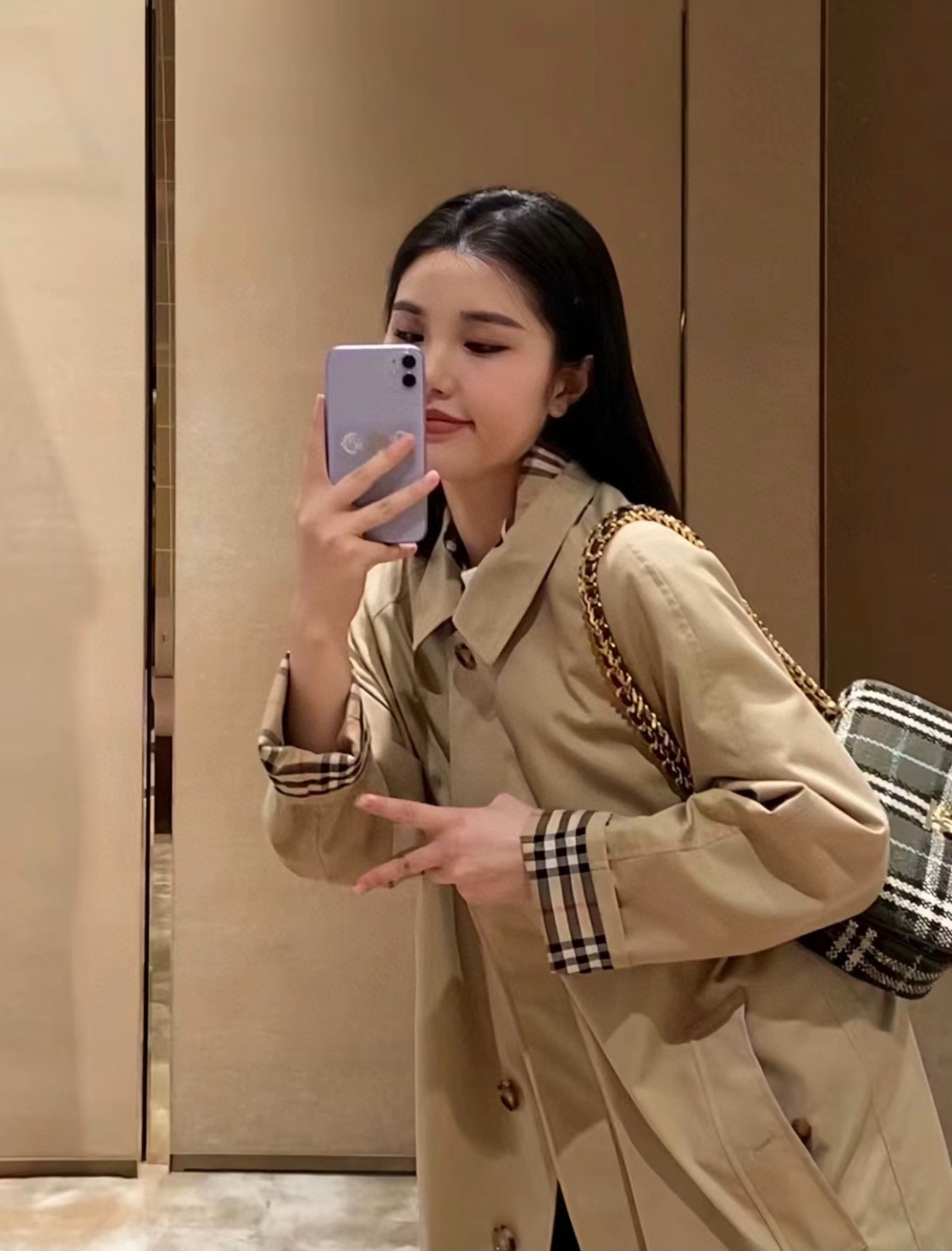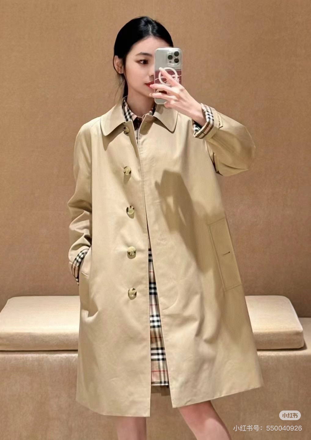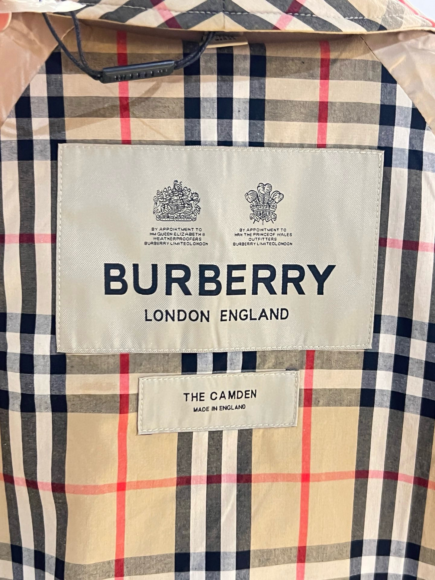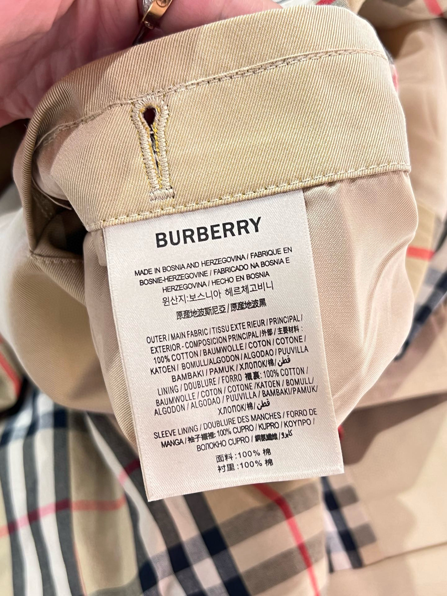 整个大身内里全部都是经典格纹内衬,这款风衣是两侧内口袋哈,口袋位置、后开叉结构位置,拼接合缝位置统统都是手工对纹,品相无敌。