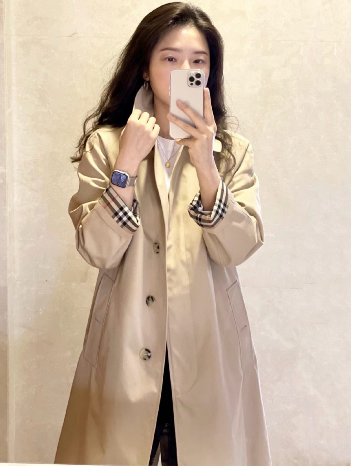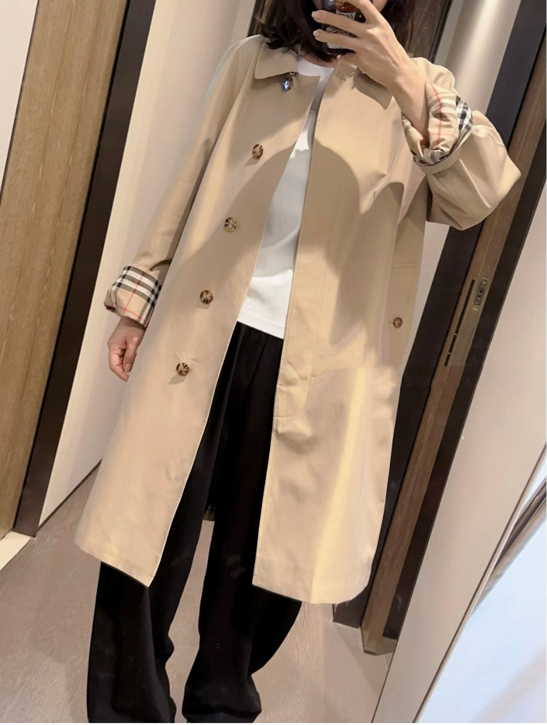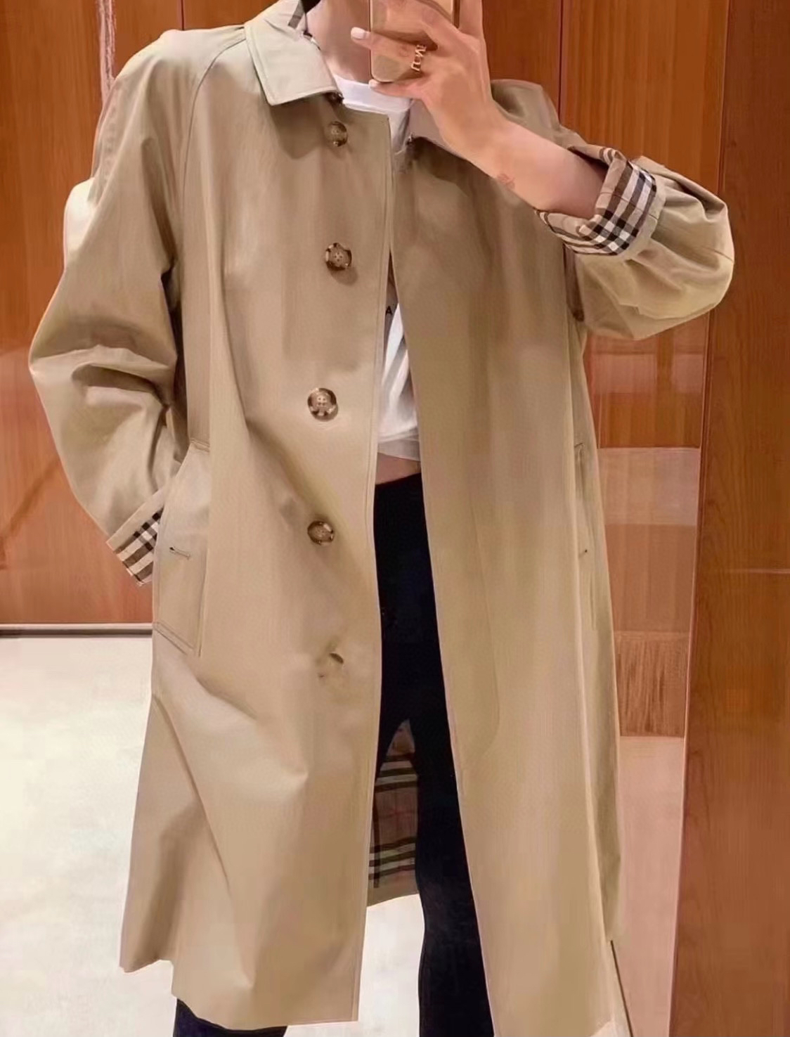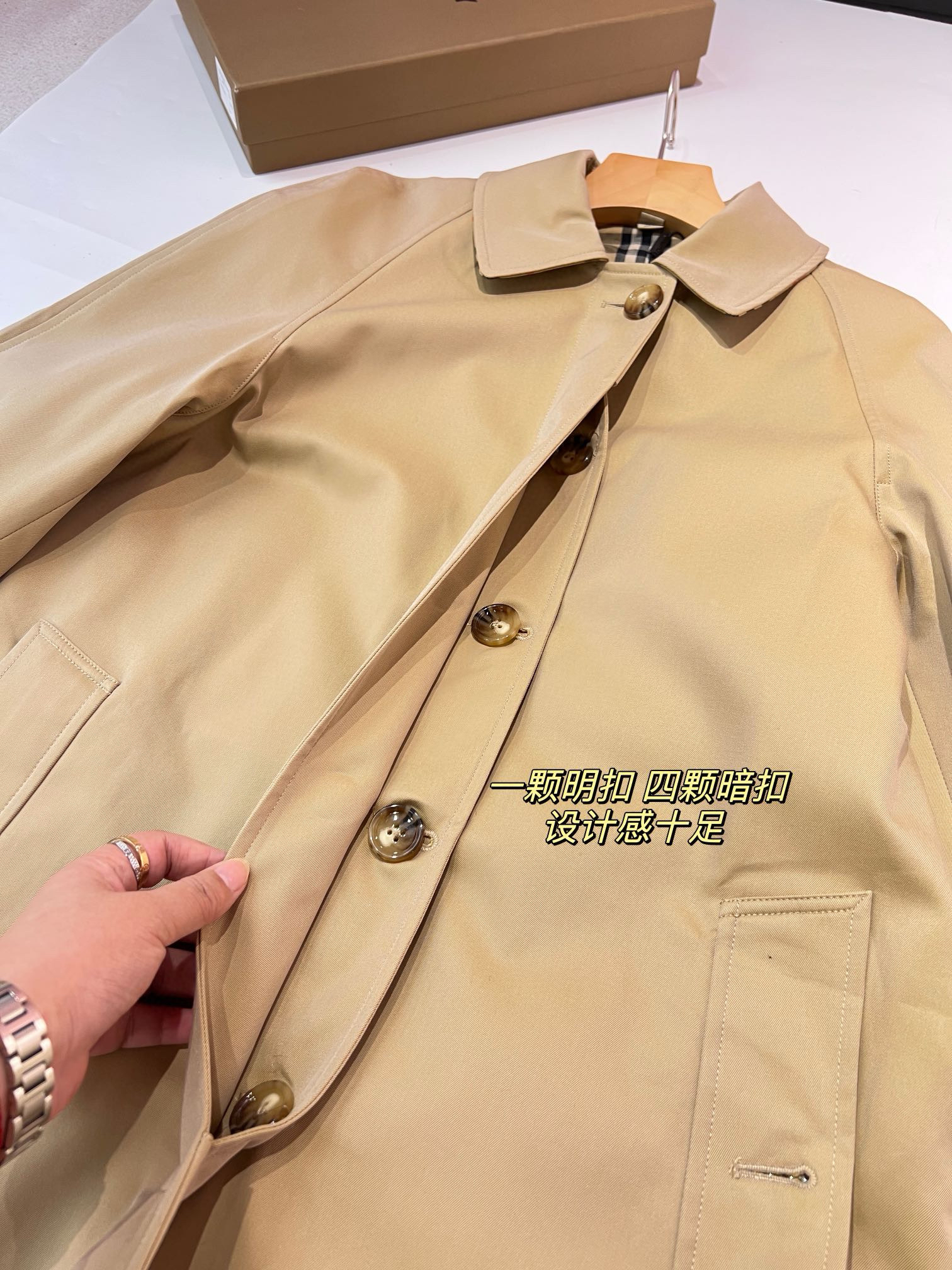 ➡️袖口有排扣哈,这款风衣是可以反过来袖口穿的,衣袖做了经典格纹拼接,翻过来穿更随意,更时髦。