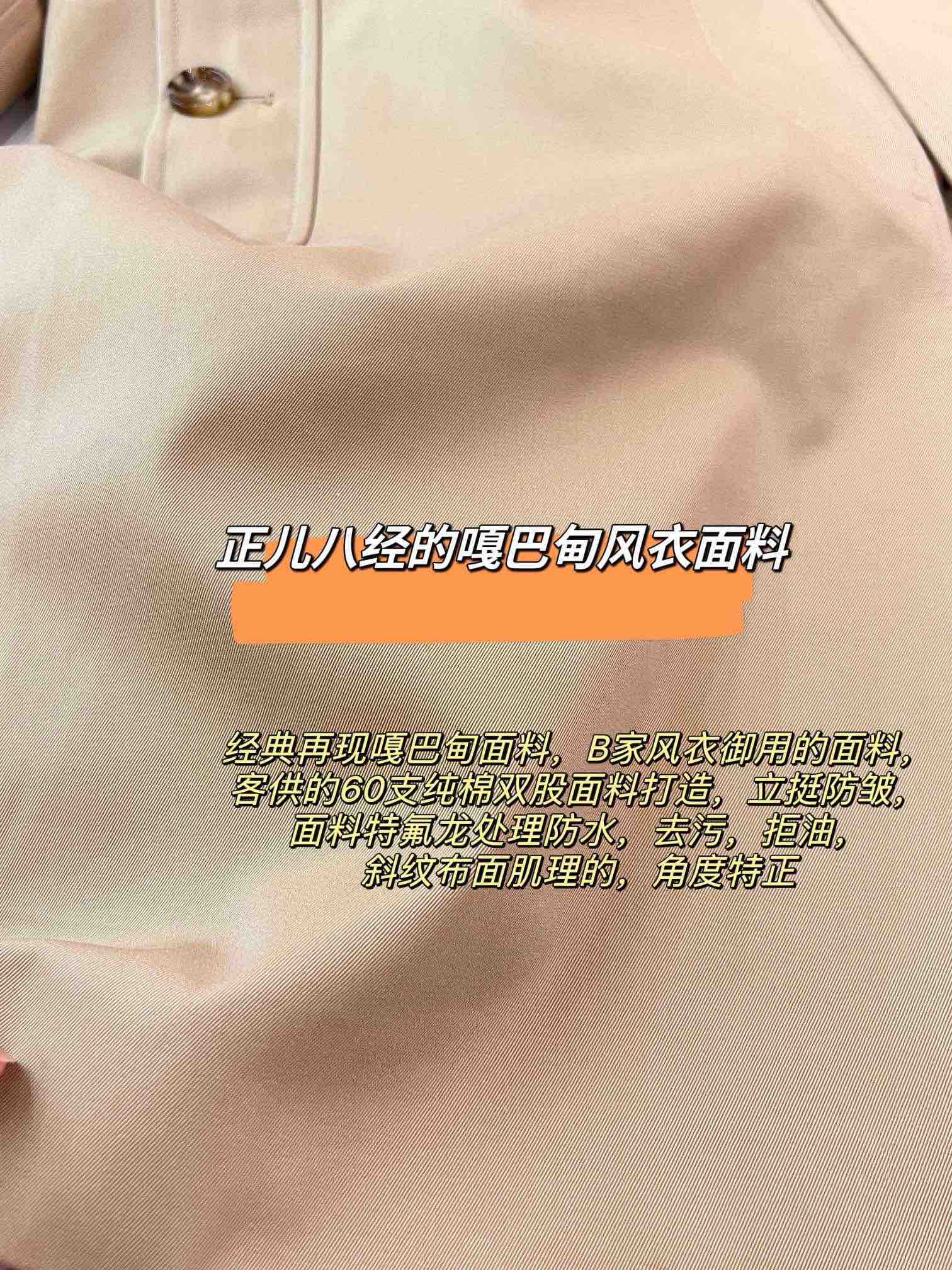 经典再现嘎巴甸面料,B家风衣御用的面料,客供的60支纯棉双股面料打造,立挺防皱,面料特氟龙处理防水,去污,拒油,斜纹布面肌理的,角度特正