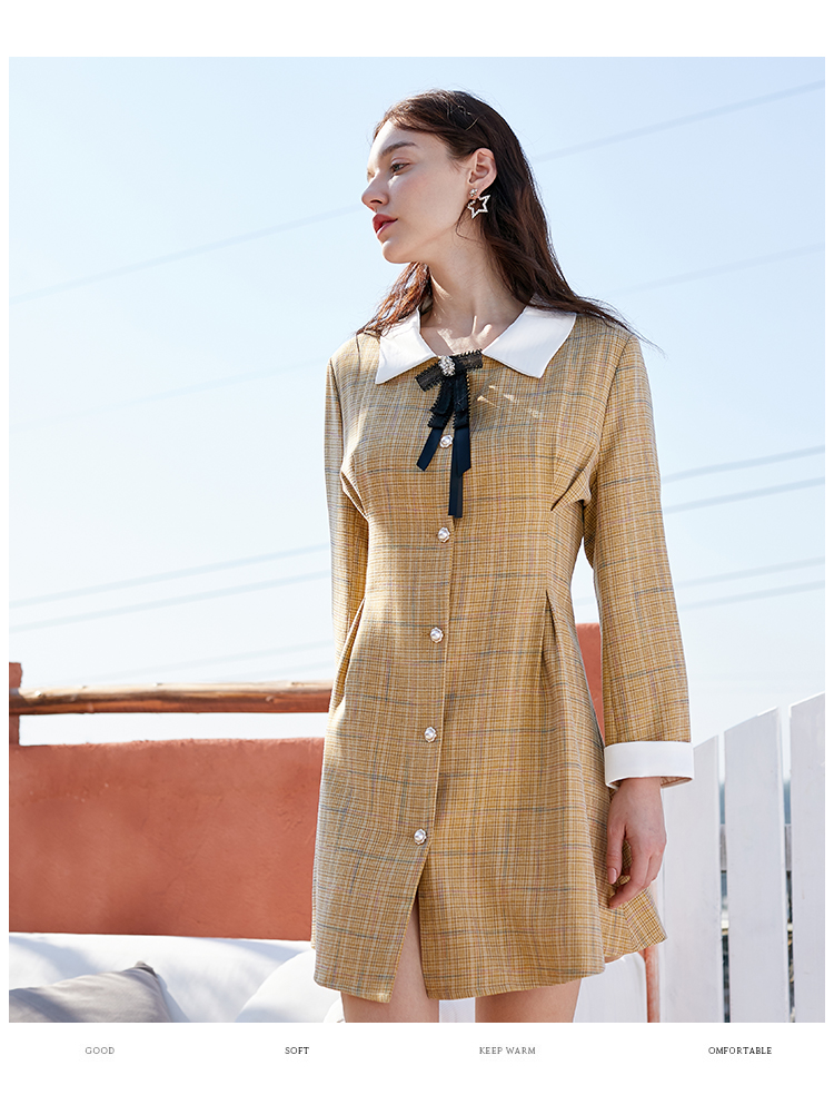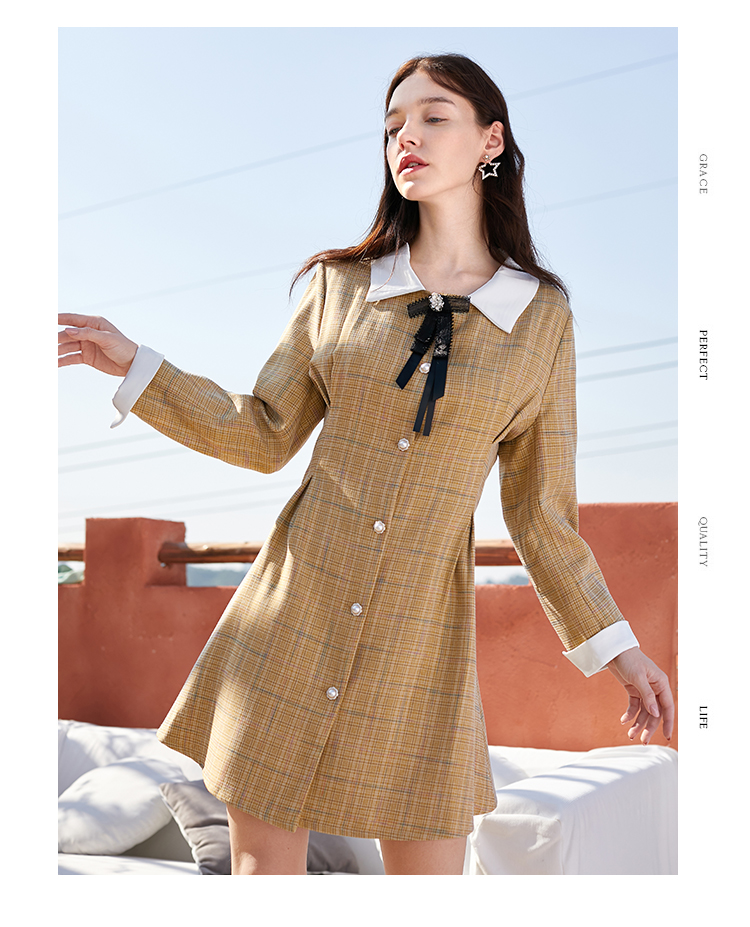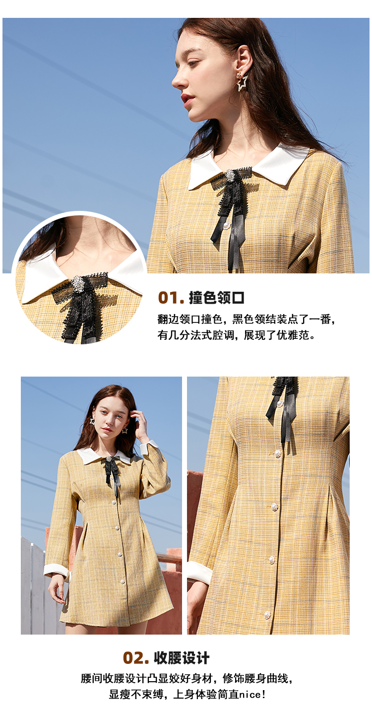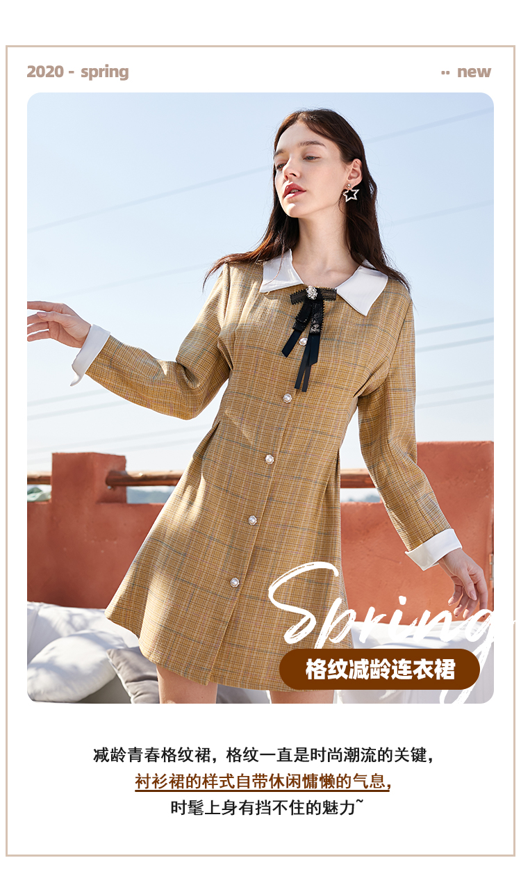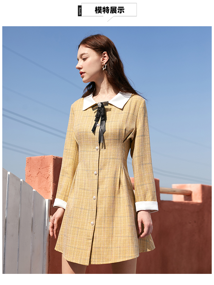 欧芮儿春新款长袖格子连衣裙女中长款洋气小个子收腰A字裙