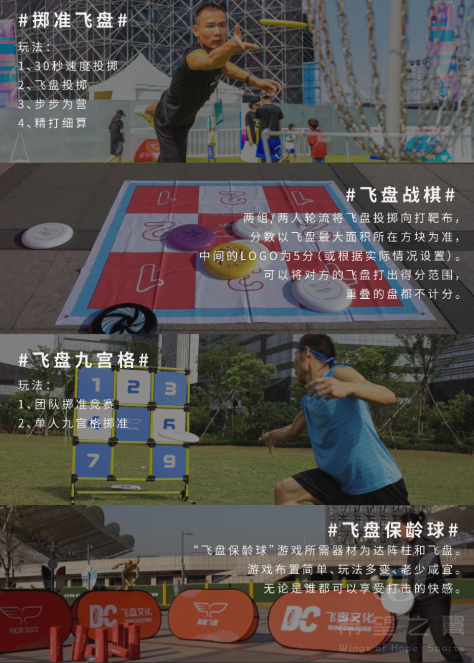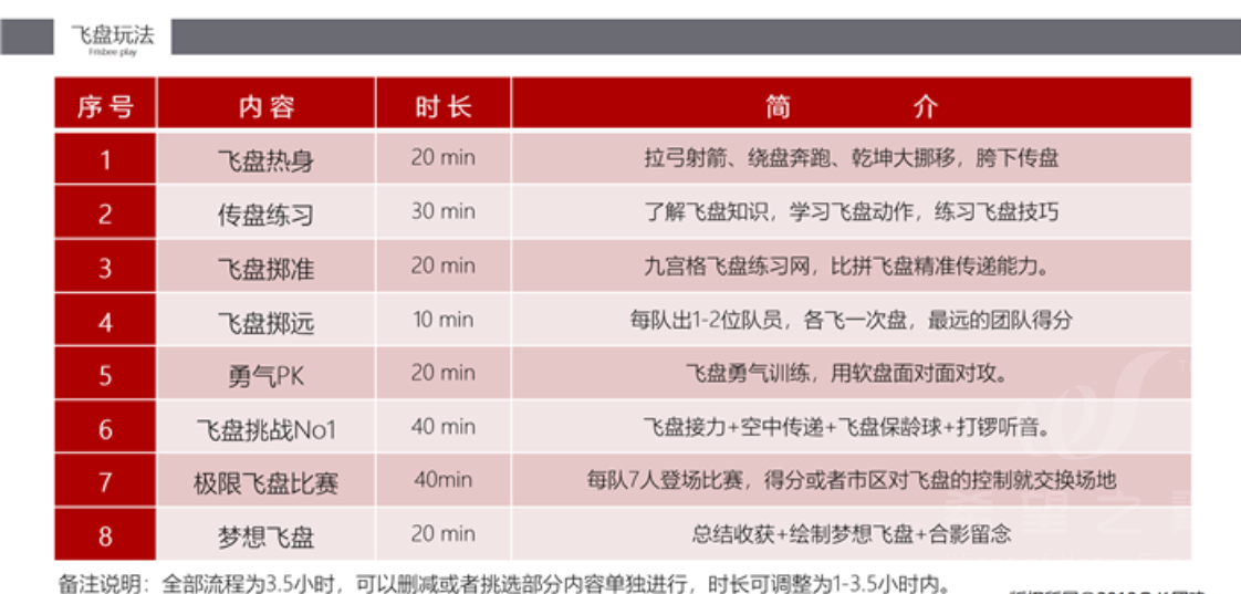 (课程介绍、动作练习、飞盘嘉年华、团队飞盘、躲避飞盘)