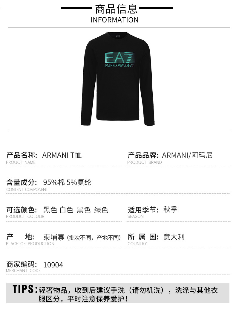 【超惠秒】Armani EA7 男士运动休闲长袖T恤10904