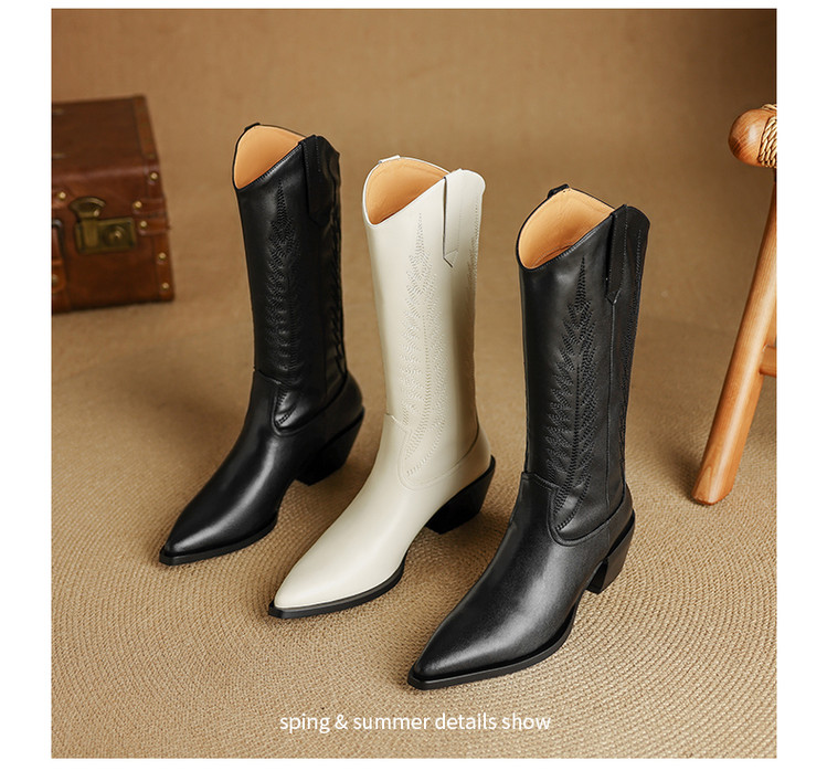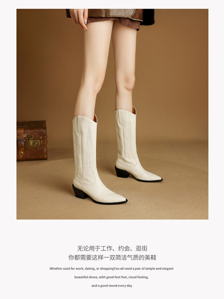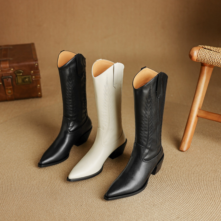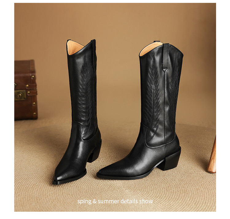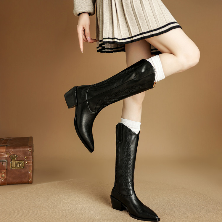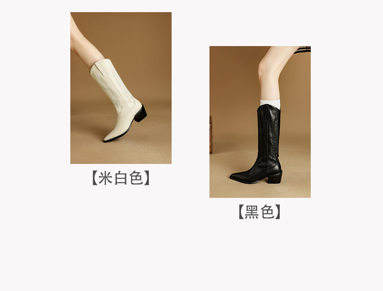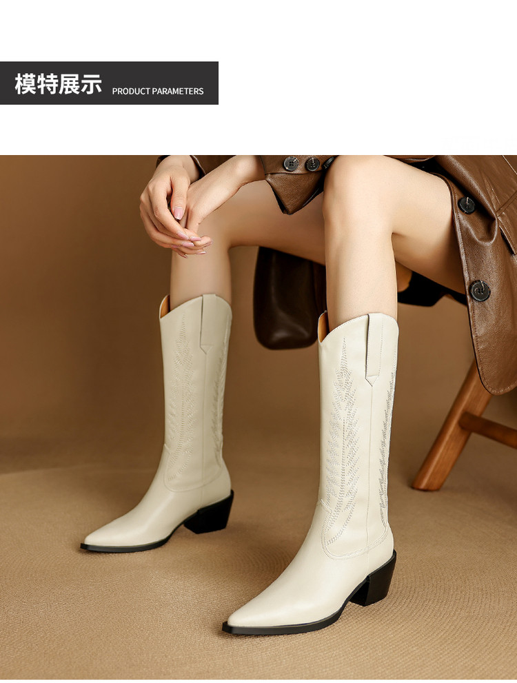 【预售5天】尖头高筒西部牛仔靴女秋冬新款真皮粗跟骑士靴百搭不过膝长靴XMN&H825