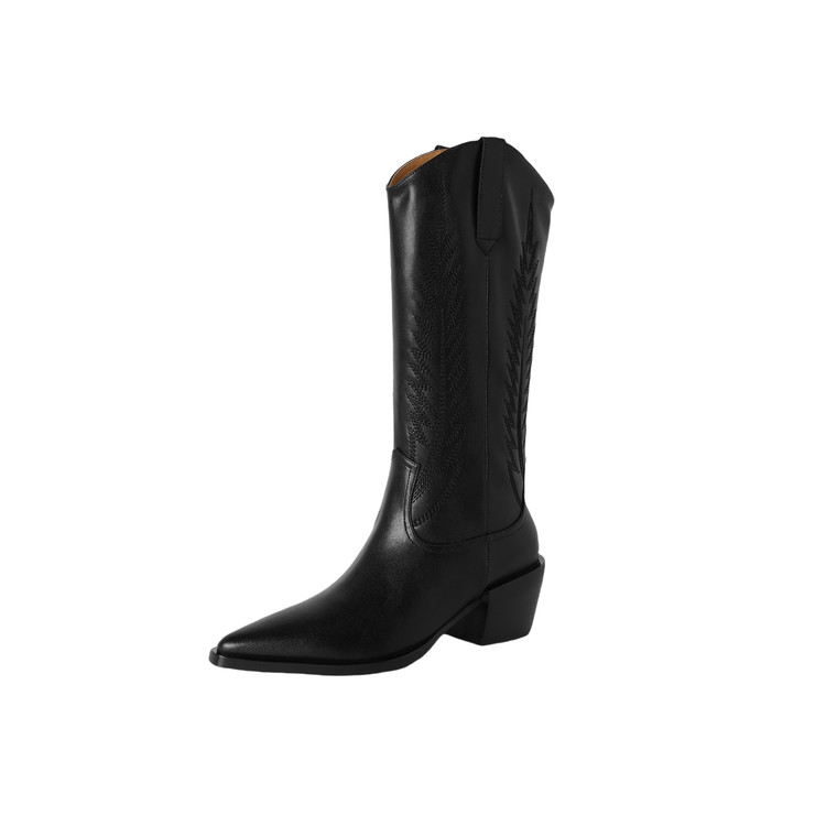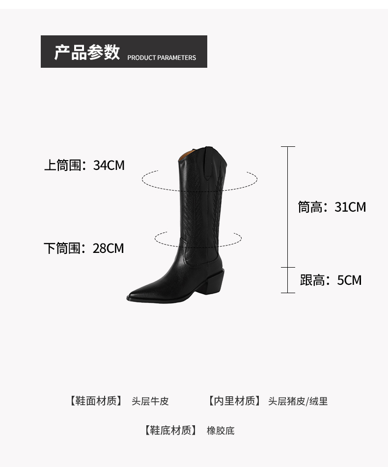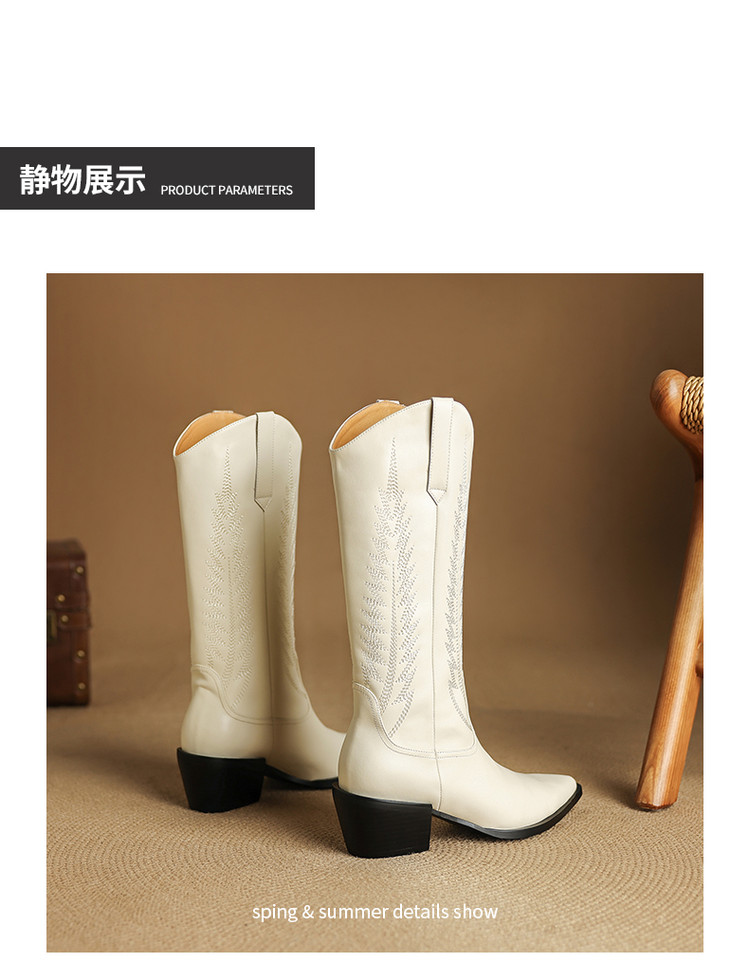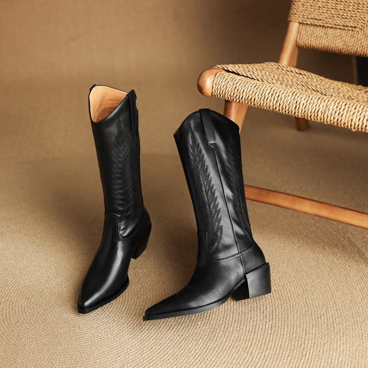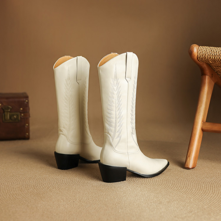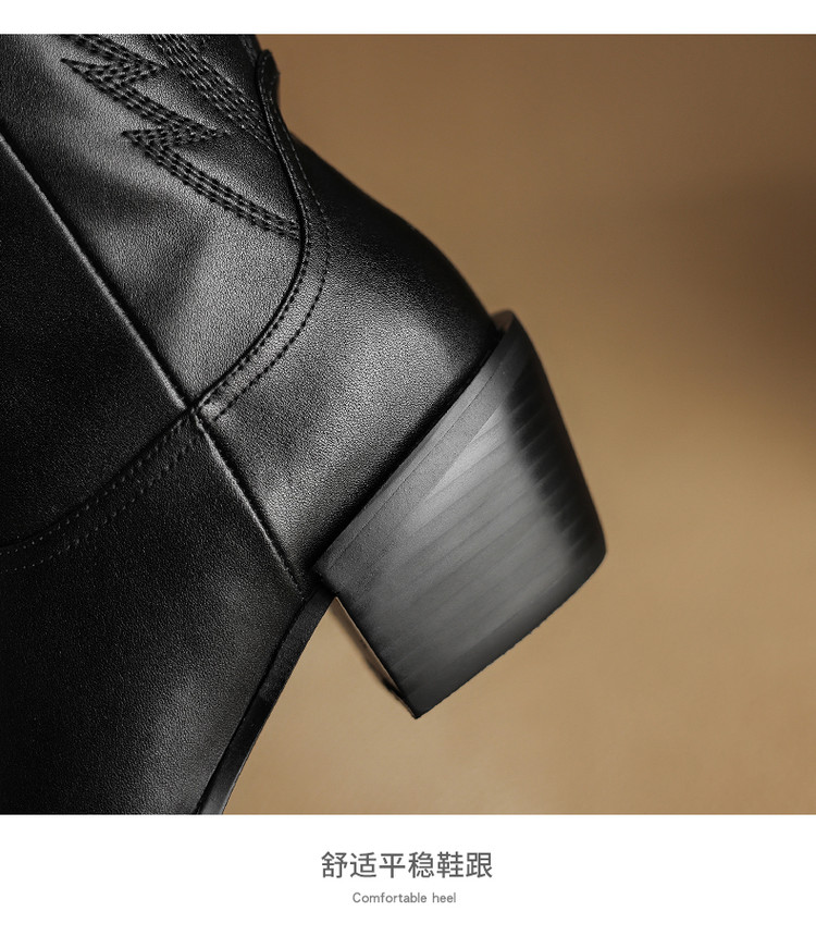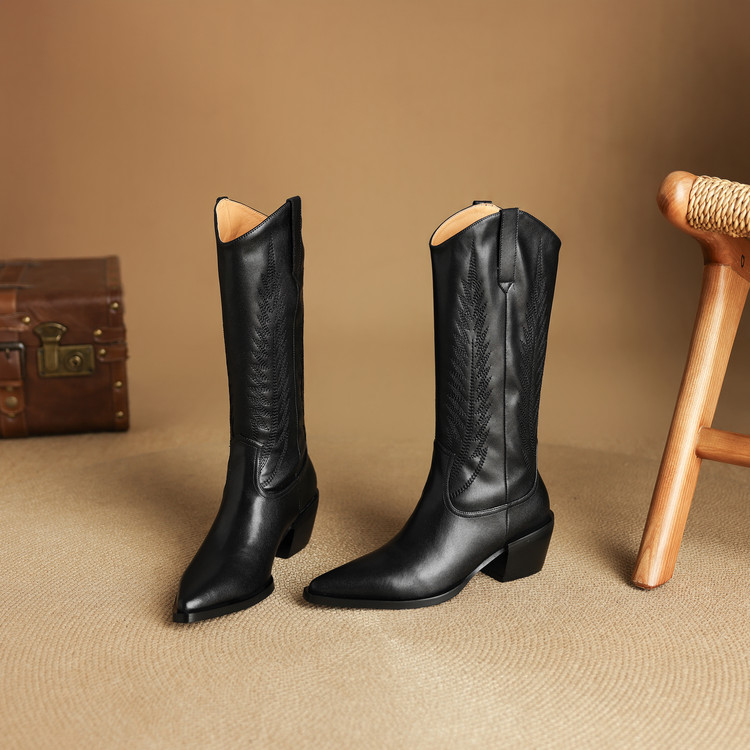 【预售5天】尖头高筒西部牛仔靴女秋冬新款真皮粗跟骑士靴百搭不过膝长靴XMN&H825