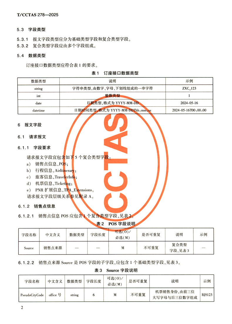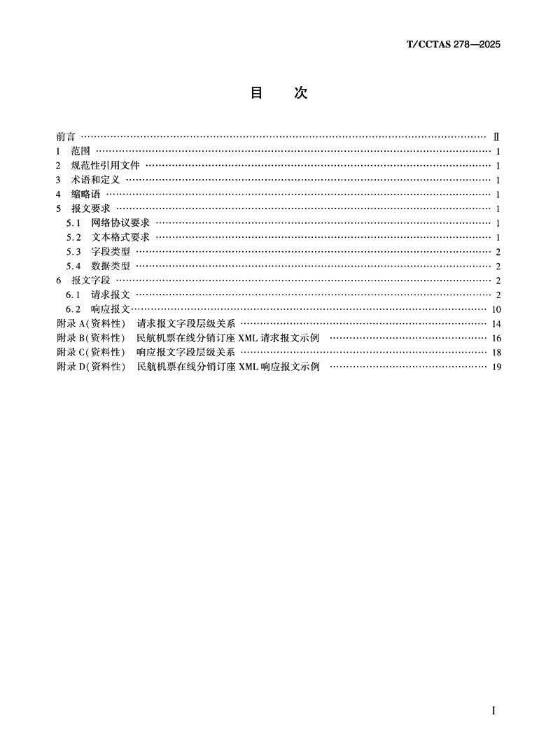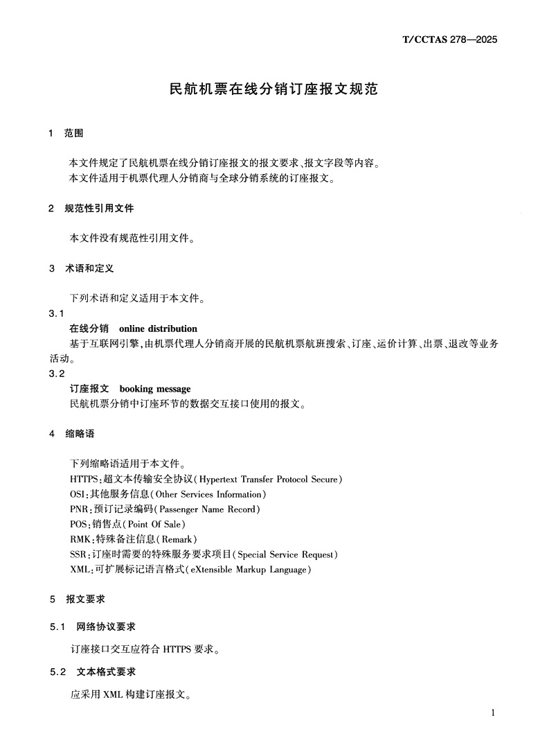 民航机票在线分销订座报文规范T/CCTAS 278—2025