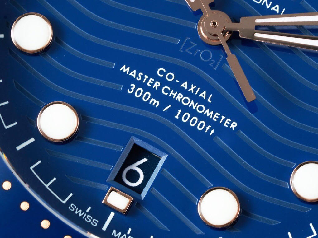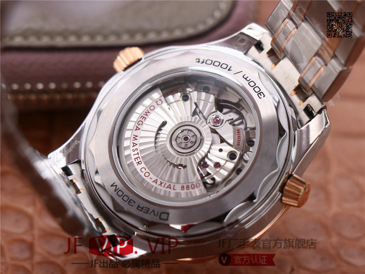 VS新海马300M间玫金蓝面,12点位外圈口带有贵金属印记:AU750 、狗头标 、天平秤 、logo,直径42mm自动8800机芯,黑摆轮陶瓷面盘,陶瓷表圈,男士腕表,精钢表带,自动机械机芯,透底。
