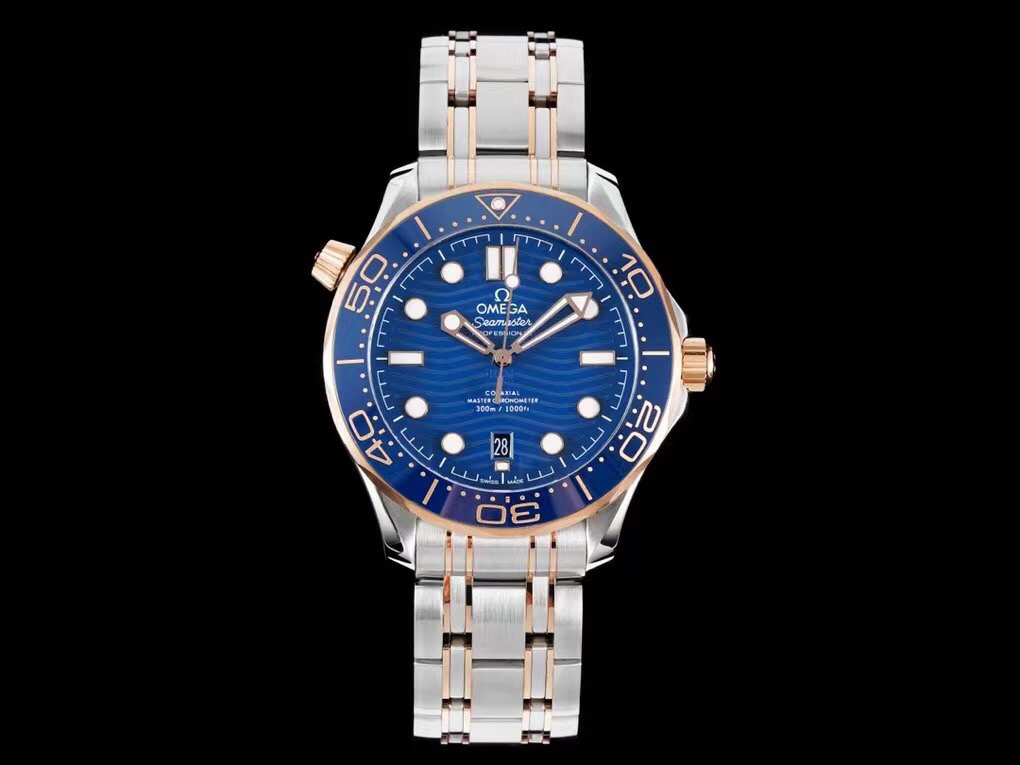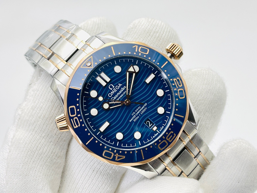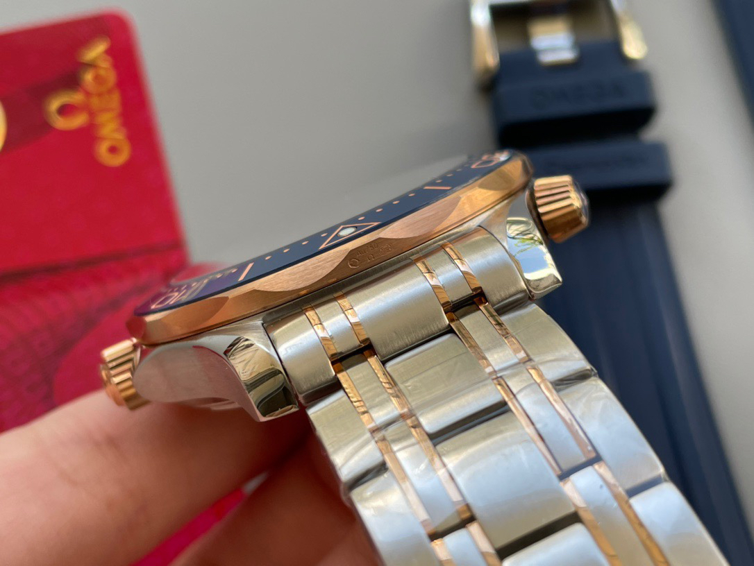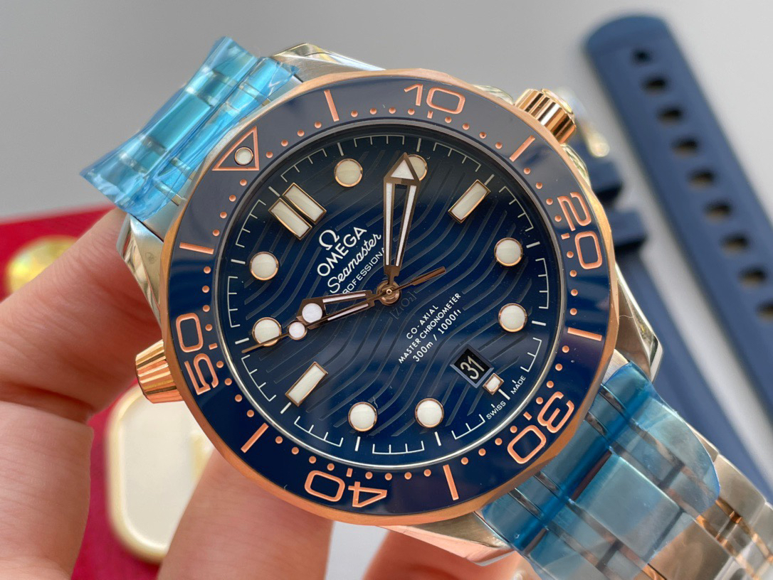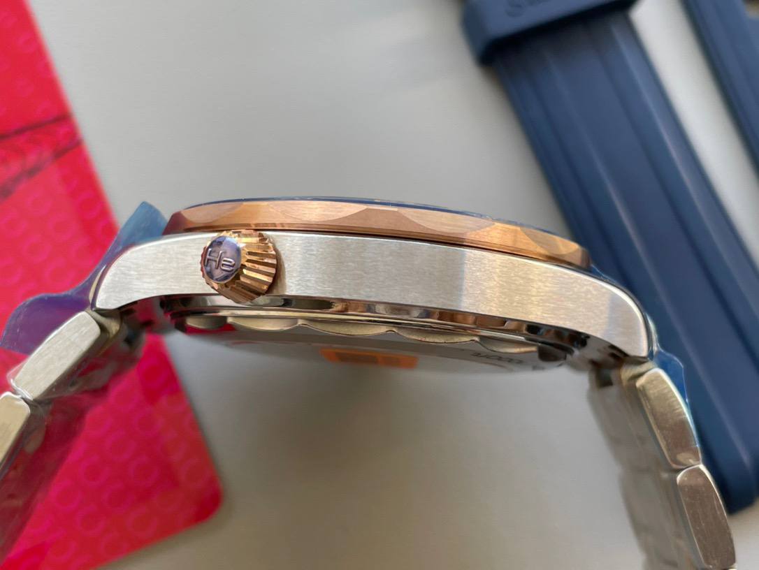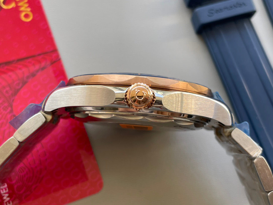 VS新品:新海马300M间玫金蓝面。选对版本很重要。VS版本和正品在12点位外圈口带有贵金属印记:AU750 、狗头标 、天平秤 、logo,可以看是否有这个印记区分出是VS/市面版本。买家、卖家都不用担心打脸的版本。直径42mm自动8800机芯,黑摆轮陶瓷面盘,陶瓷表圈。