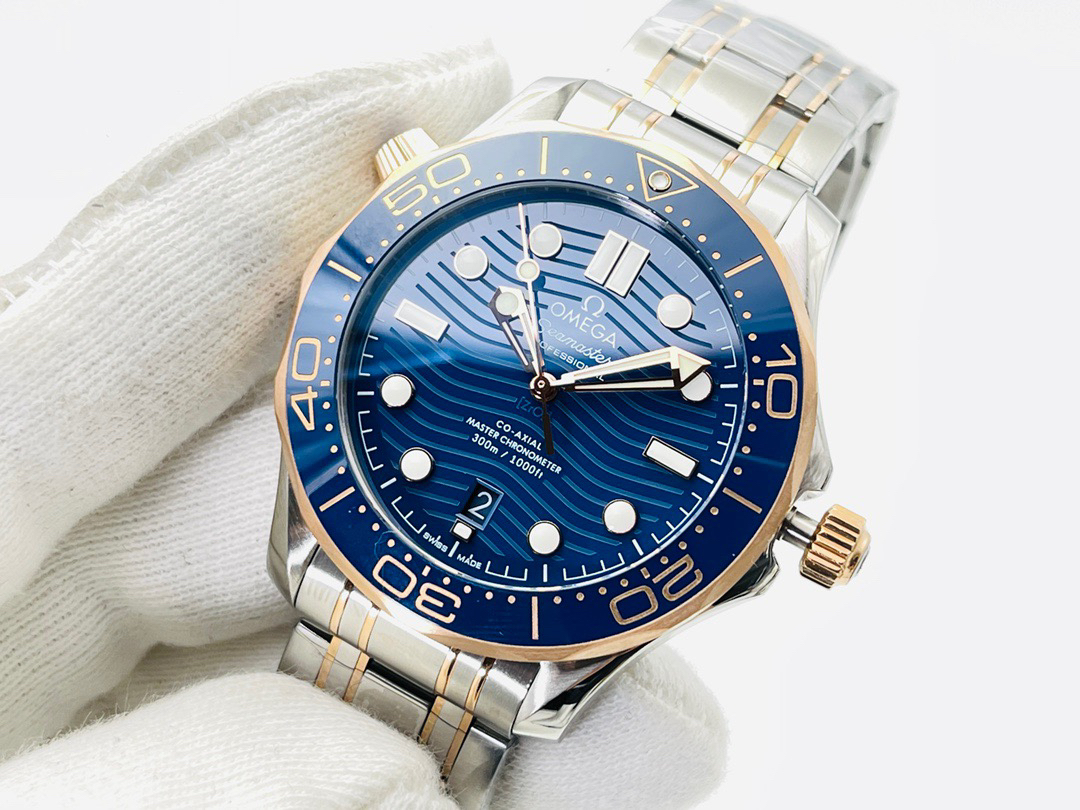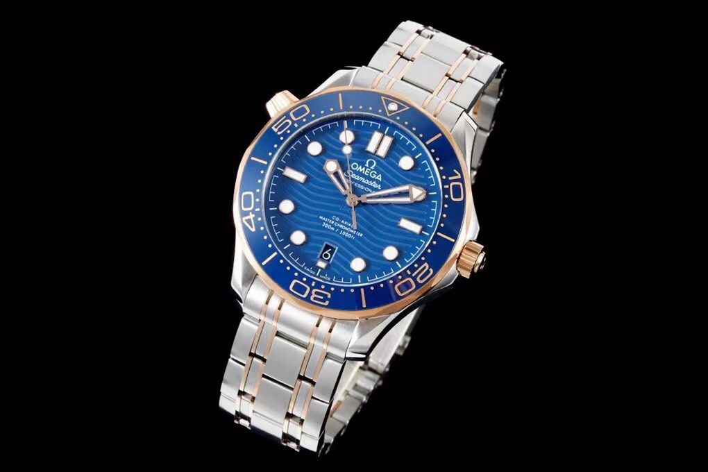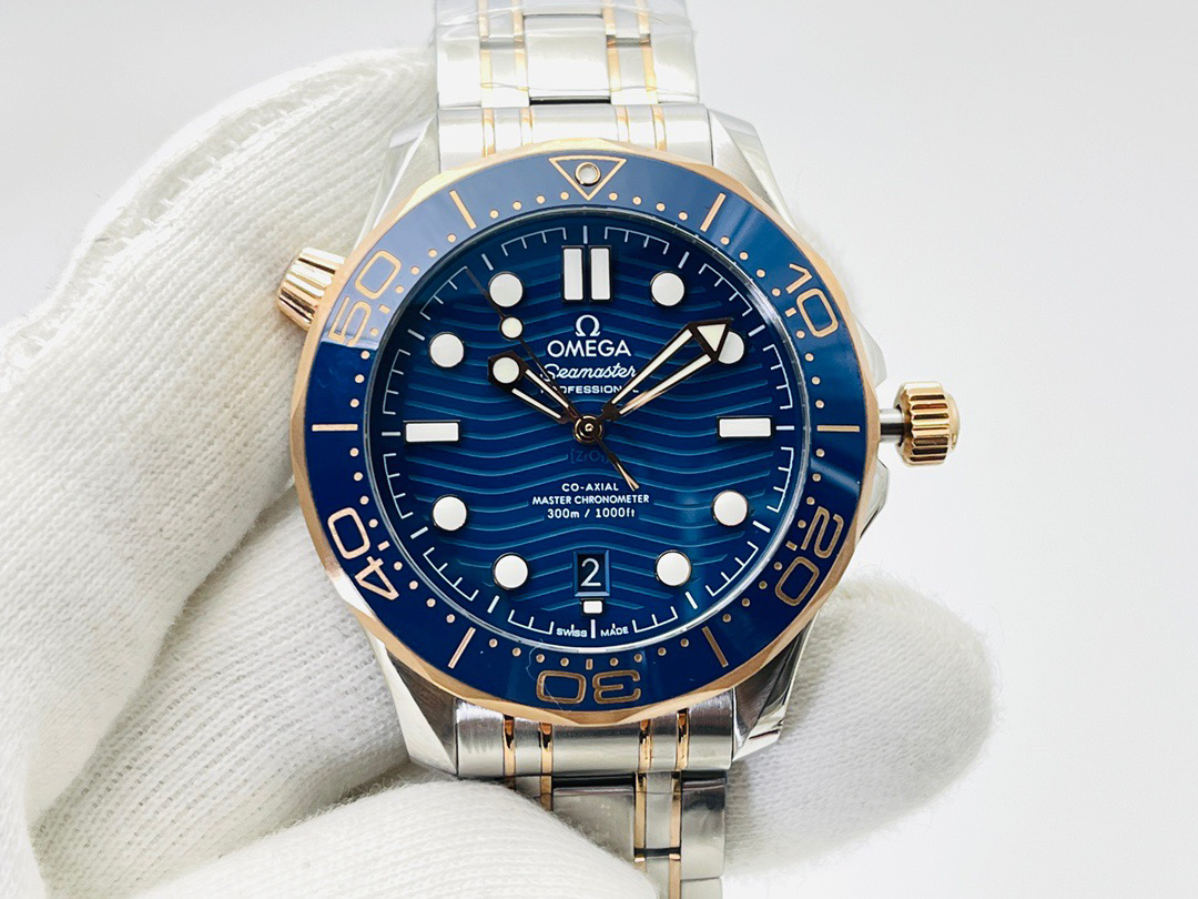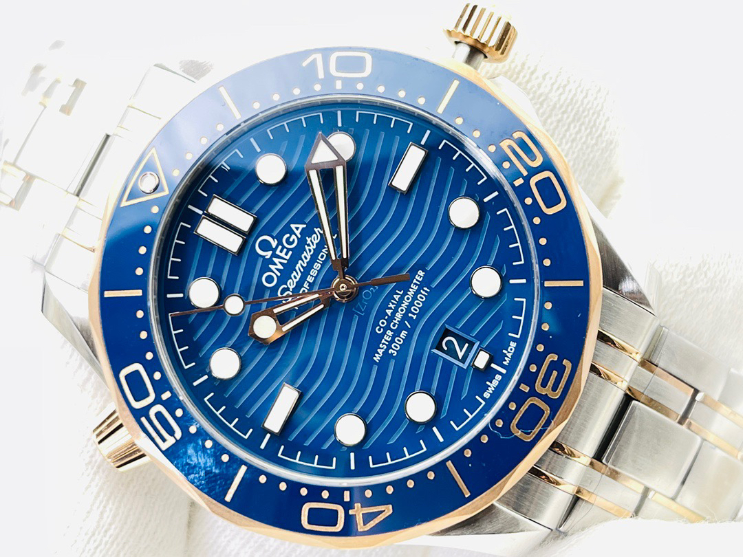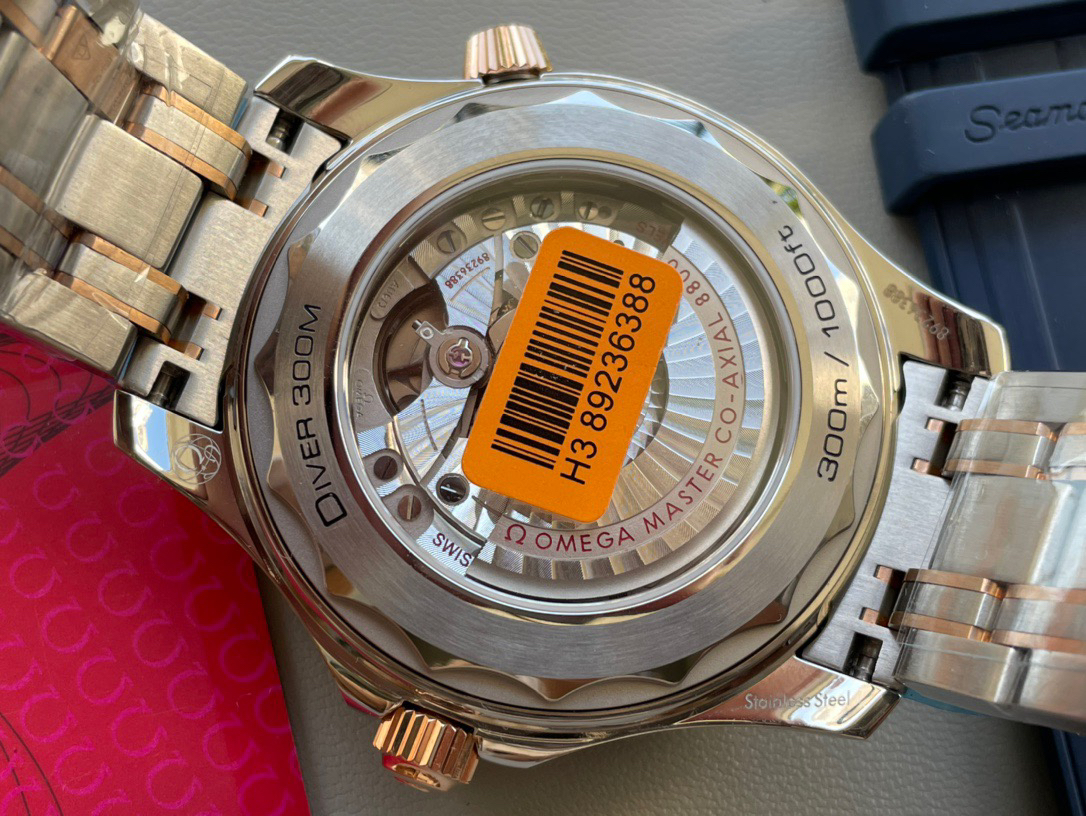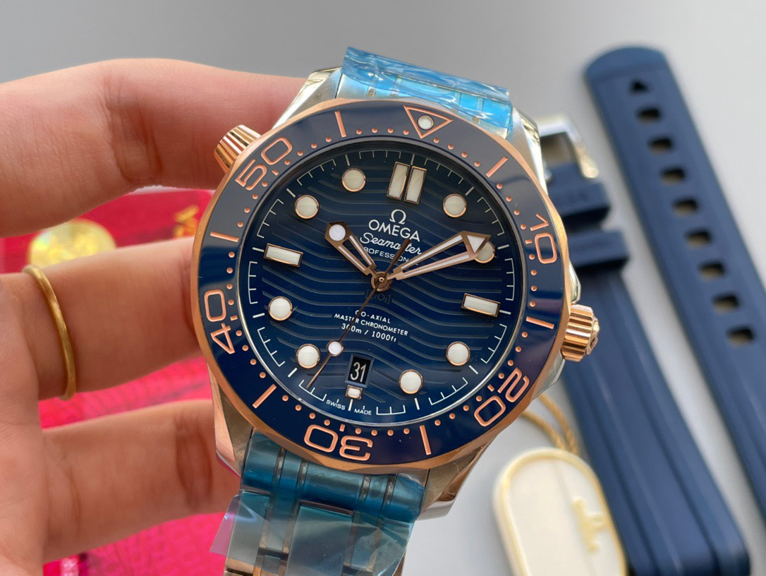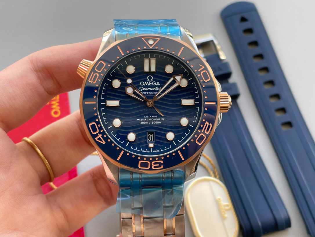 VS新品:新海马300M间玫金蓝面。选对版本很重要。VS版本和正品在12点位外圈口带有贵金属印记:AU750 、狗头标 、天平秤 、logo,可以看是否有这个印记区分出是VS/市面版本。买家、卖家都不用担心打脸的版本。直径42mm自动8800机芯,黑摆轮陶瓷面盘,陶瓷表圈。