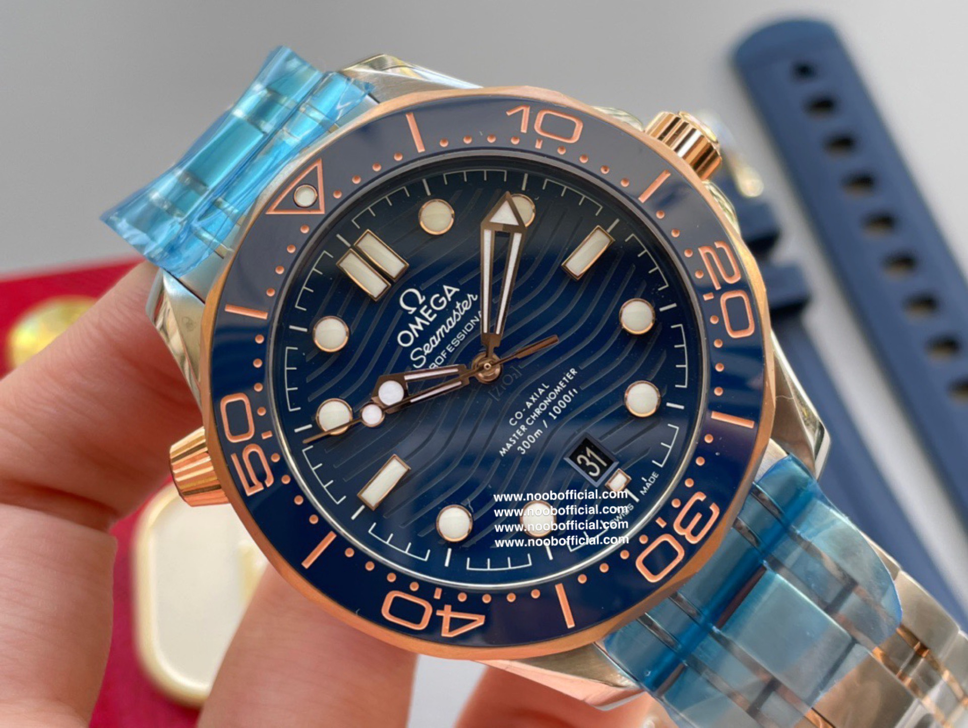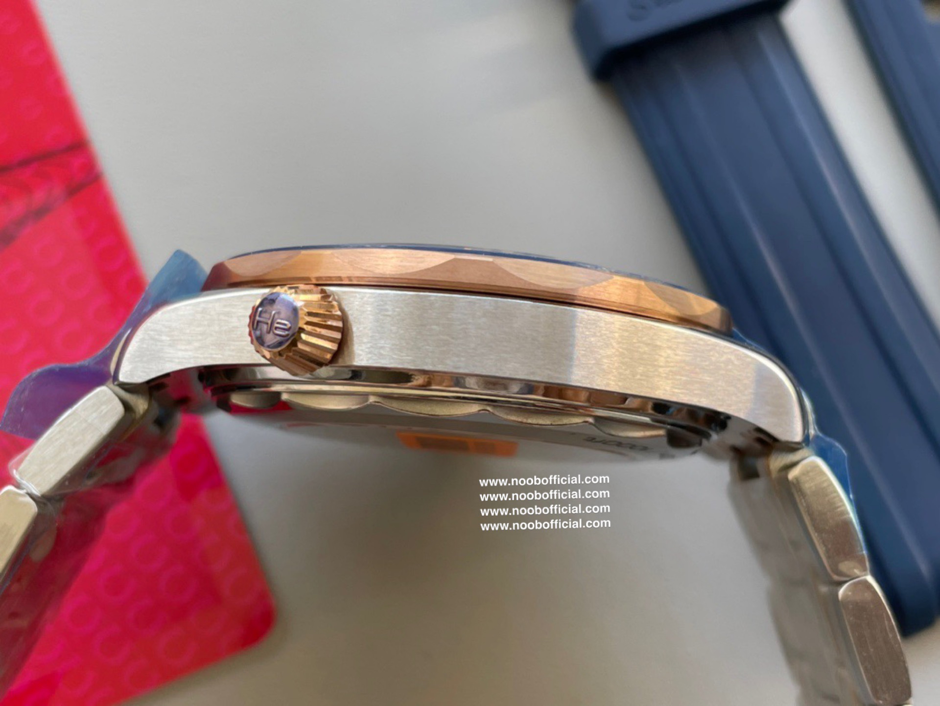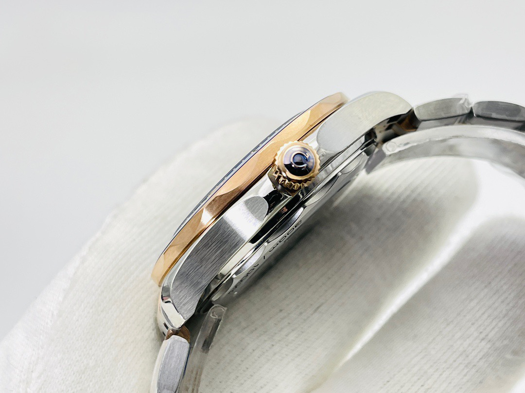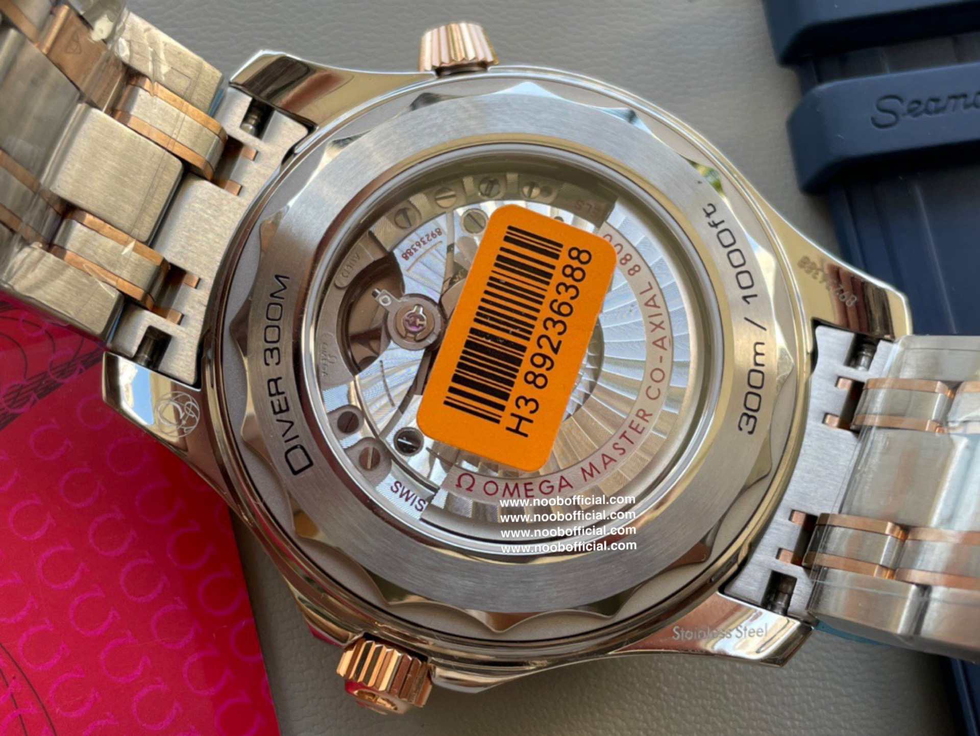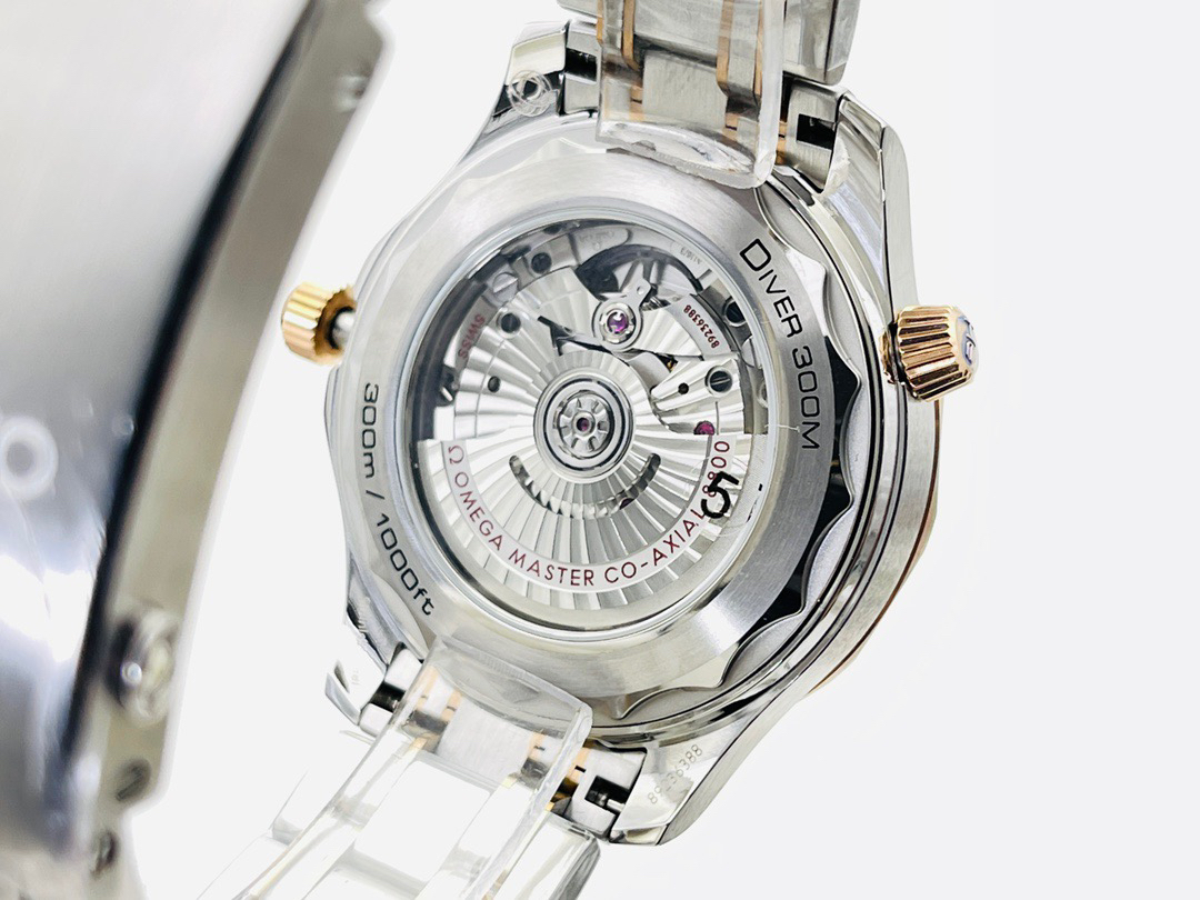 VS新品:新海马300M间玫金蓝面。选对版本很重要。VS版本和正品在12点位外圈口带有贵金属印记:AU750 、狗头标 、天平秤 、logo,可以看是否有这个印记区分出是VS/市面版本。买家、卖家都不用担心打脸的版本。直径42mm自动8800机芯,黑摆轮陶瓷面盘,陶瓷表圈。