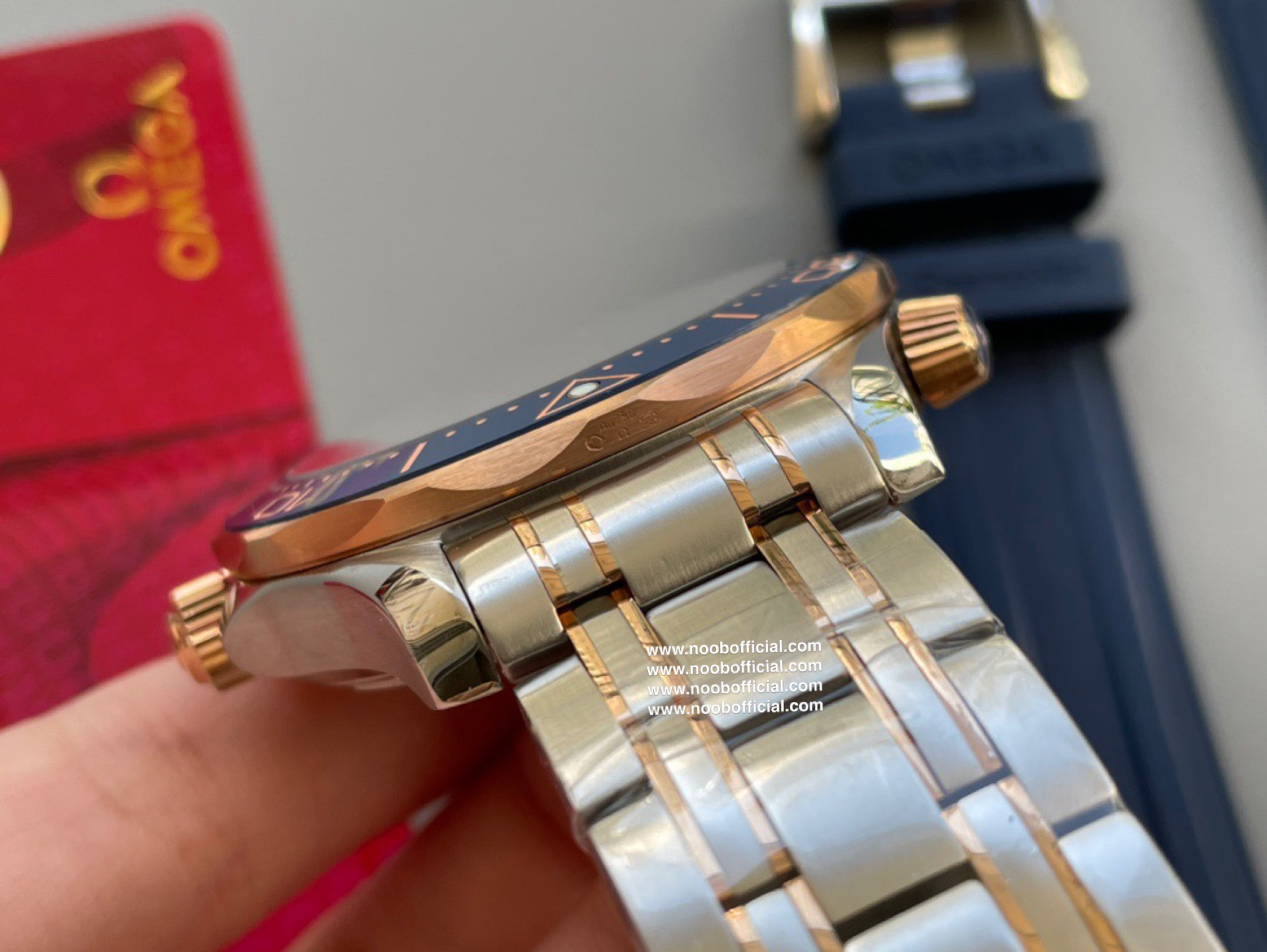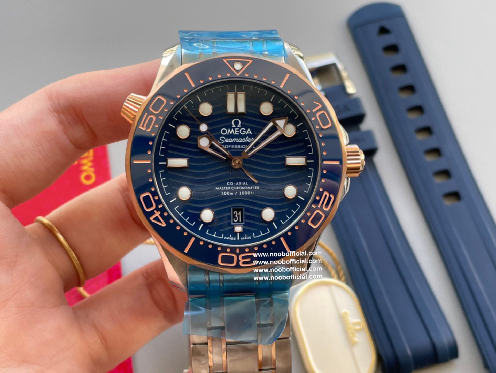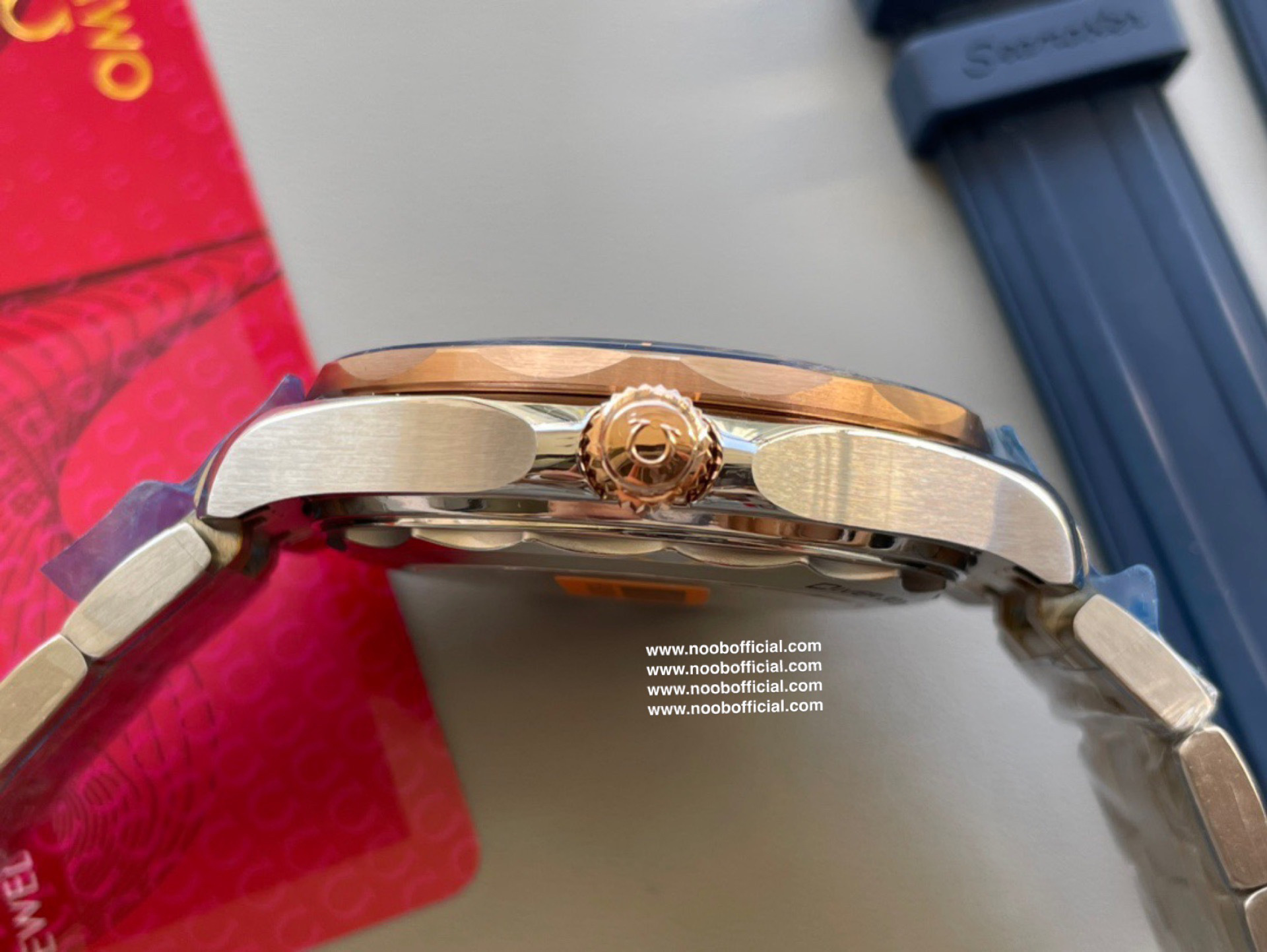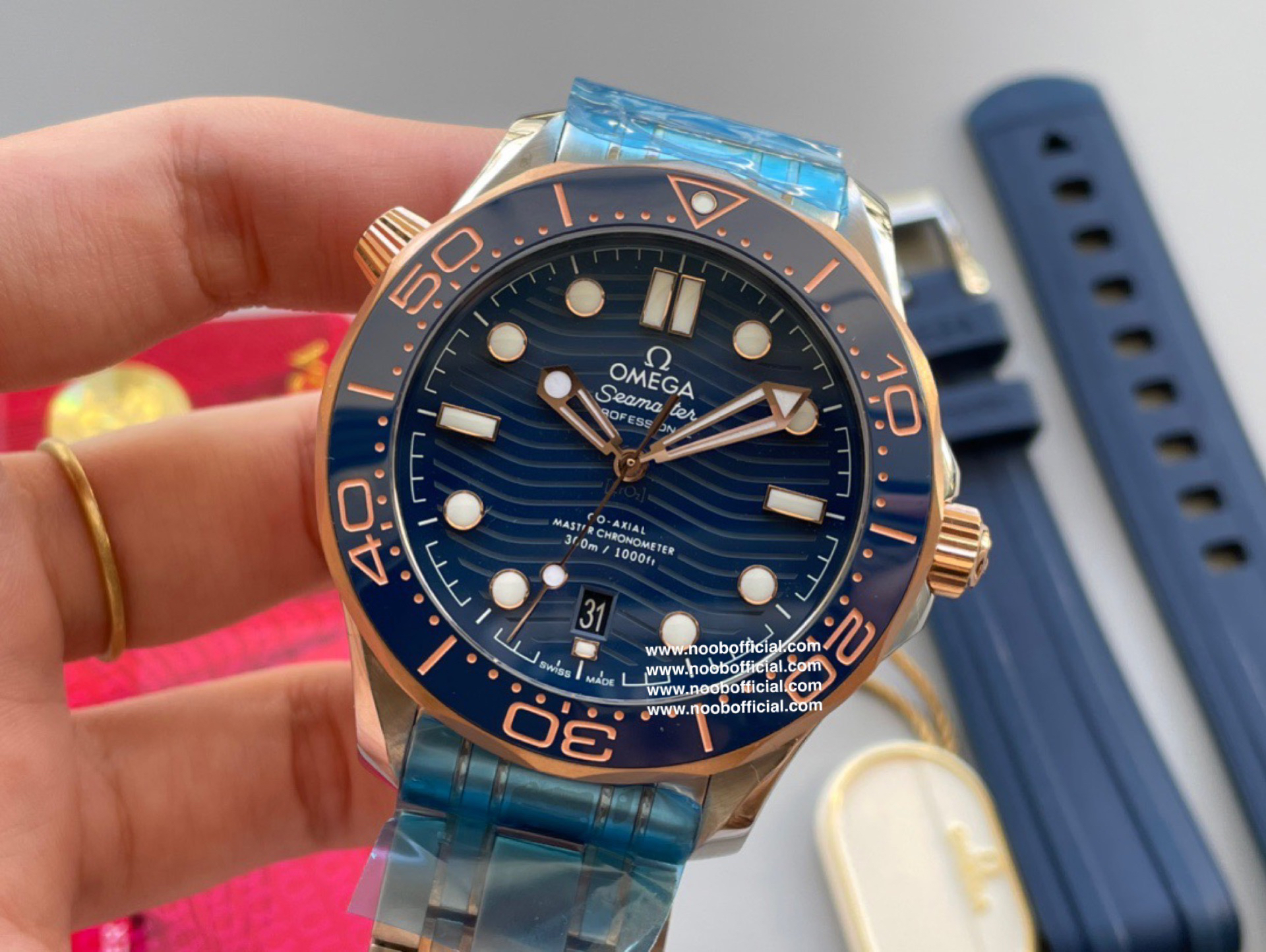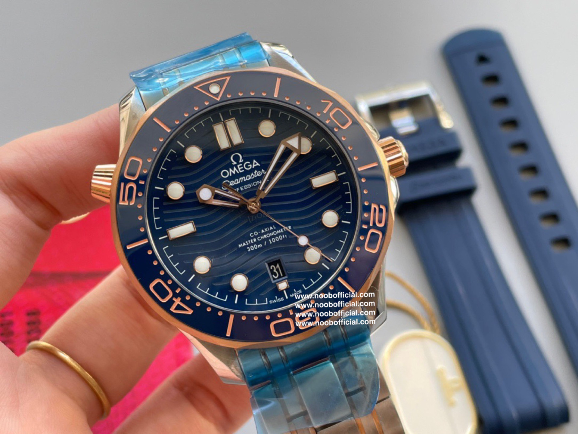VS新品:新海马300M间玫金蓝面。选对版本很重要。VS版本和正品在12点位外圈口带有贵金属印记:AU750 、狗头标 、天平秤 、logo,可以看是否有这个印记区分出是VS/市面版本。买家、卖家都不用担心打脸的版本。直径42mm自动8800机芯,黑摆轮陶瓷面盘,陶瓷表圈。