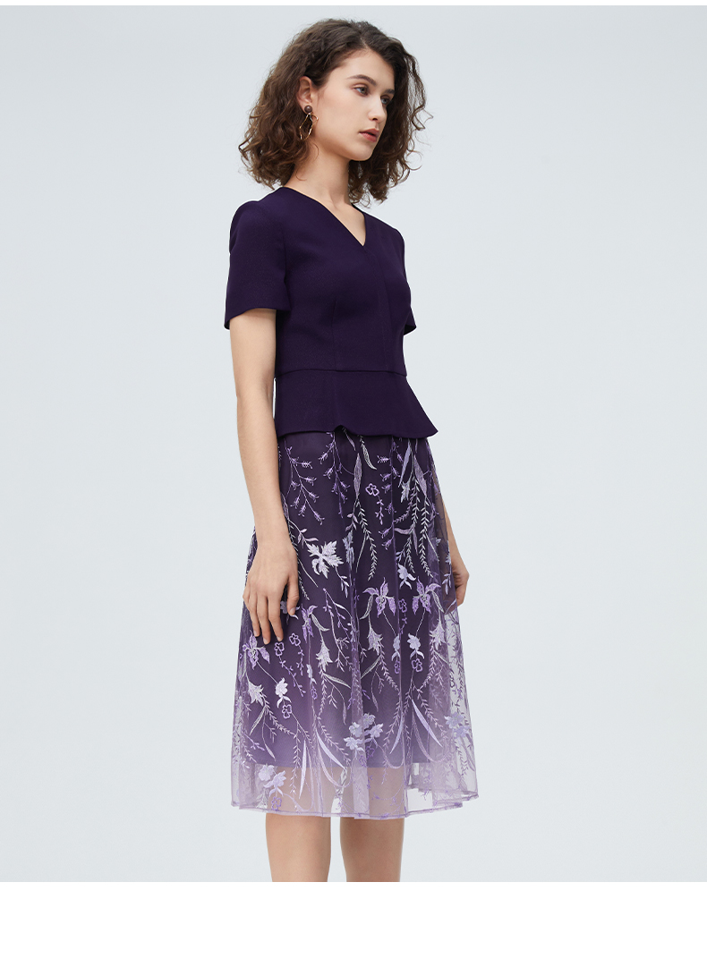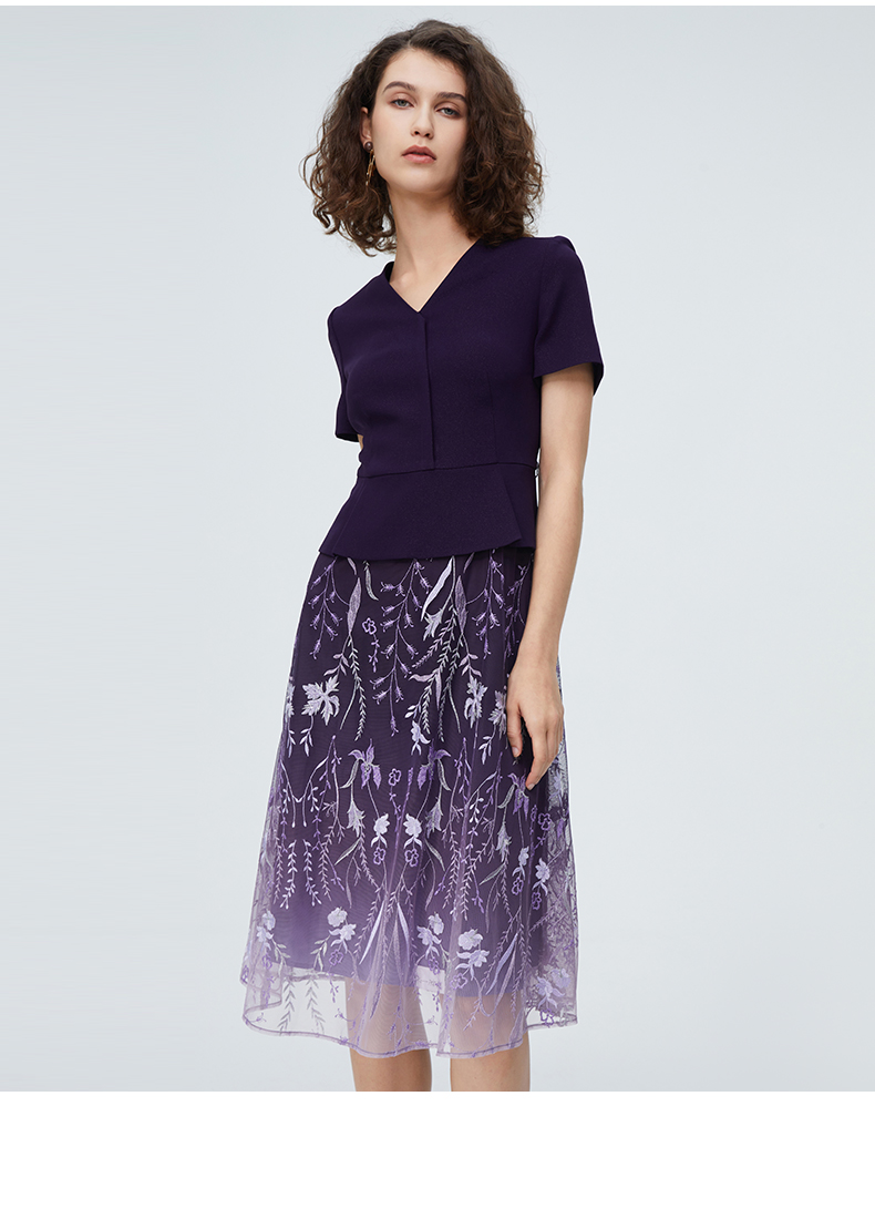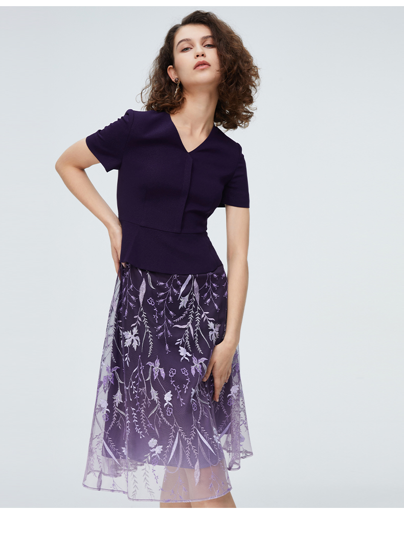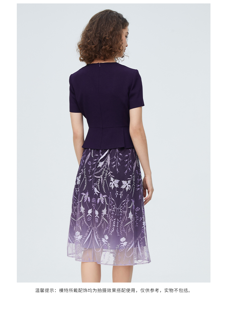 皮尔卡丹女装秋季新款一步裙紫色九分袖圆领连衣裙P93DL20Z0