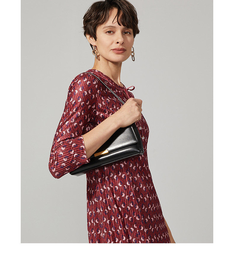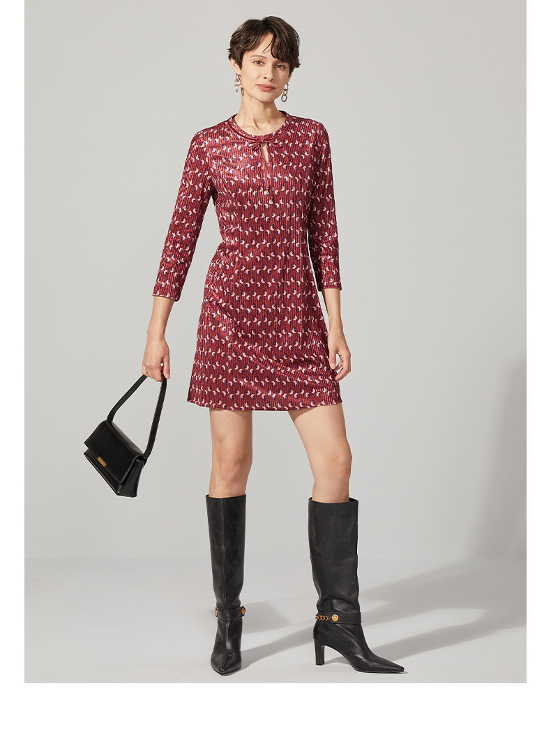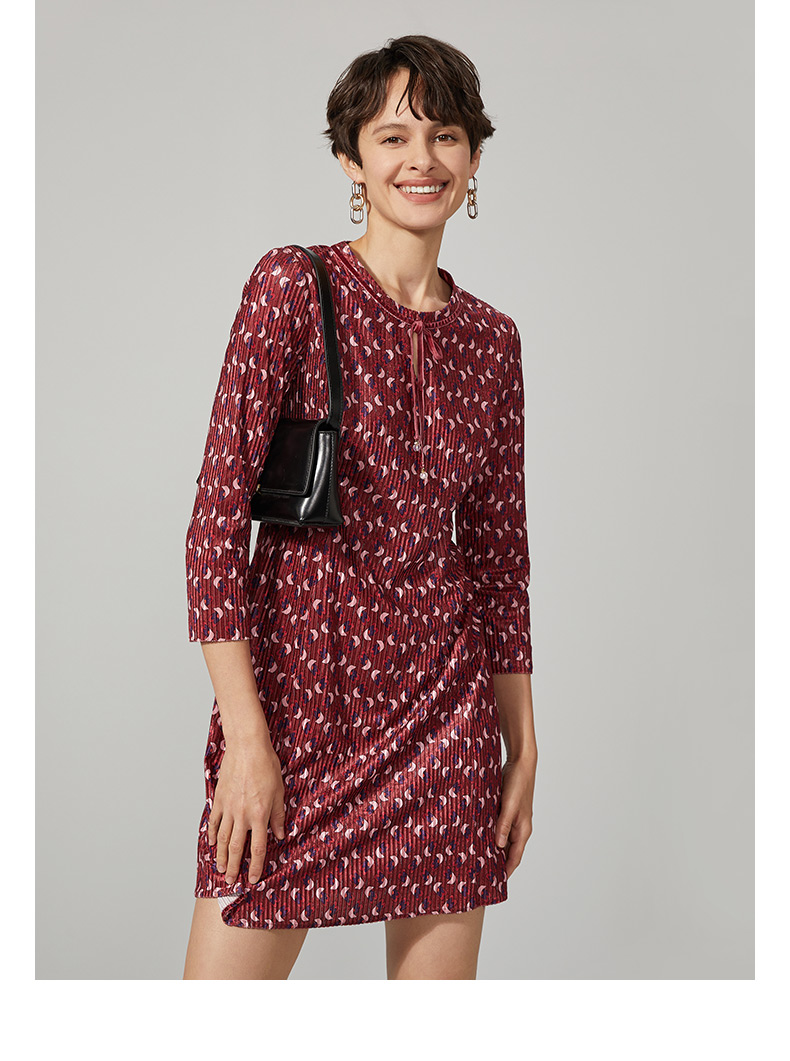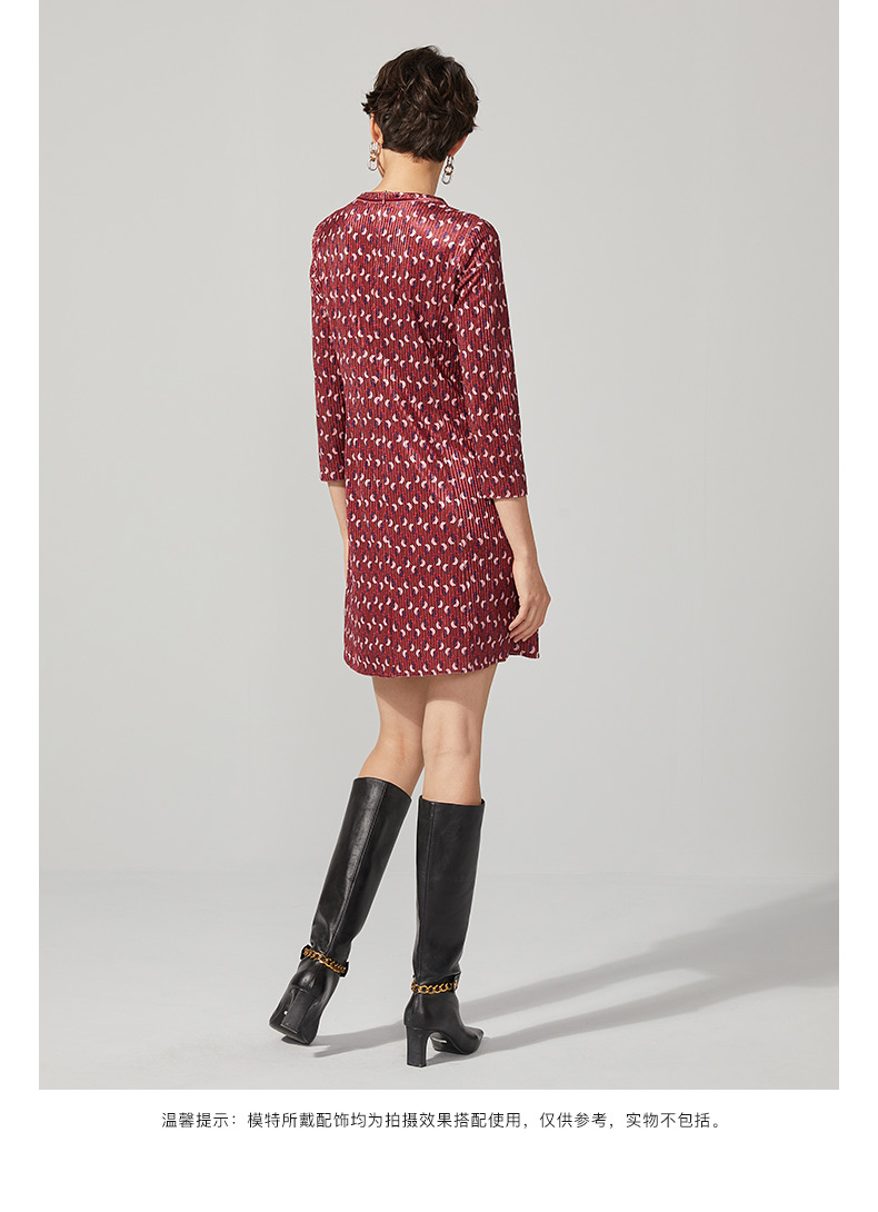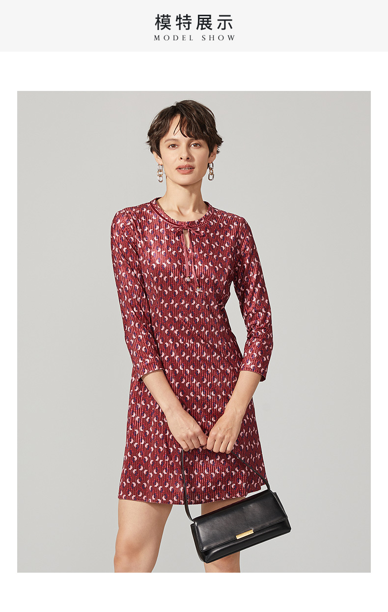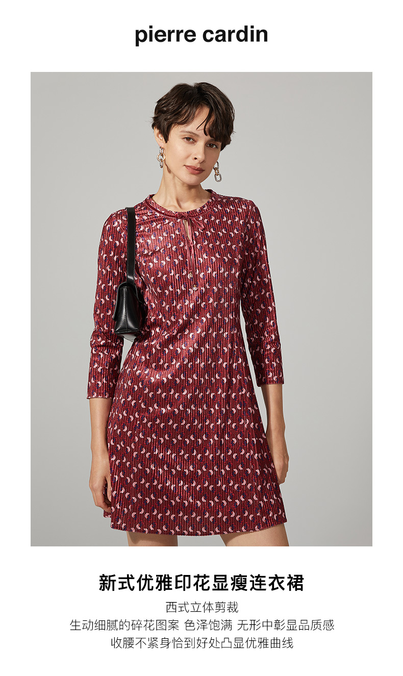 皮尔卡丹女装冬季新款红色圆领系带波点连衣裙A字裙P94DL25R3