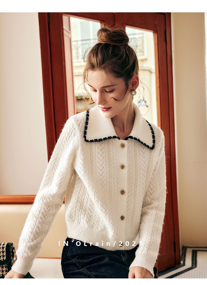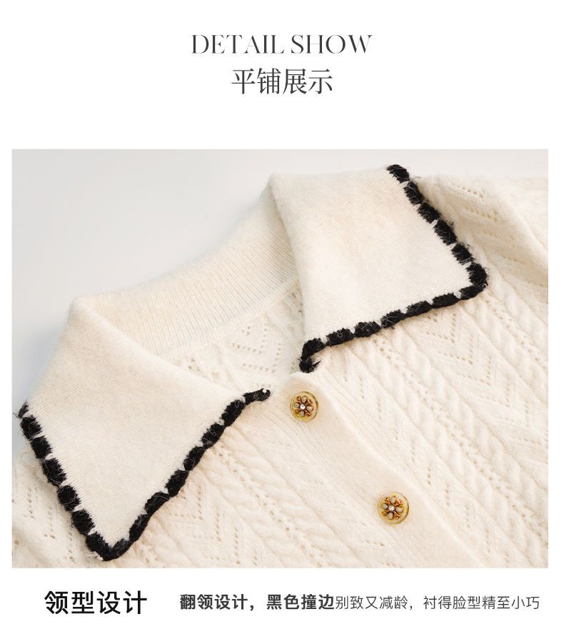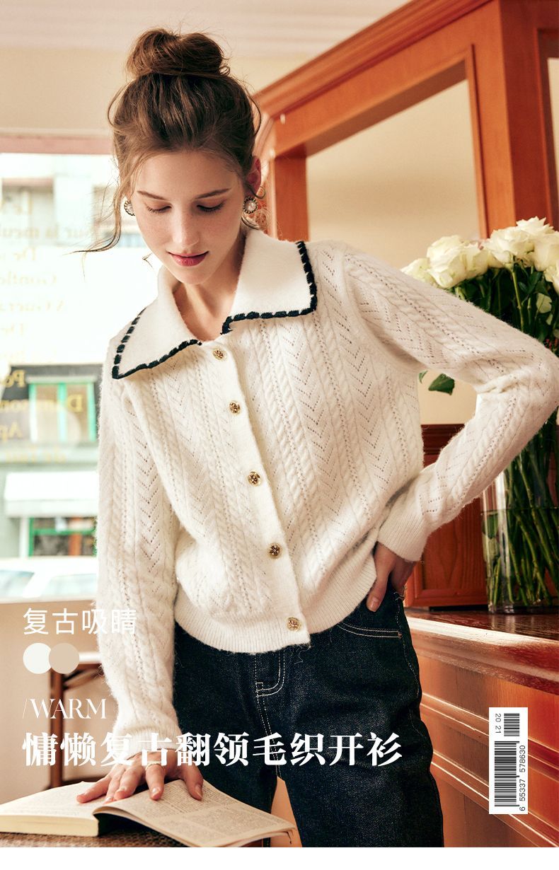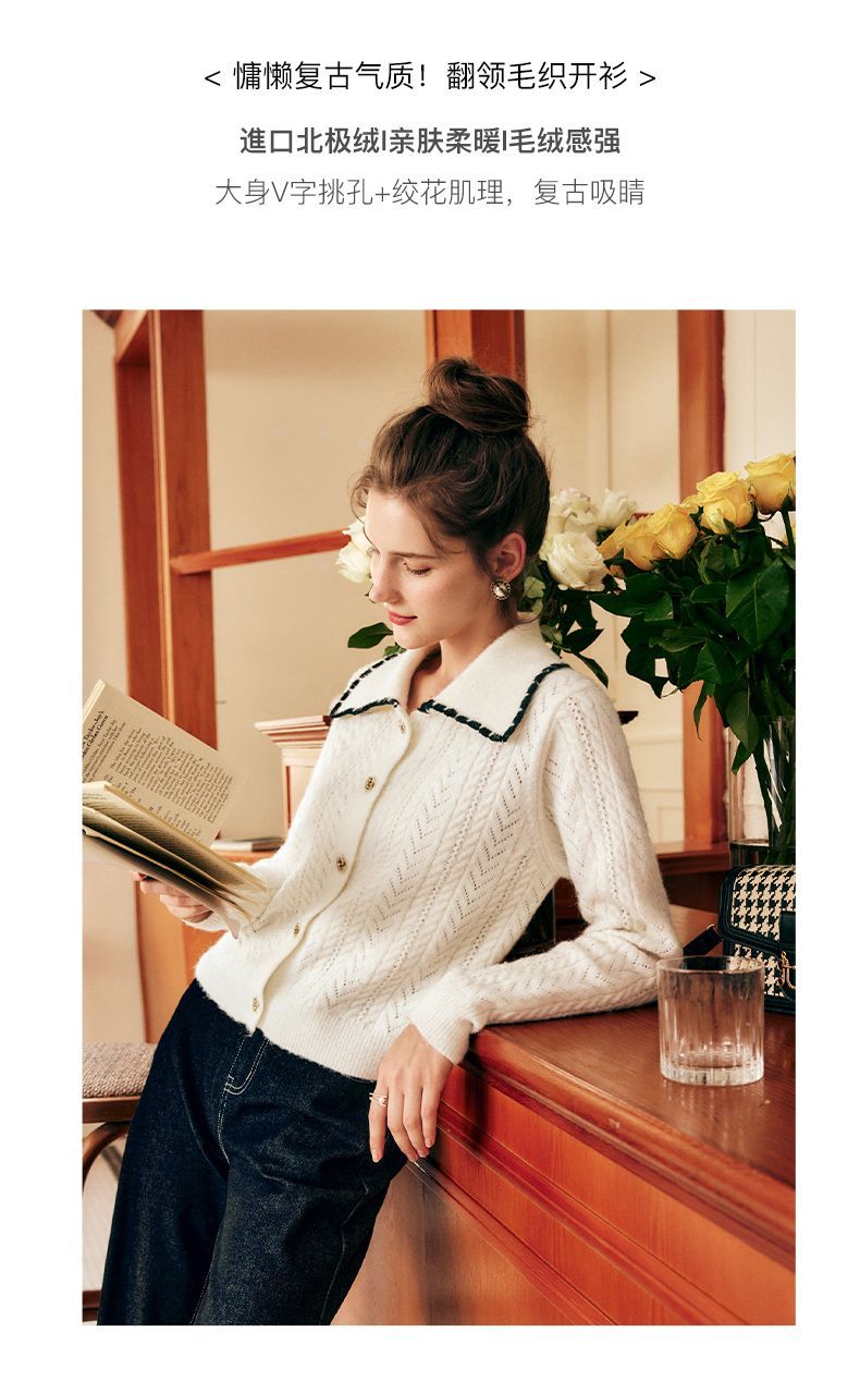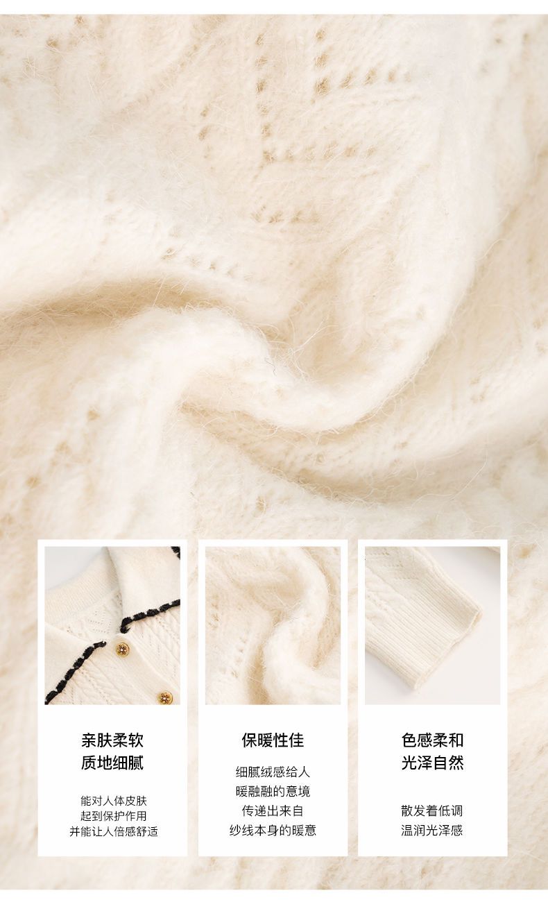 OLrain欧芮儿法式杏色毛衣女秋季2022新款慵懒风复古翻领针织开衫