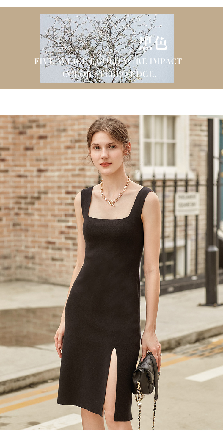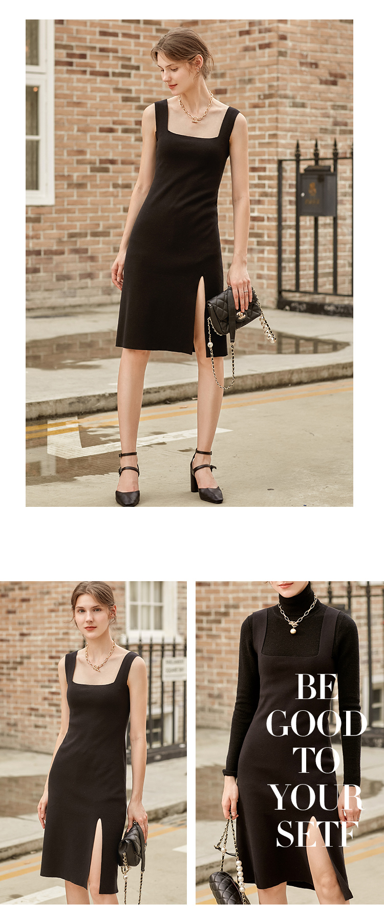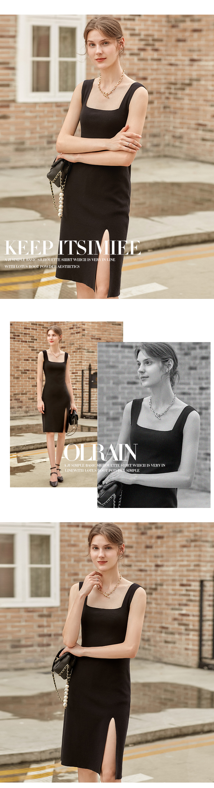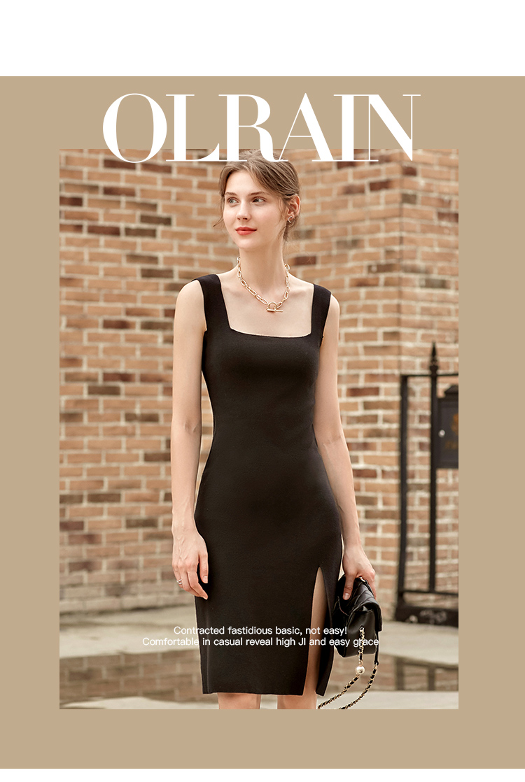欧芮儿黑色U领毛织连衣裙短裙女2022春装性感开叉小黑裙
