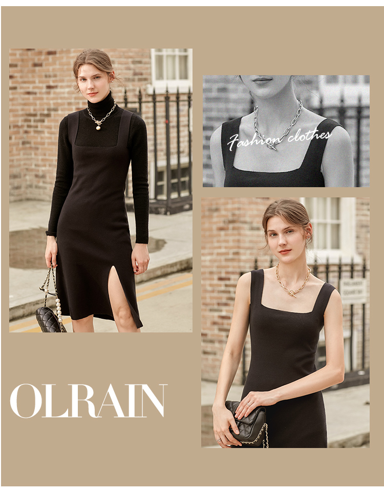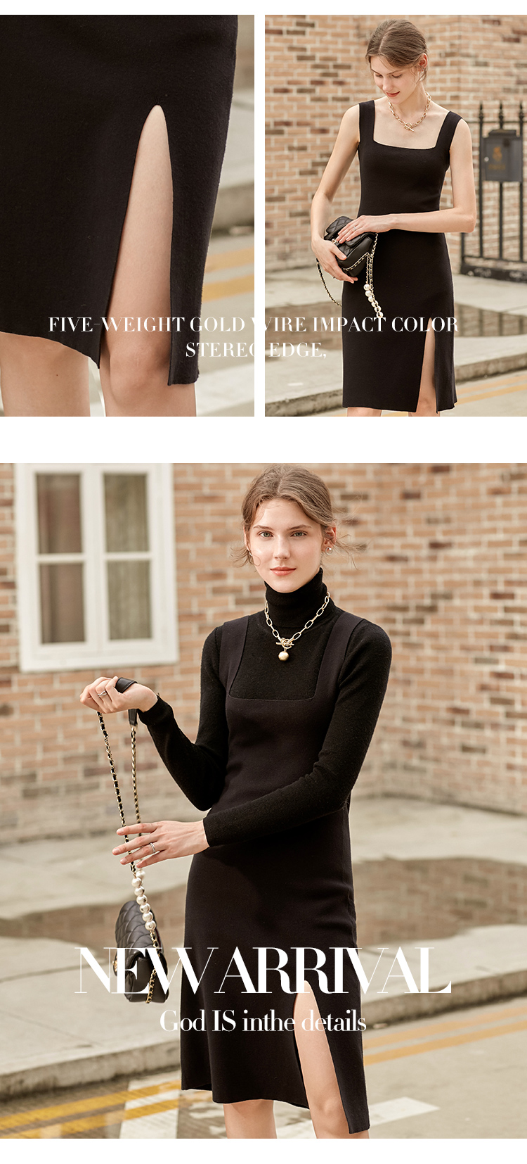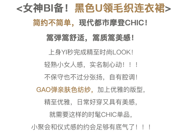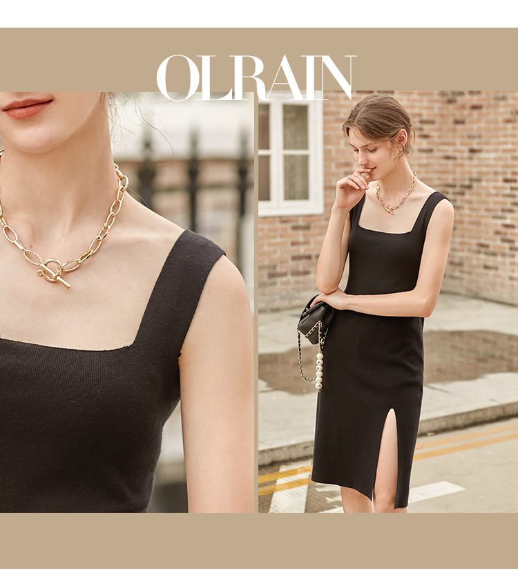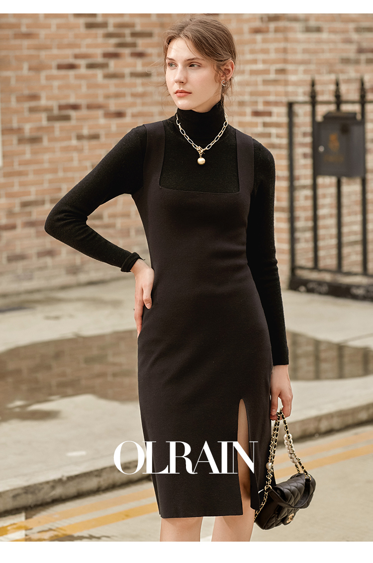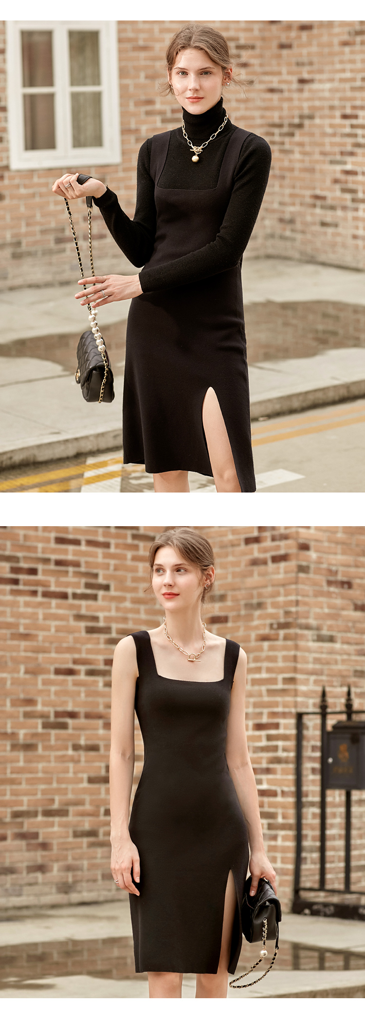 欧芮儿黑色U领毛织连衣裙短裙女2022春装性感开叉小黑裙