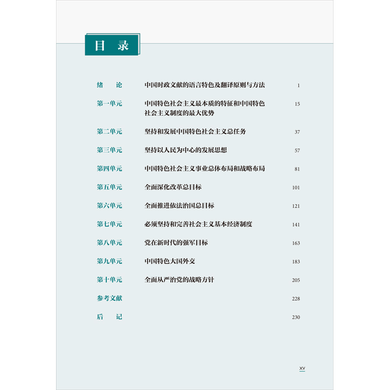 《汉日翻译教程》分为绪论和10个主题单元。绪论介绍中国时政文献的语言特征、中国时政文献的翻译原则和中国时政文献的翻译方法。第一至第十单元为主题单元,每个主题单元探讨习近平新时代中国特色社会主义思想的一个重要方面,依次是:1)中国特色社会主义最本质的特征和中国特色社会主义制度的最大优势;2)坚持和发展中国特色社会主义总任务;3)坚持以人民为中心的发展思想;4)中国特色社会主义事业总体布局和战略布局;5)全面深化改革总目标;6)全面推进依法治国总目标;7)必须坚持和完善社会主义基本经济制度;8)党在新时代的强军目标;9)中国特色大国外交;10)全面从严治党的战略方针。