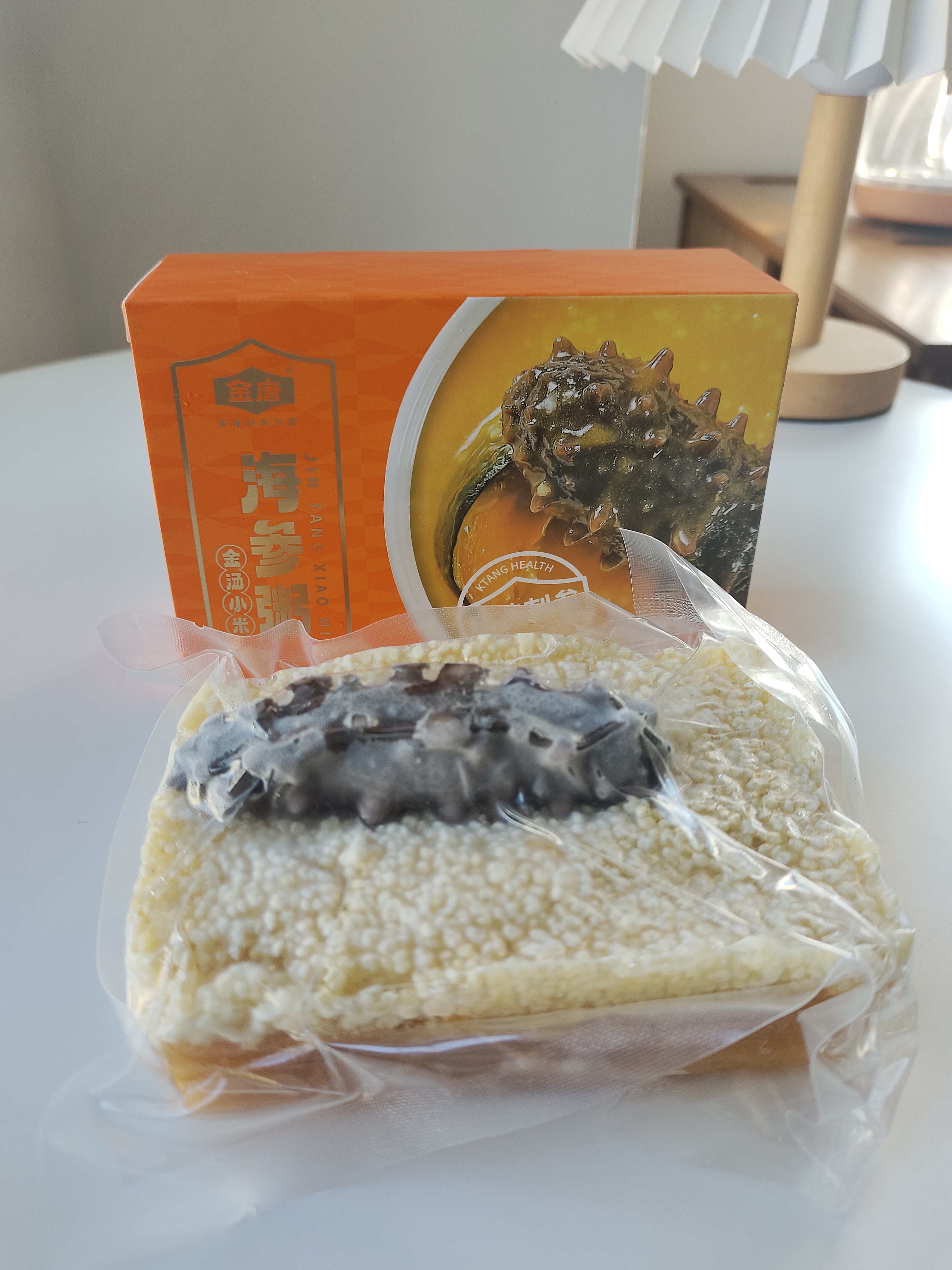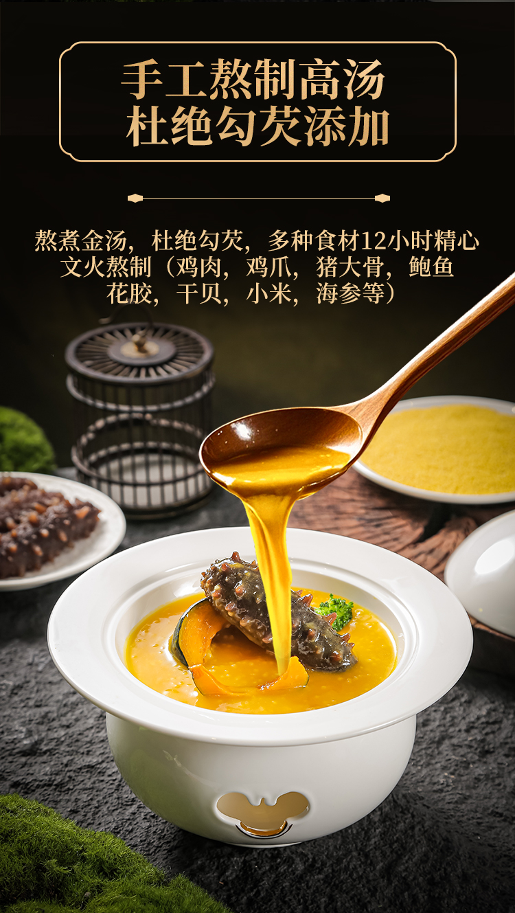 【配料】高汤(饮用水、南瓜、鸡肉、鸡爪、猪大骨、鲍鱼、花胶、干贝、耗油、鸡汁调味料、食用盐、食用淀粉(地瓜粉))、小米、海参