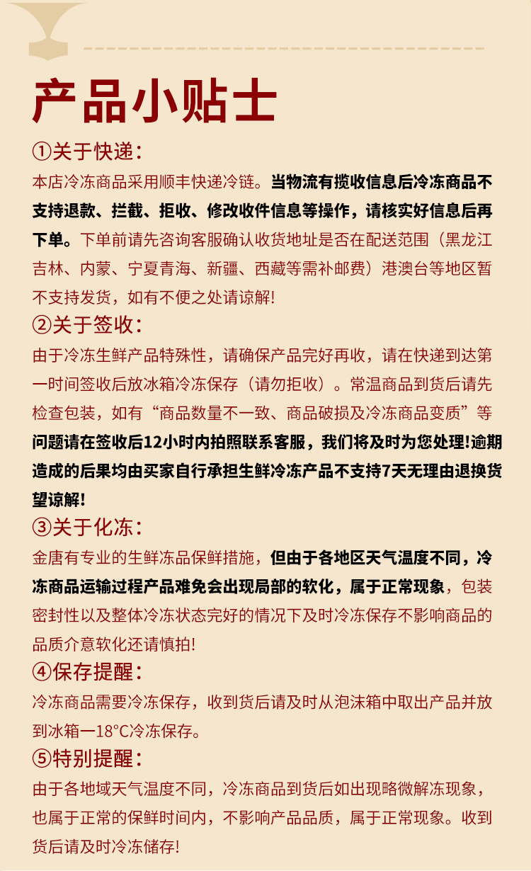 1、冷鲜类产品不可拒收/拦截/改单,非质量问题不退不换,不以个人口味及喜好作售后;