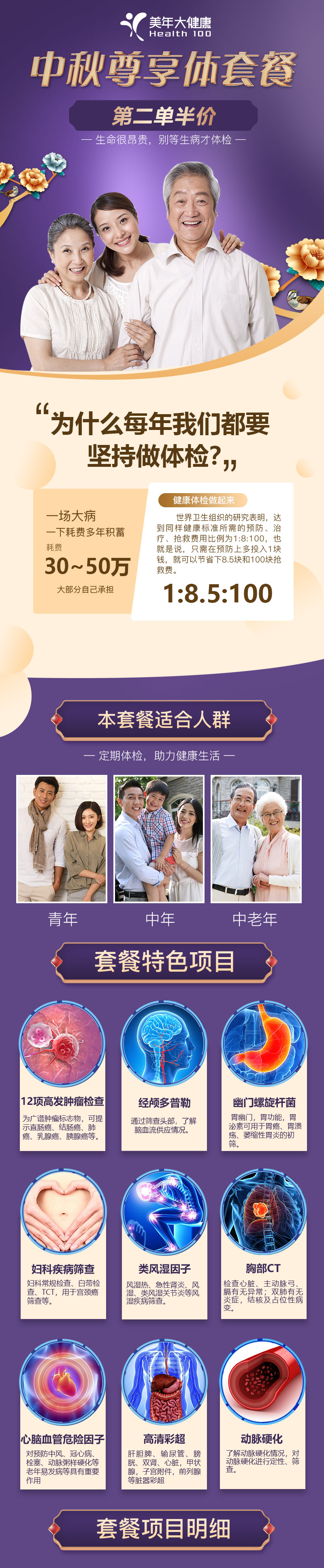 【国庆钜惠,第二单半价】美年大健康 深度精选 性价比折扣套餐 全身体检包含胸部CT、心脑血管检测,颈动脉、心脏多部位彩超、宫颈TCT、12项肿瘤检查、肝肾功能、头部TCD等