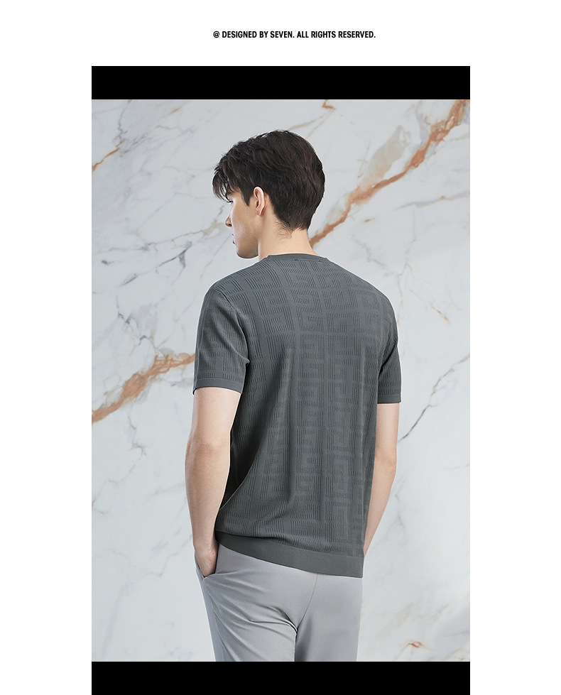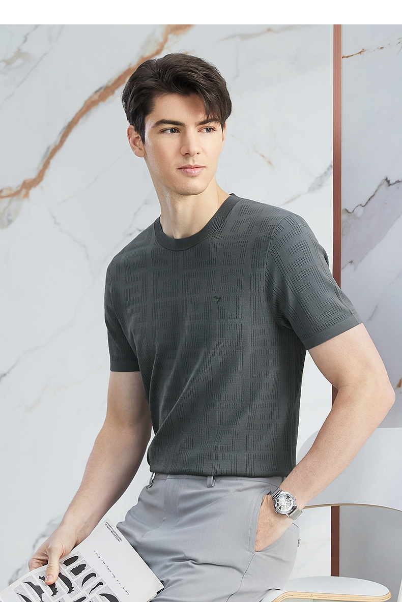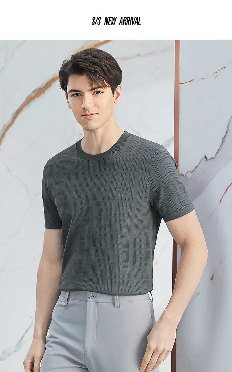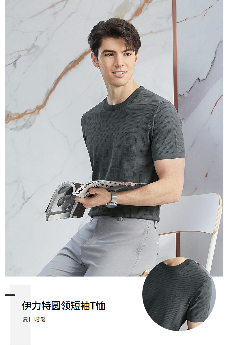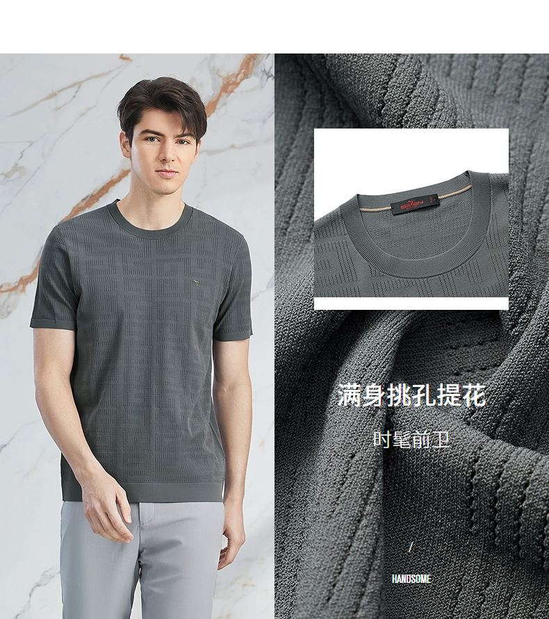 【高端系列】柒牌短袖T恤男夏季新款伊力特透气挑孔提花圆领上衣 126T71870