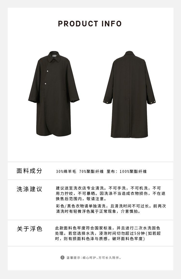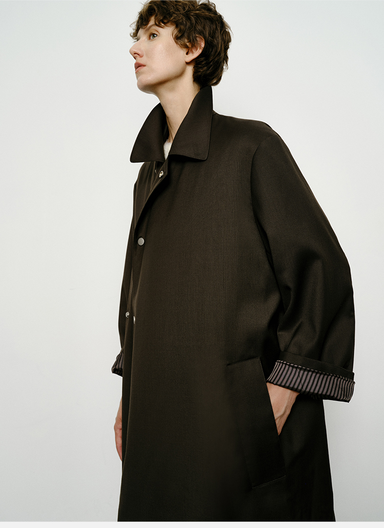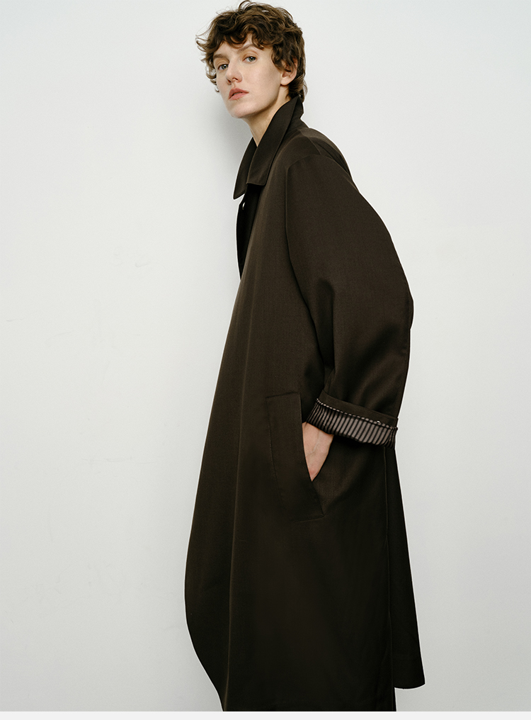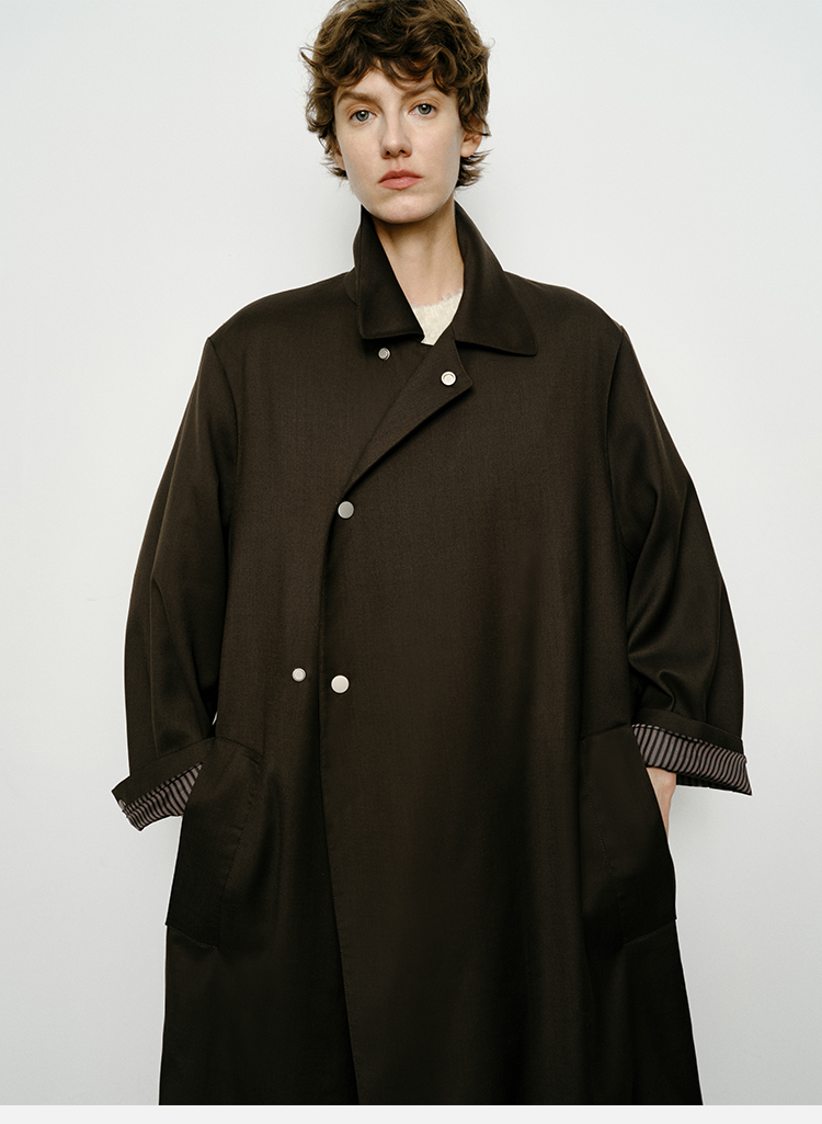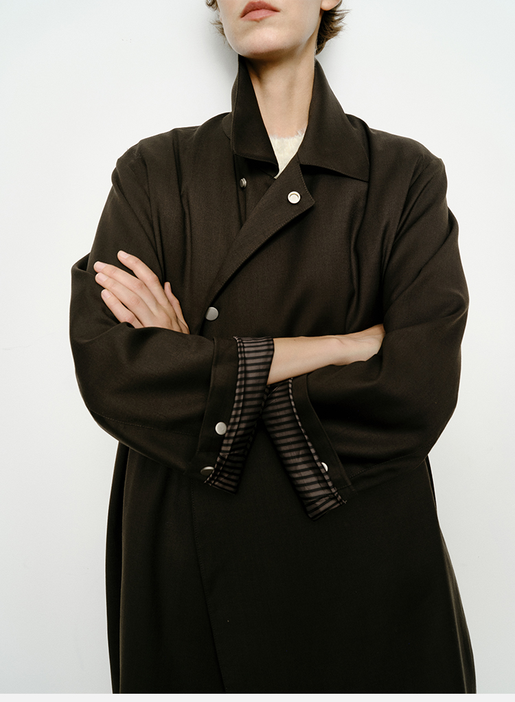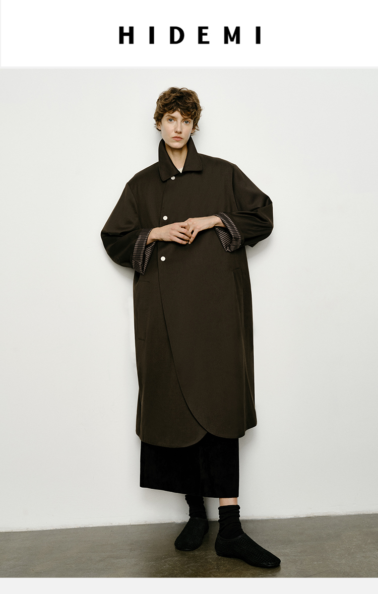 HIDEMI 极简不对称设计感撞钉深棕绿条纹卷边精纺羊毛廓形风衣