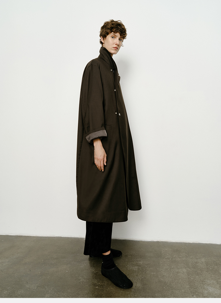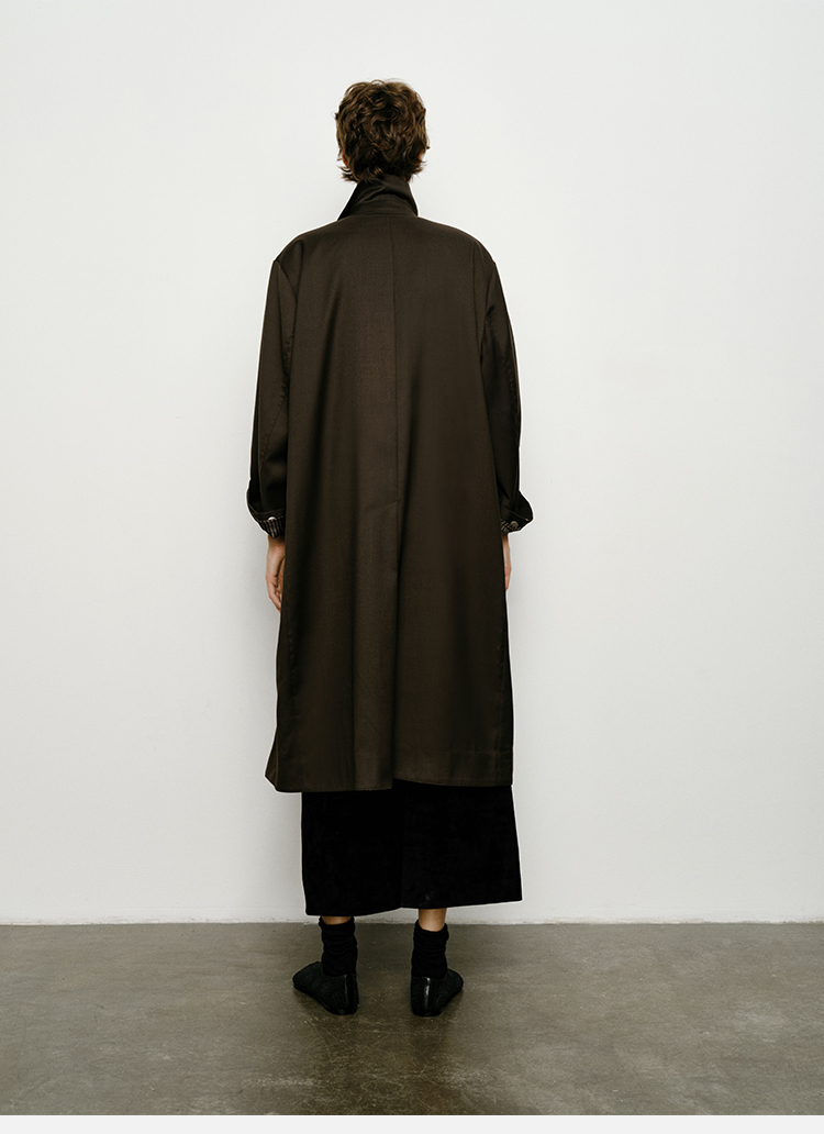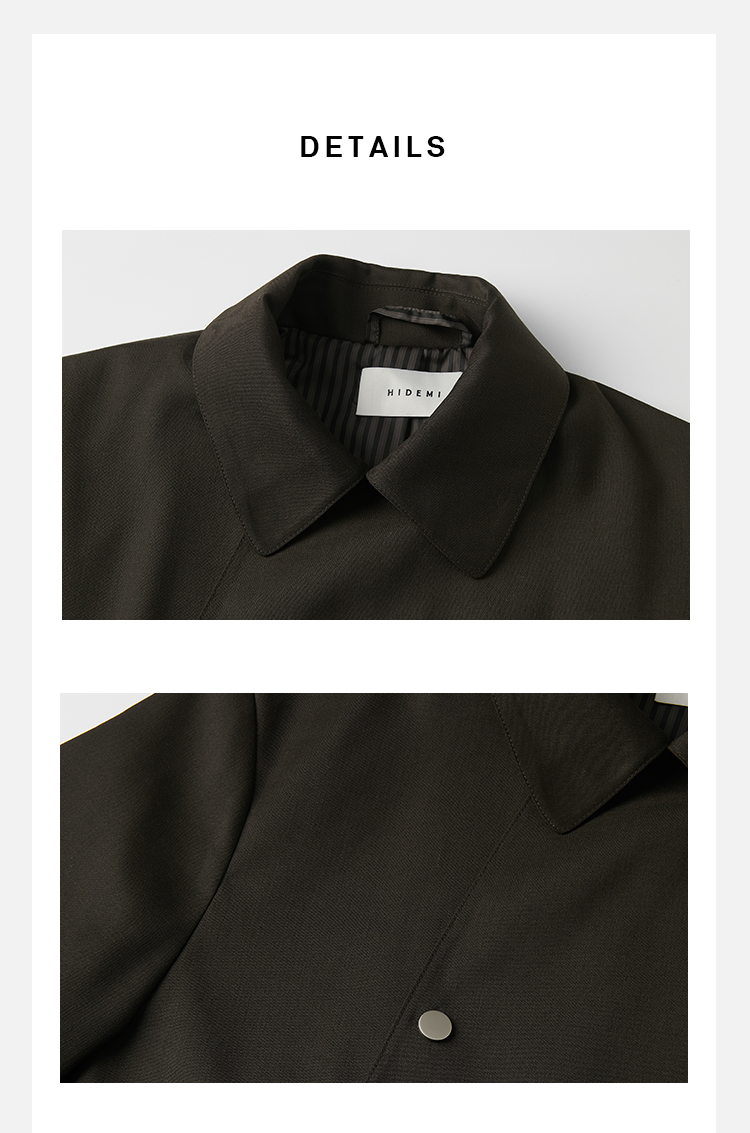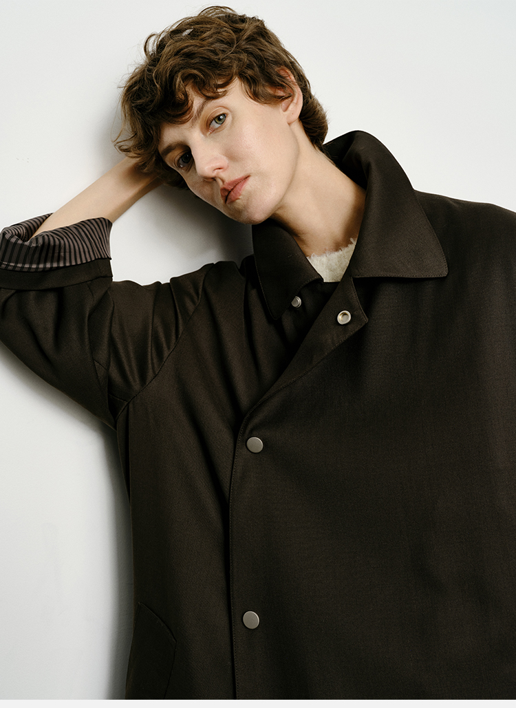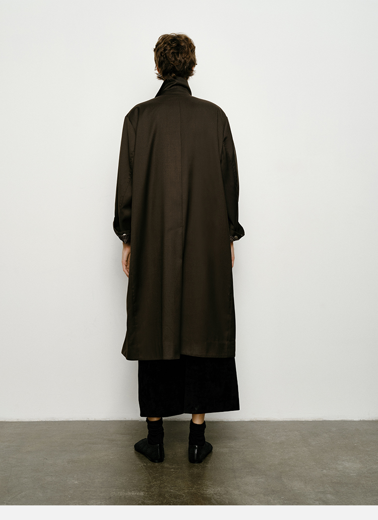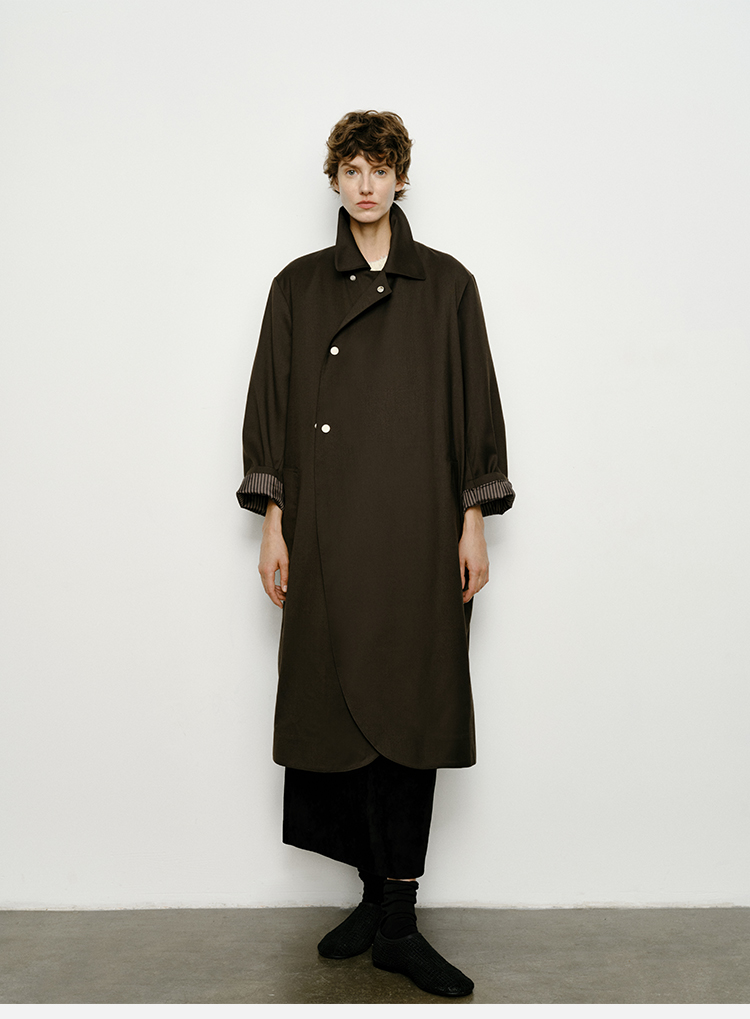 HIDEMI 极简不对称设计感撞钉深棕绿条纹卷边精纺羊毛廓形风衣