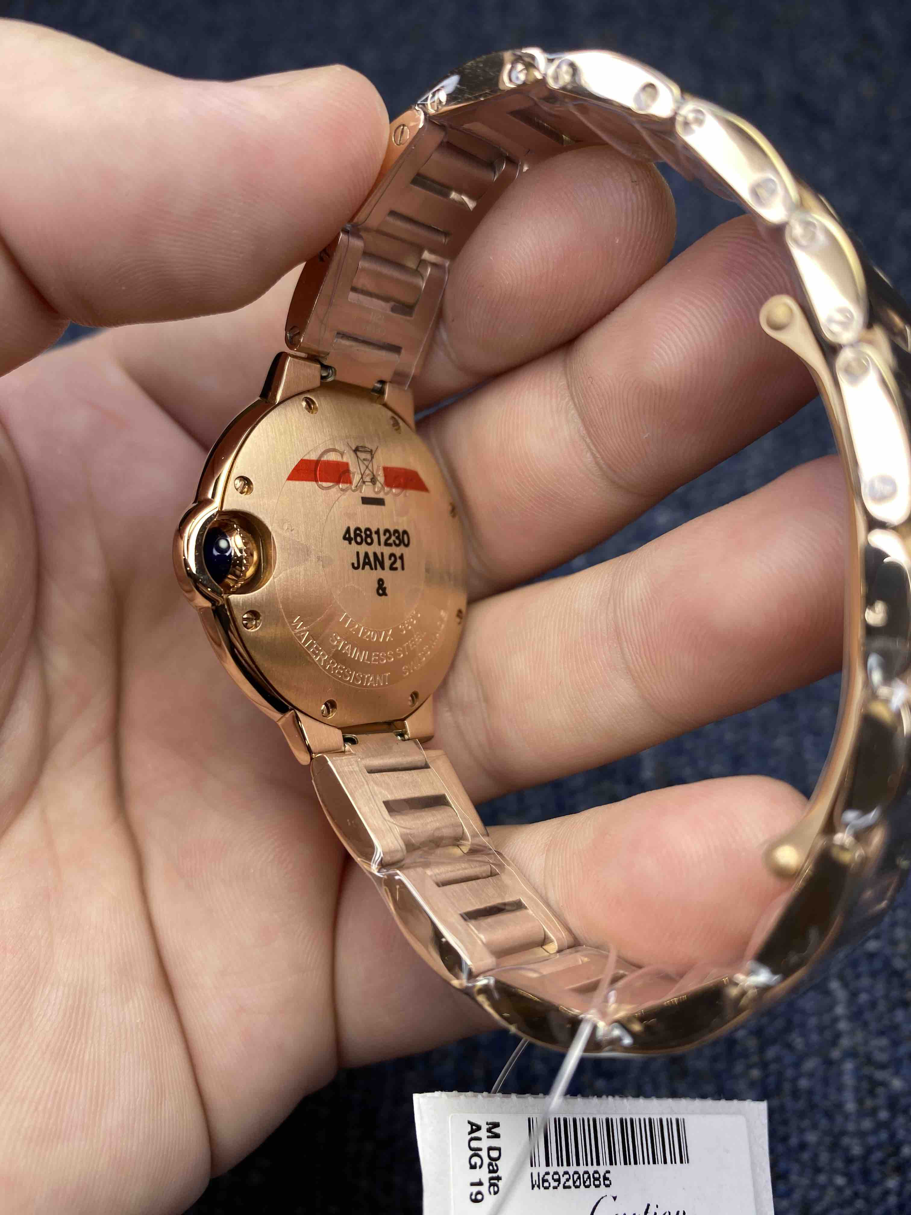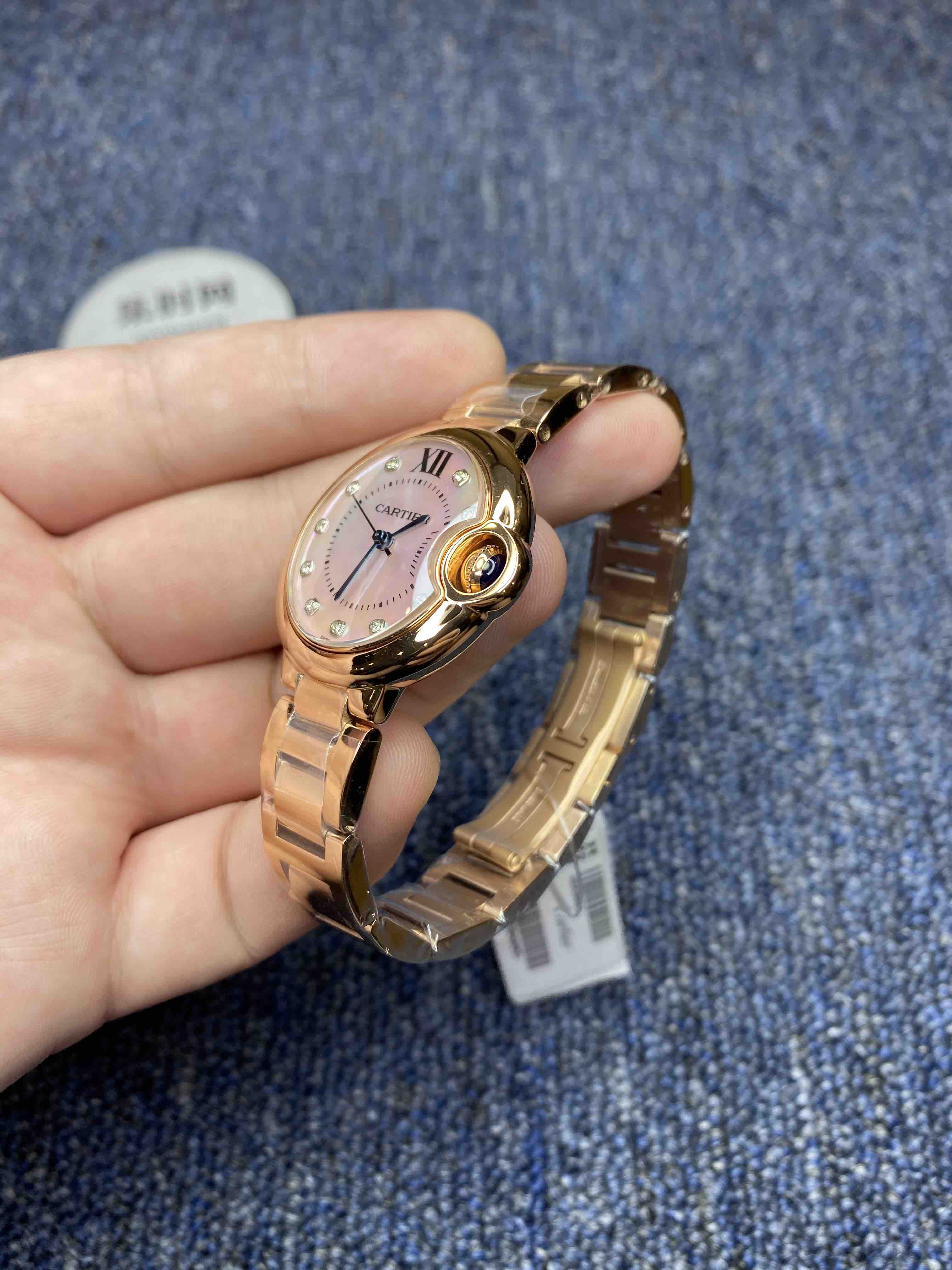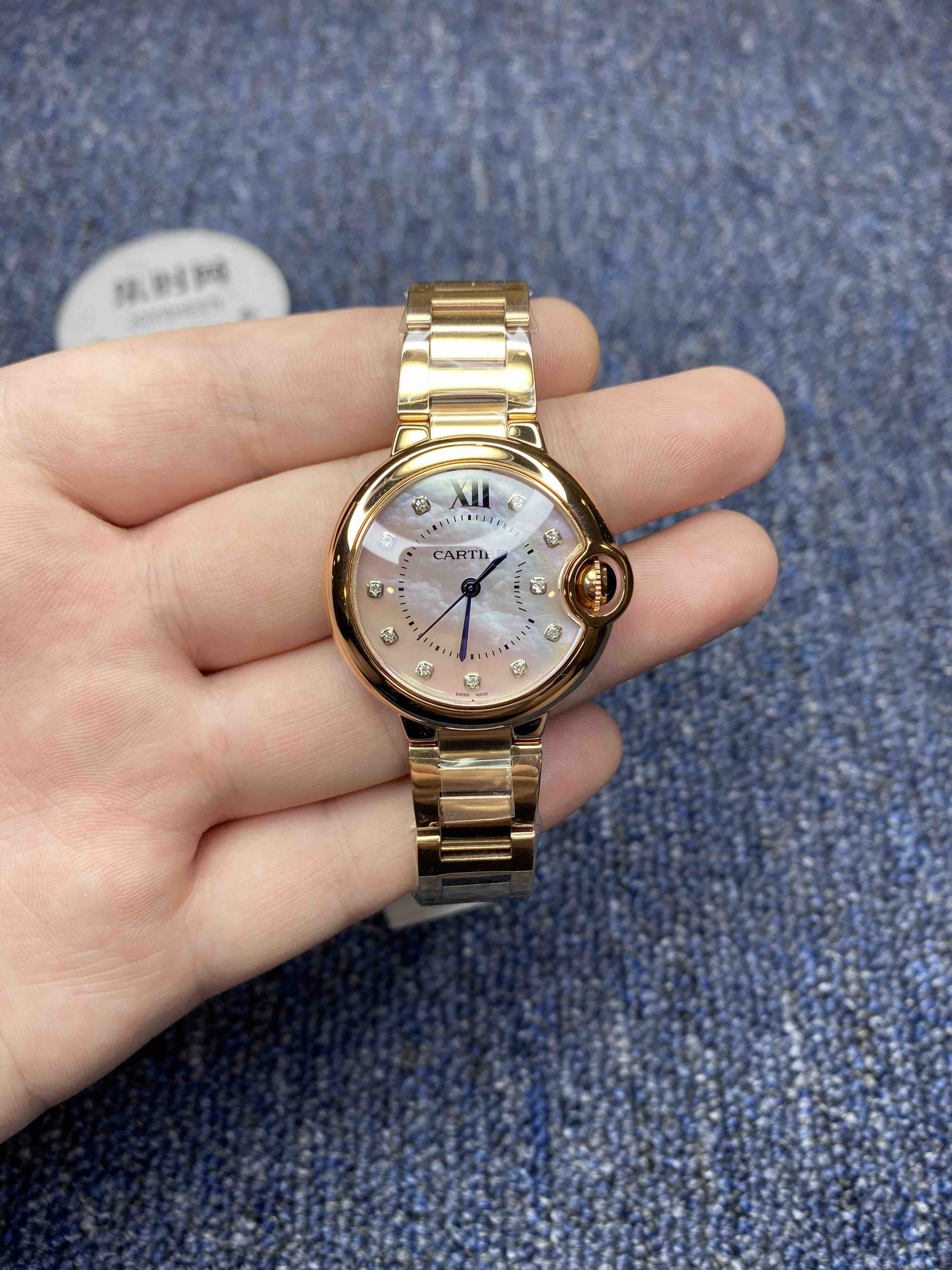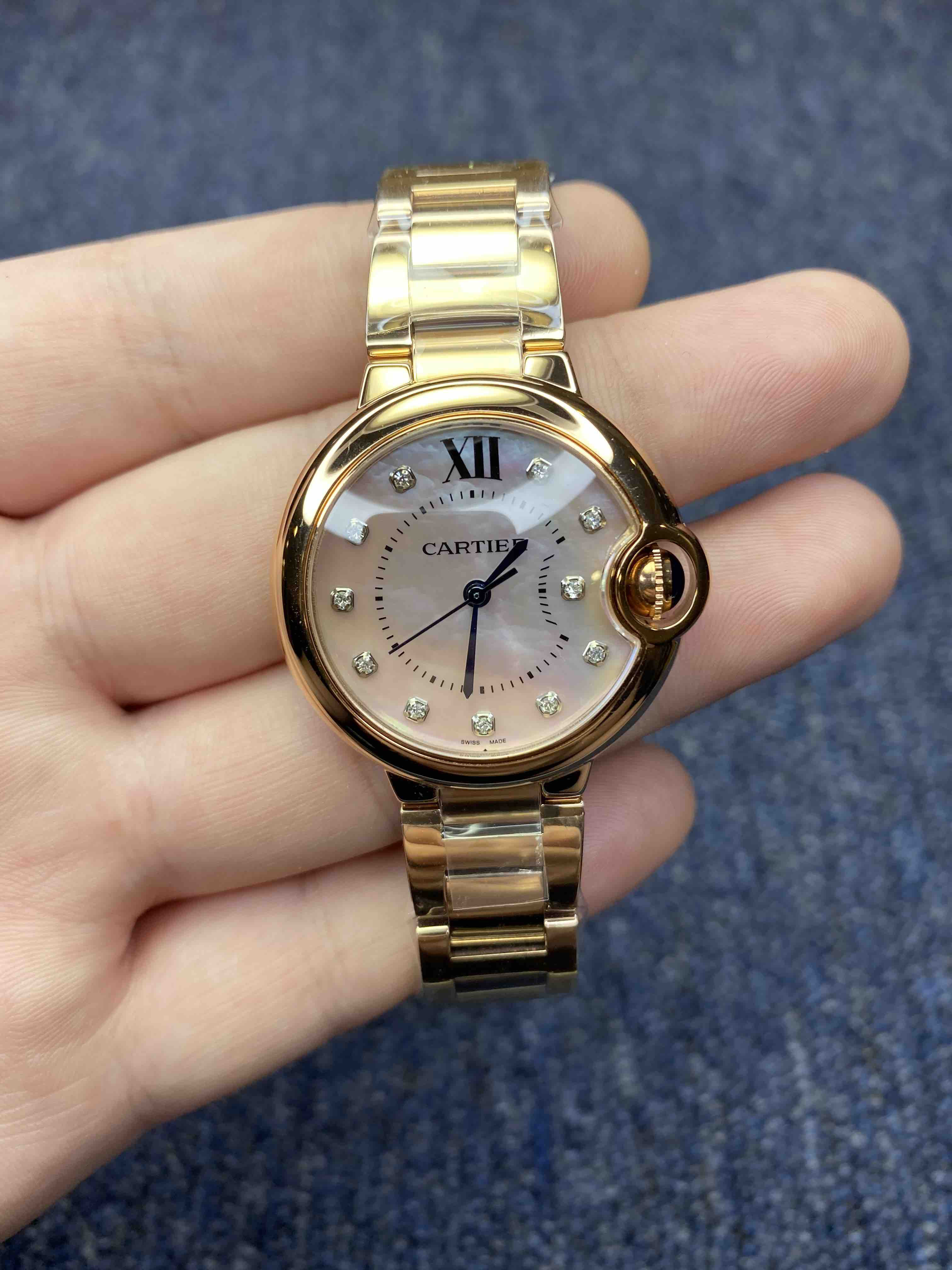 限时特价 卡地亚蓝气球系列高版本「全玫金款」贝母面 中号33mm女士腕表,蓝宝石镜面,瑞士石英机芯 316L精钢表带 认准du家品质