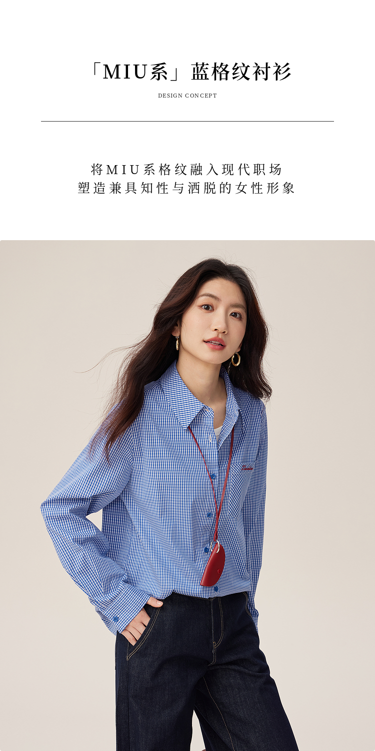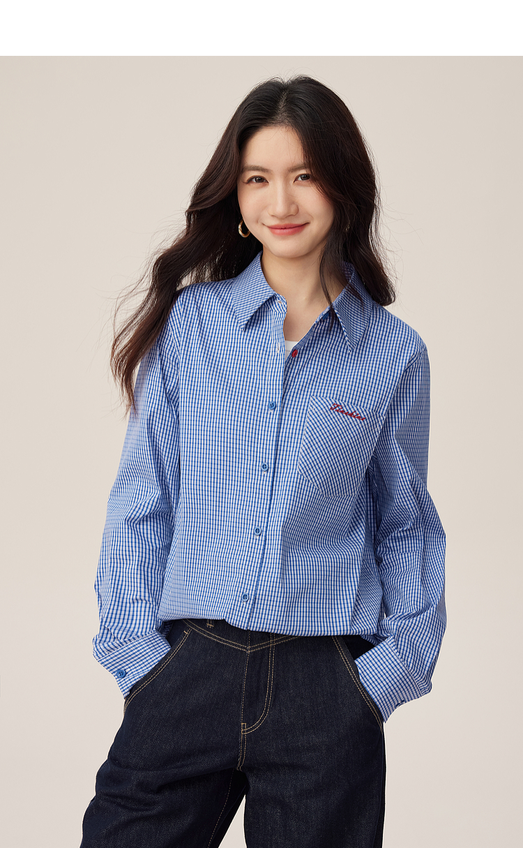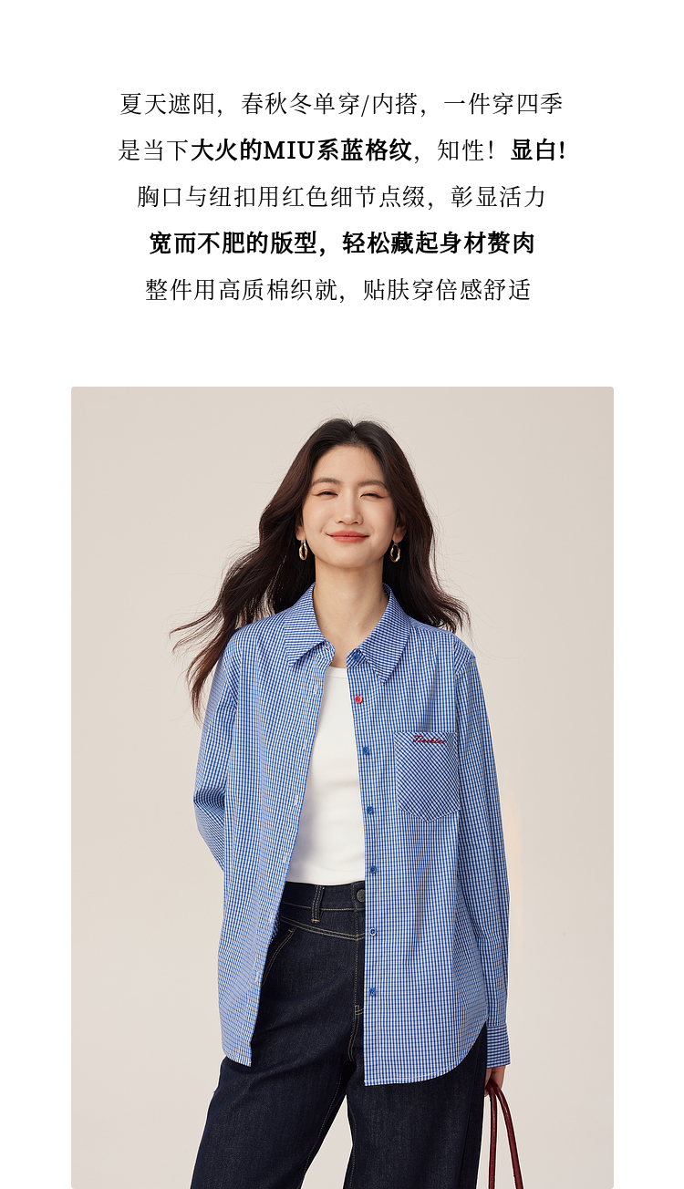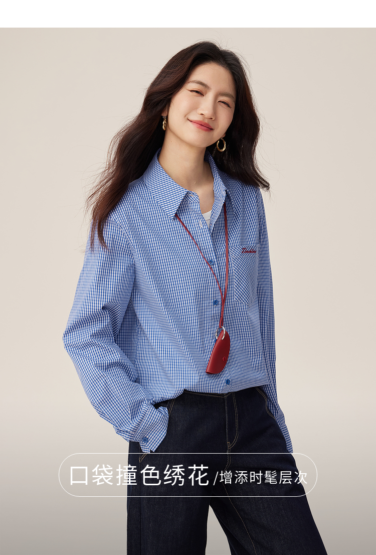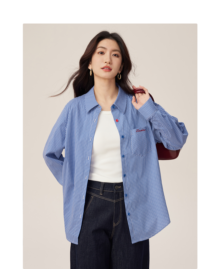 【09/03新品】熙世界MIU系复古蓝格子衬衫女秋季2025新款宽松显瘦刺绣长袖衬衣