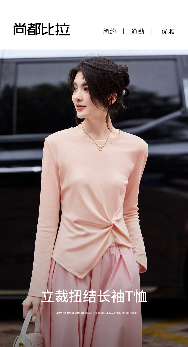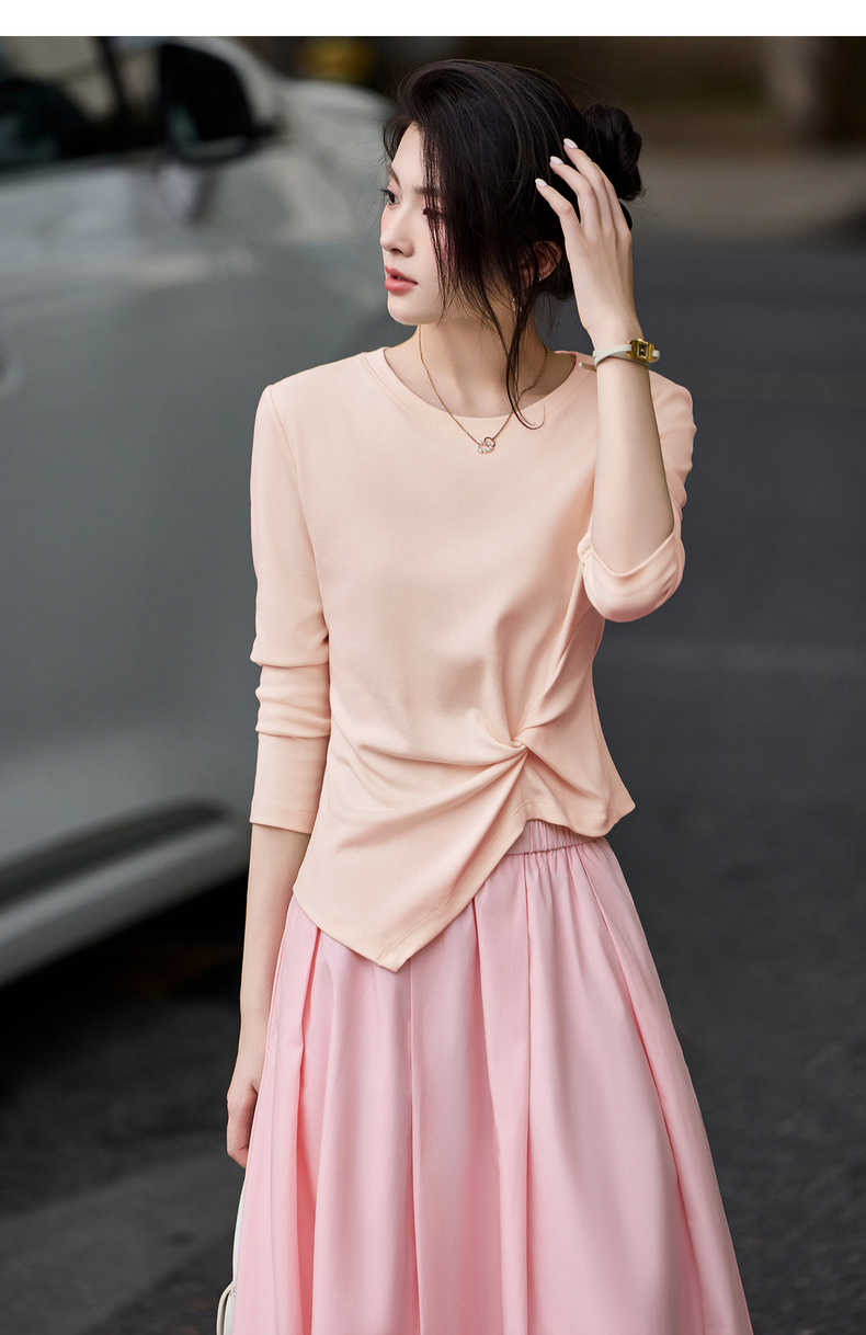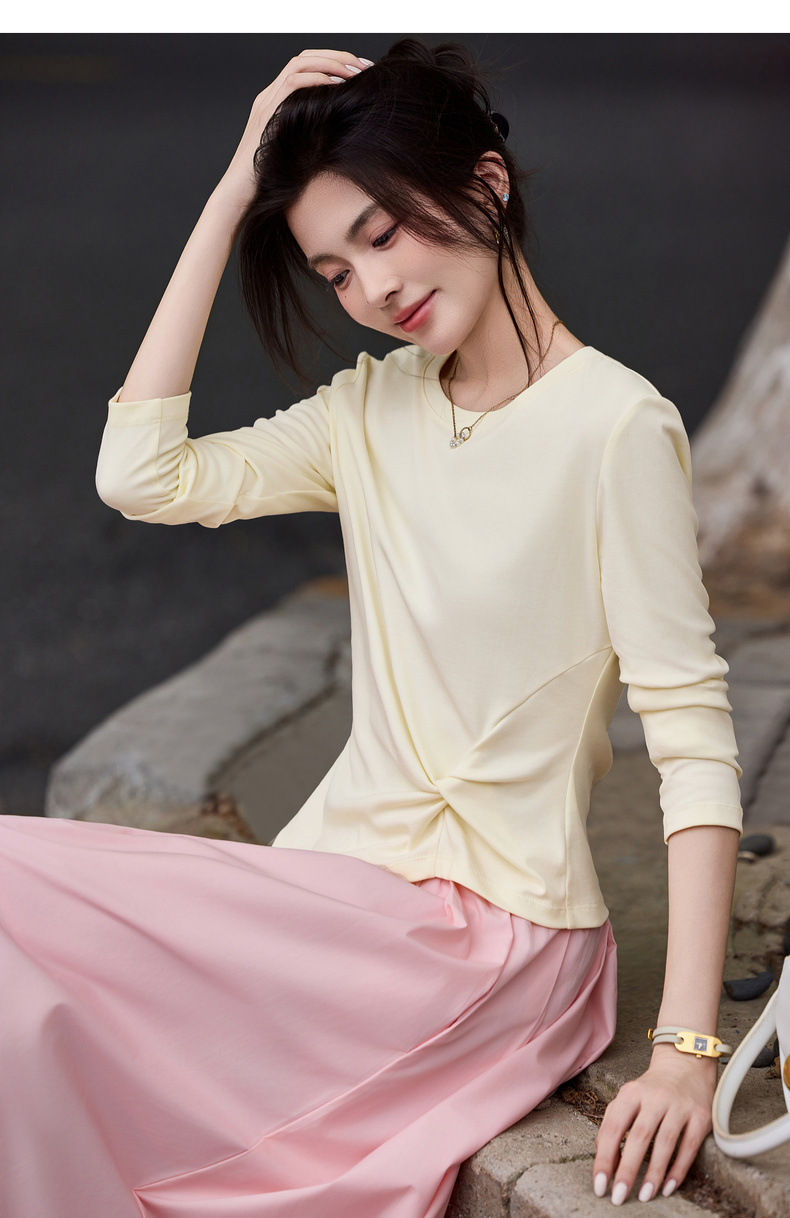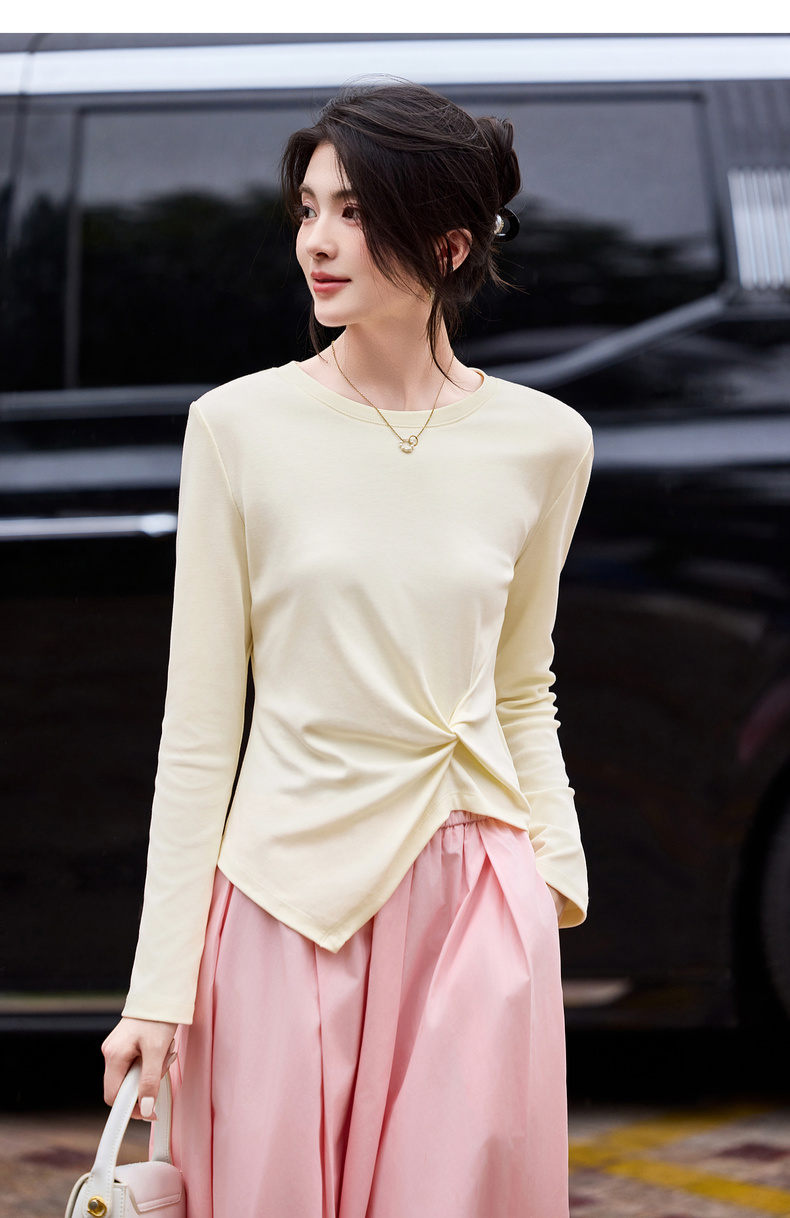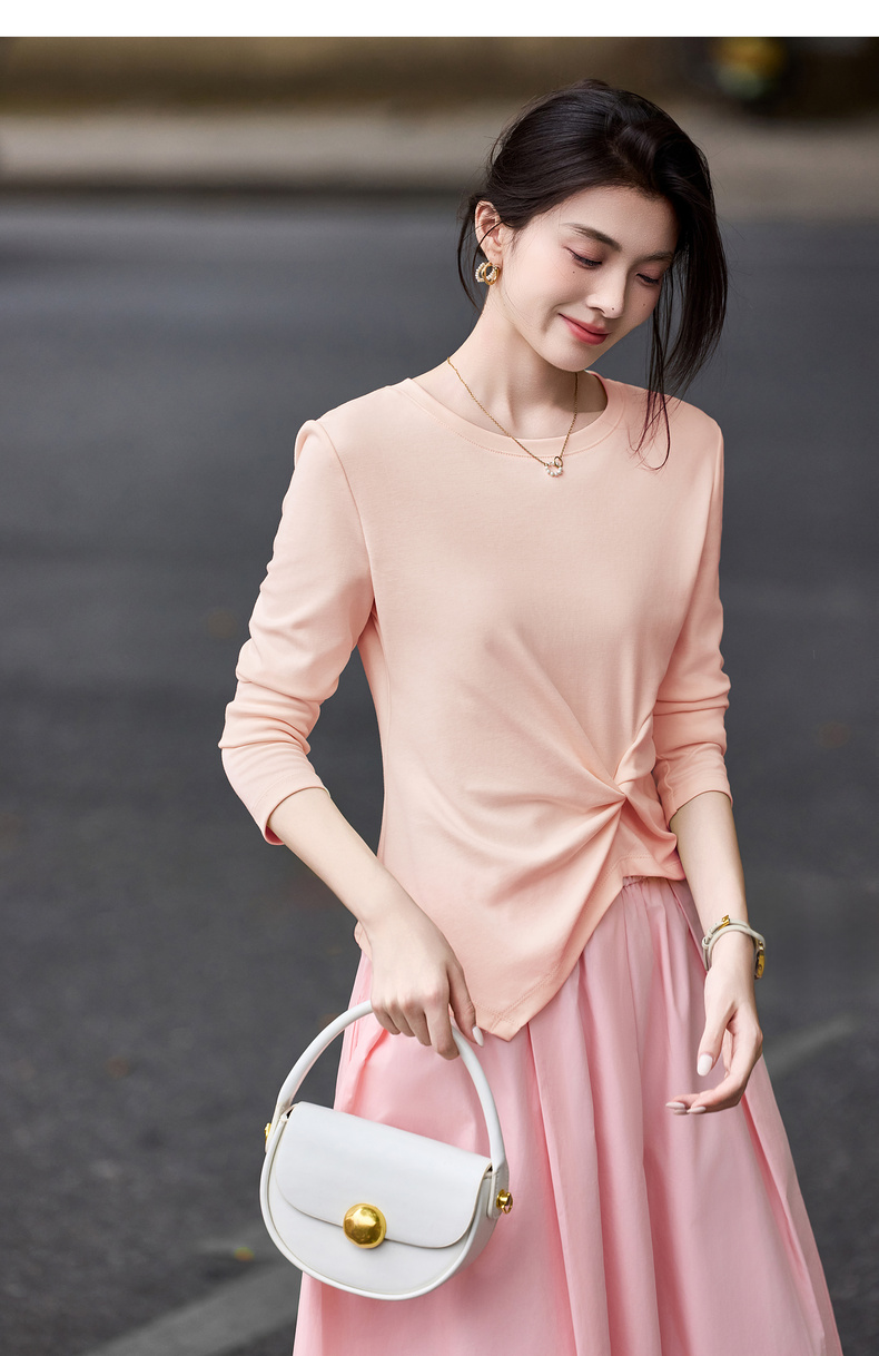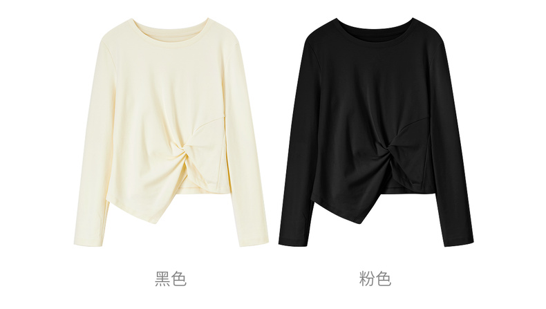 【内购】【立裁扭结】简约通勤圆领不规则下摆100%精纺棉长袖T恤-153TA2337